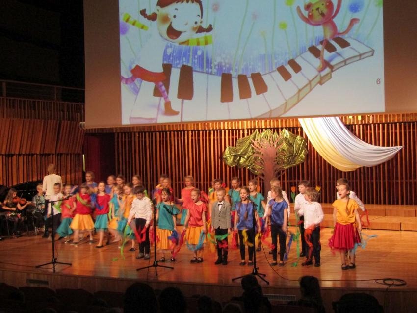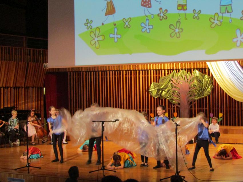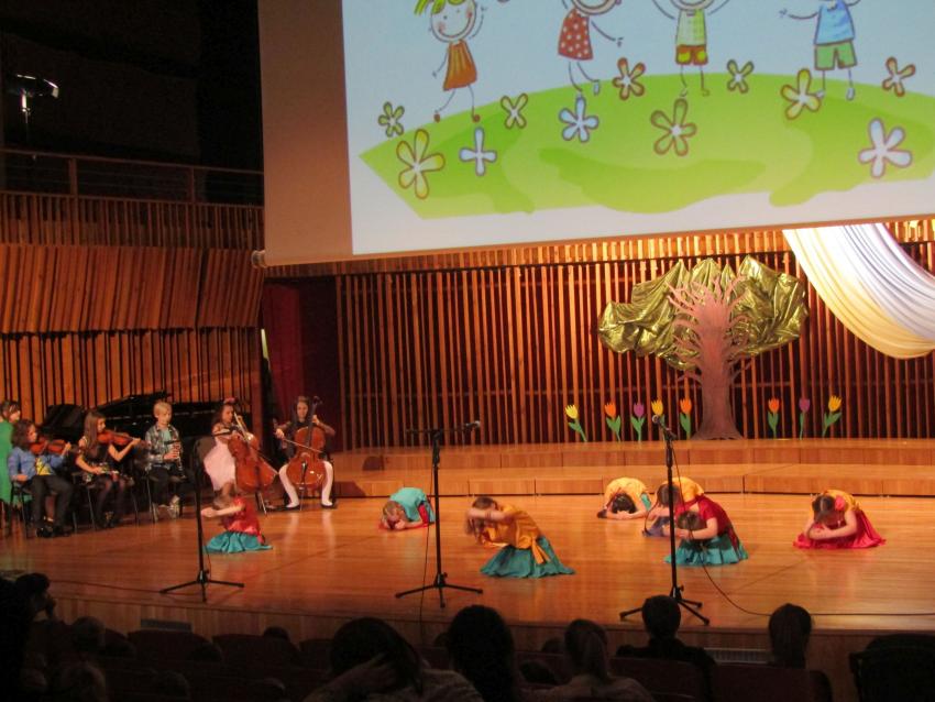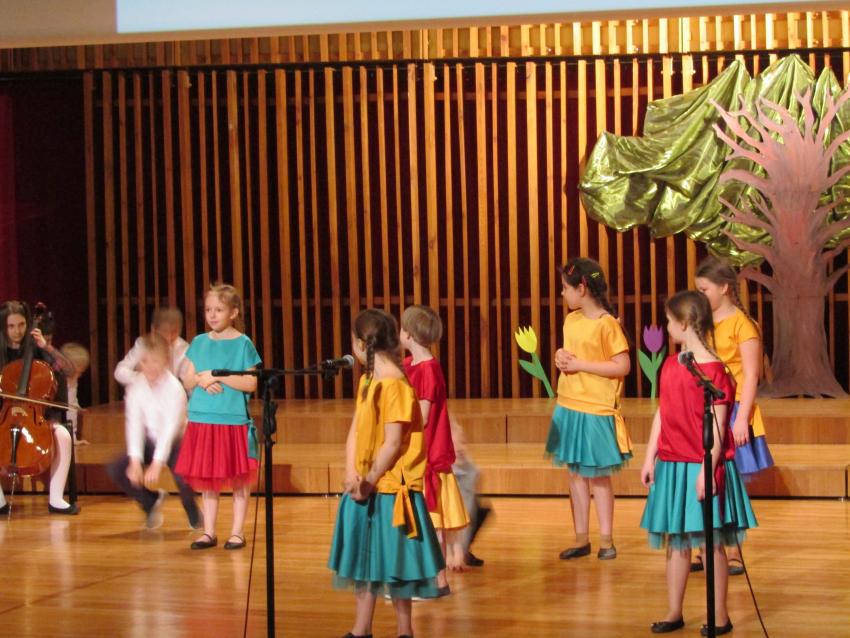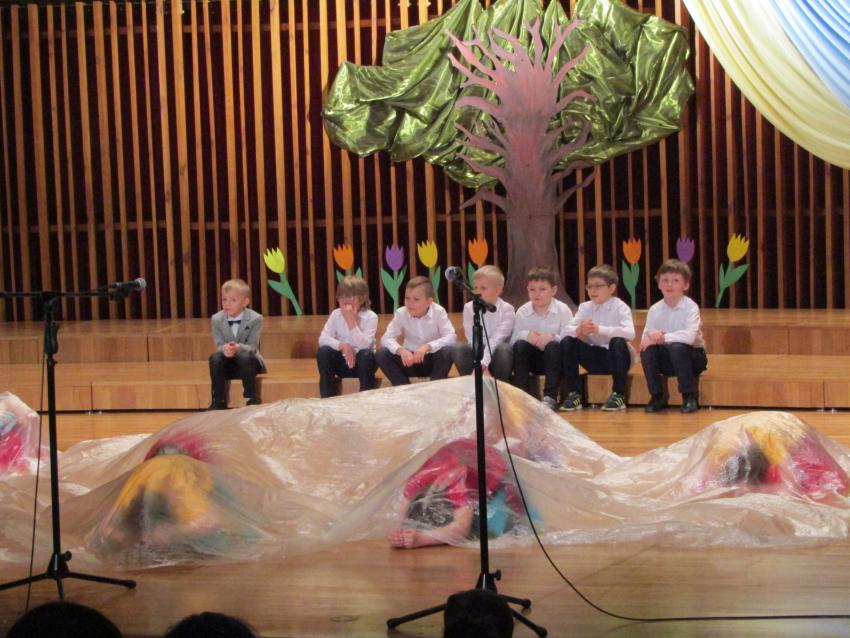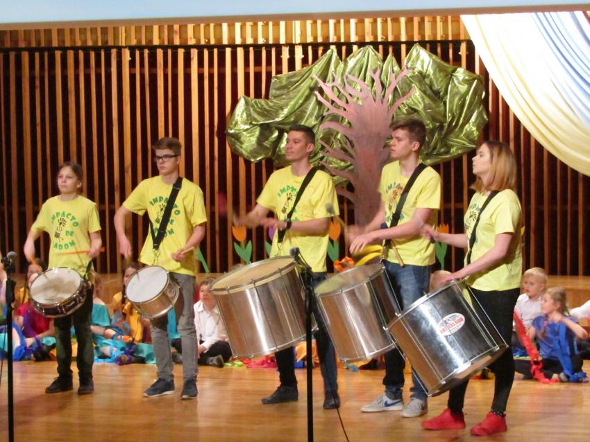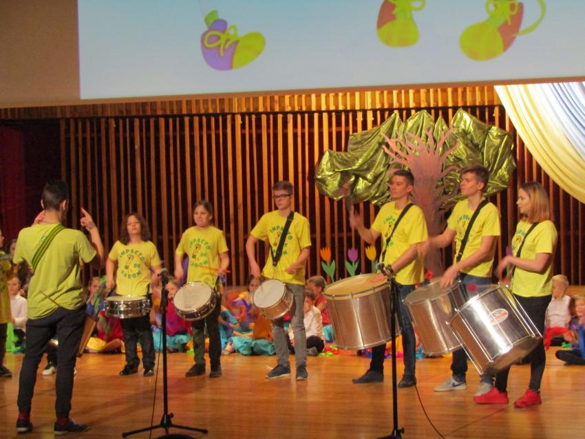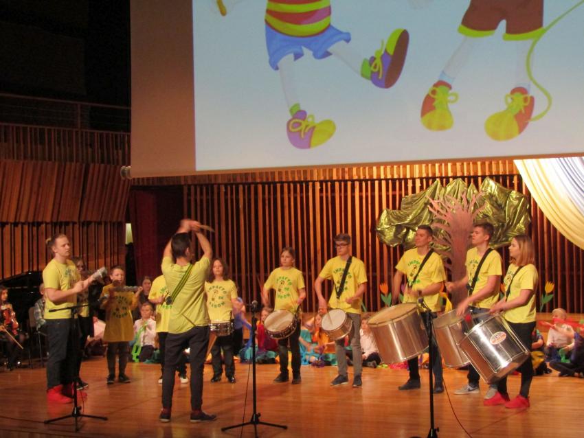 We wtorek w dniu 27 marca dzieci ze starszych grup uczestniczyły w koncercie muzycznym, przygotowanym przez uczniów i nauczycieli z Zespołu Szkół Muzycznych w Radomiu. Był to wspaniały popis tańca, śpiewu i gry na instrumentach w wykonaniu tak młodych artystów. Poprzez muzykę i ruch , opowiedzieli nam oni o kolorowej, pachnącej wiośnie, która przyniosła ze sobą spiew ptaków, kolorowe kwiaty i wiosenny deszczyk. Bardzo podobał nam się ten występ. Największą niespodzianką dla dzieci był popis gry na bębnach w wykonaniu sekcji dętej. Młodzi muzycy rozgrzali swoją grą zgromadzoną na sali publiczność. Nasze dzieci bardzo żywo i spontanicznie reagowały na rytmy wygrywane na bębnach. Podskoki, głośne oklaski i uśmiech na twarzy świadczyły o dobrej zabawie podczas koncertu. Czekamy z niecierpliwością na kolejny...