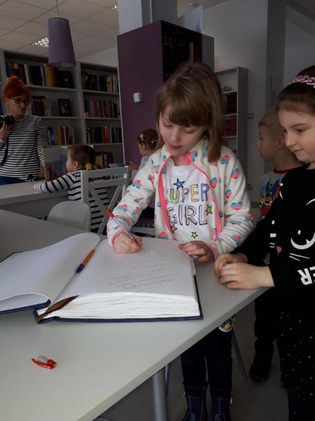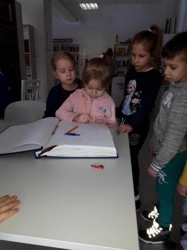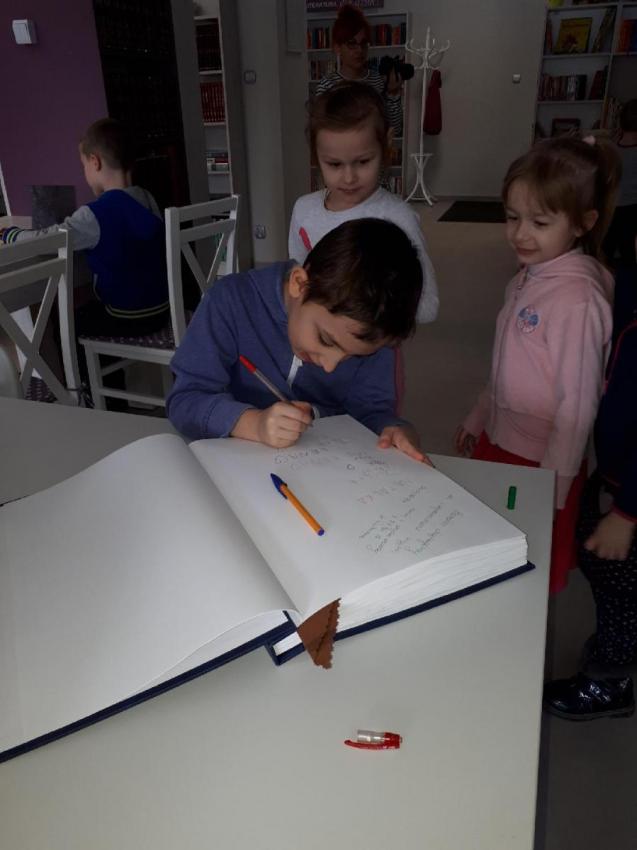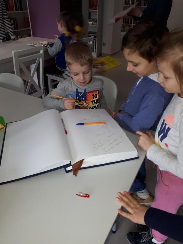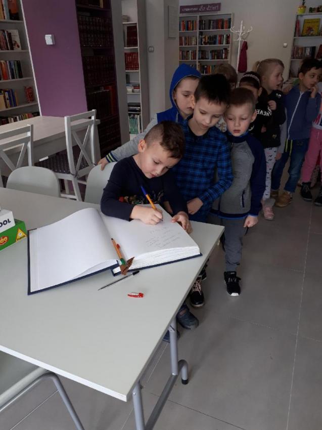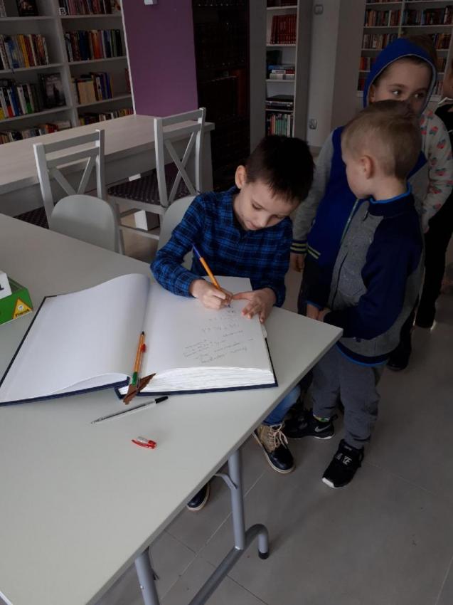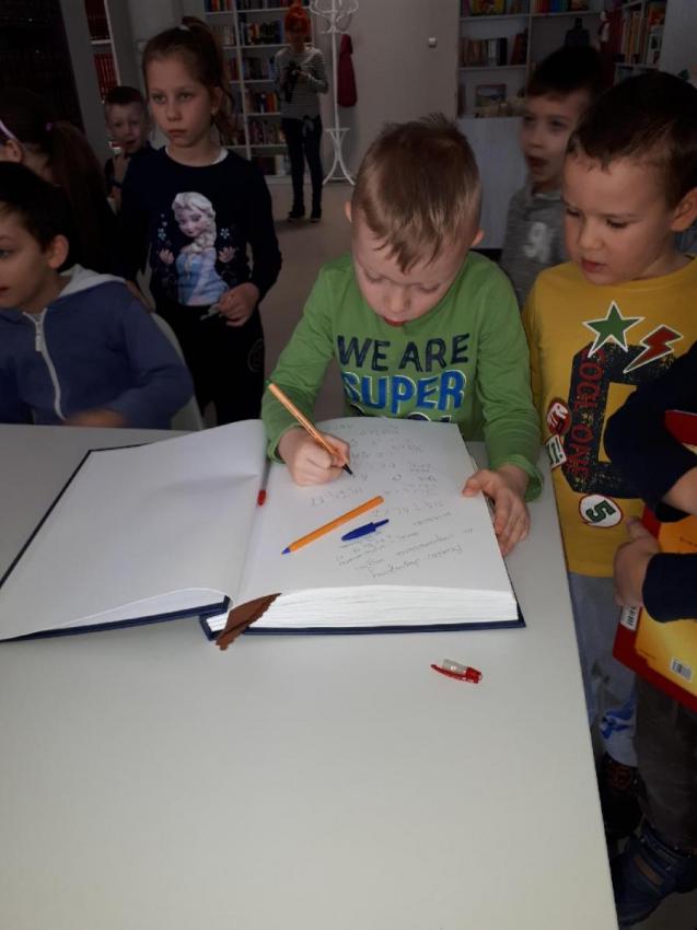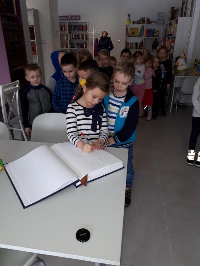 W dniu 23.03.2018 r dzieci udały się na wycieczkę do biblioteki mieszczącej się przy ulicy Zientarskiego 1A. Wszyscy spotkaliśmy się z ciepłym i życzliwym powitaniem. Przedszkolaki z wielką radością zapoznały się z magicznym dla nich miejscem. Pani z biblioteki wyjaśniła w jaki sposób mogą dzieci wypożyczać książki, i w jaki sposób możemy odnaleźć je na półce. Dla zdecydowanej większości była to pierwsza wizyta wśród wielkiego księgozbioru. Wizyta przedszkolaków w bibliotece urozmaicona była dodatkowo czytanymi przez panie fragmentami książek. Dzieci wpisały się do księgi pamiątkowej biblioteki. Na zakończenie dzieci zostały obdarowane licznymi prezentami i złożyły obietnicę, że niedługo wrócą do biblioteki tzw. krainy książek .