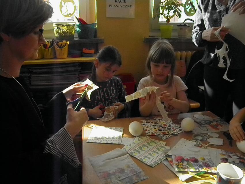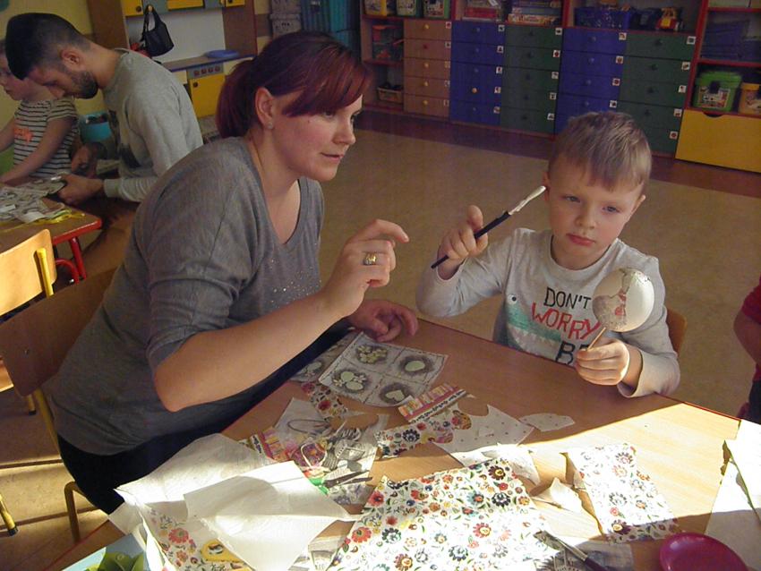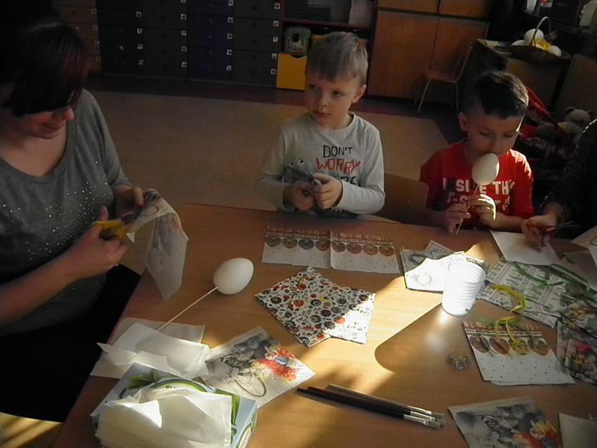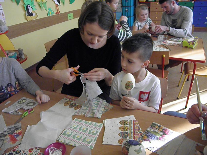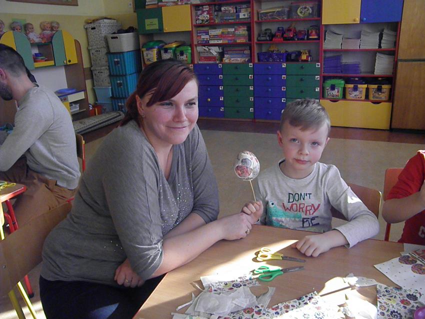 Dzieci wraz z rodzicami i babciami wspólnie ozdabiali jajka styropianowe techniką decoupage. Było dużo radości i zabawy. Podczas zajęć towarzyszyła nam pani dyrektor Anna Belowska. Dziękujemy rodzicom i babcią za wspólną zabawę.