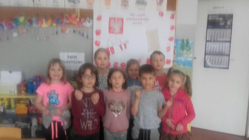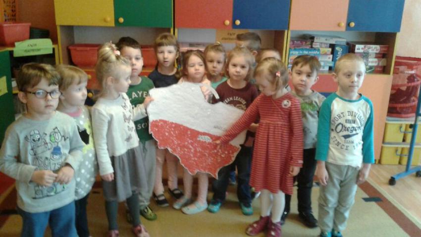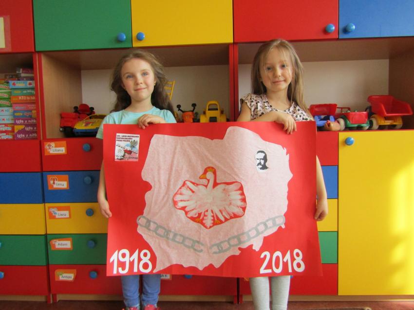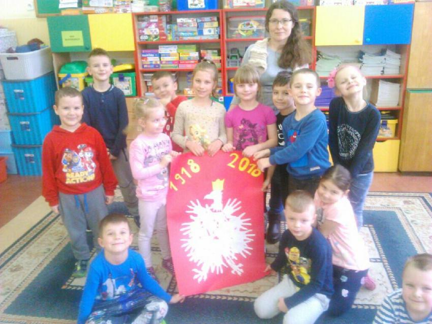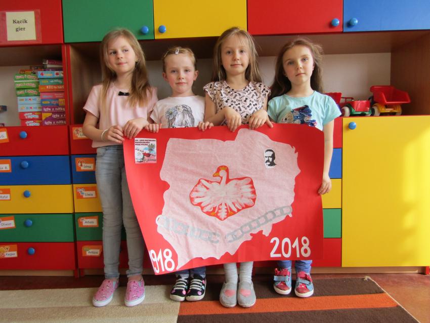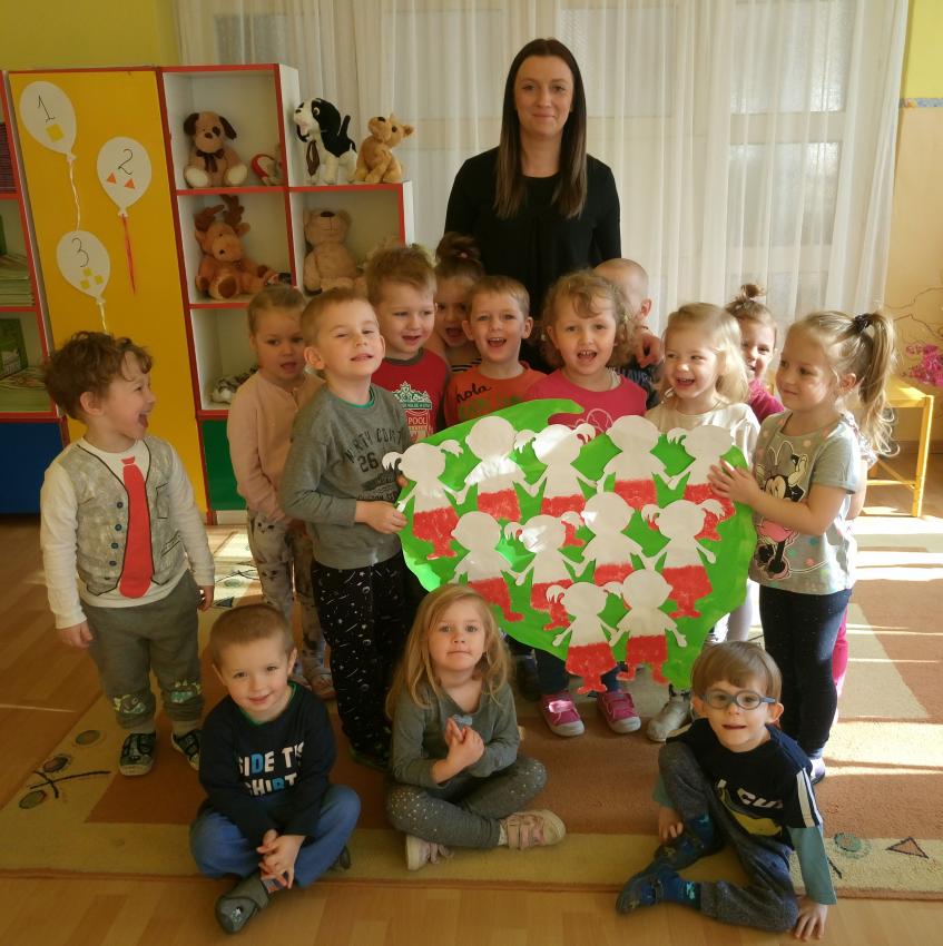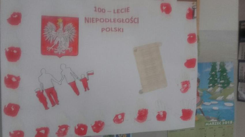 W miesiącu marcu we wszystkich oddziałach przedszkolnych zostały przeprowadzone zajęcia dotyczące tematyki patriotycznej i niepodległości. Dzieci z całego przedszkola, zostały wprowadzone w tematykę odzyskania przez Polskę niepodległości w 1918r. Wspólnie odśpiewano Hymn Polski, zachowując w trakcie odpowiednią postawę, zapoznano dzieci z postacią Józefa Piłsudskiego. Przedszkolaki wykonały także pracę plastyczną po tytułem: „100 rocznica odzyskania przez Polskę Niepodległości” różnymi technikami między innymi: odbijanie rączek maczanych w białej i czerwonej farbie na mapie Polski, odbijanie paluszków w białej i czerwonej farbie na mapie Polski, wydzieranie białych i czerwonych kawałków papieru kolorowego i wypełnianie nimi środka mapy Polski z zaznaczeniem stolicy Polski – Warszawy i miasta z jakiego pochodzimy, wykorzystanie małych i dużych kółek do godła Polski – metodą orgiami oraz stworzenie godła Polski z wyciętych z białego papieru dłoni dzieci.