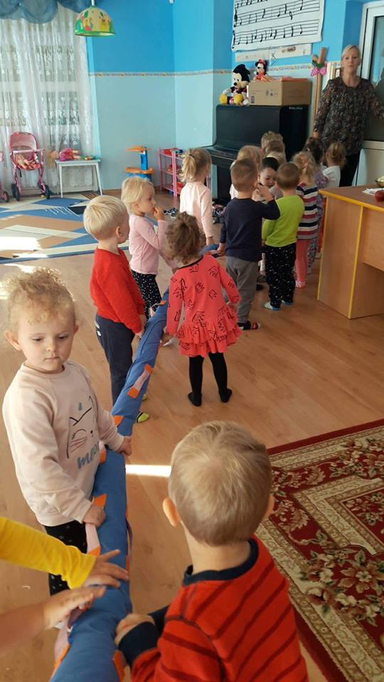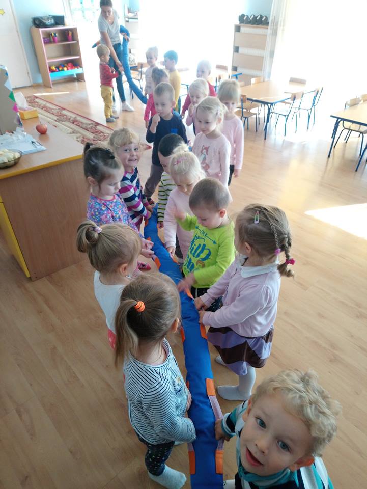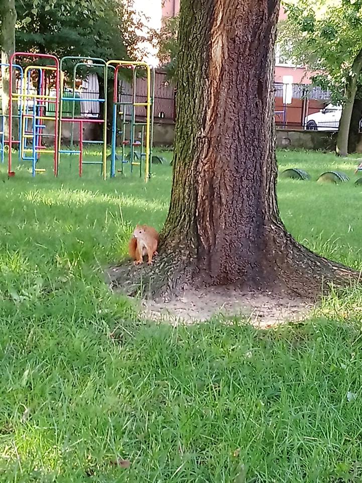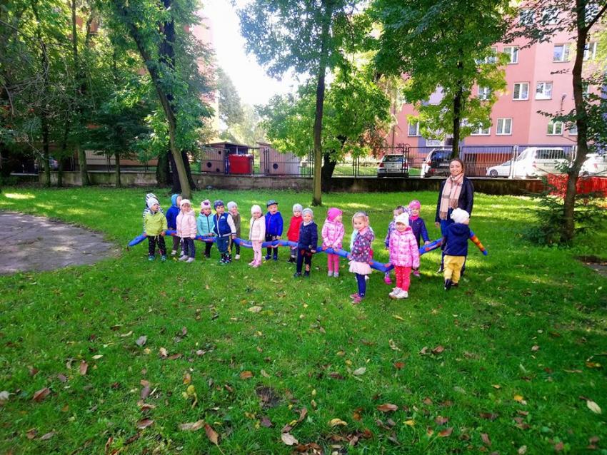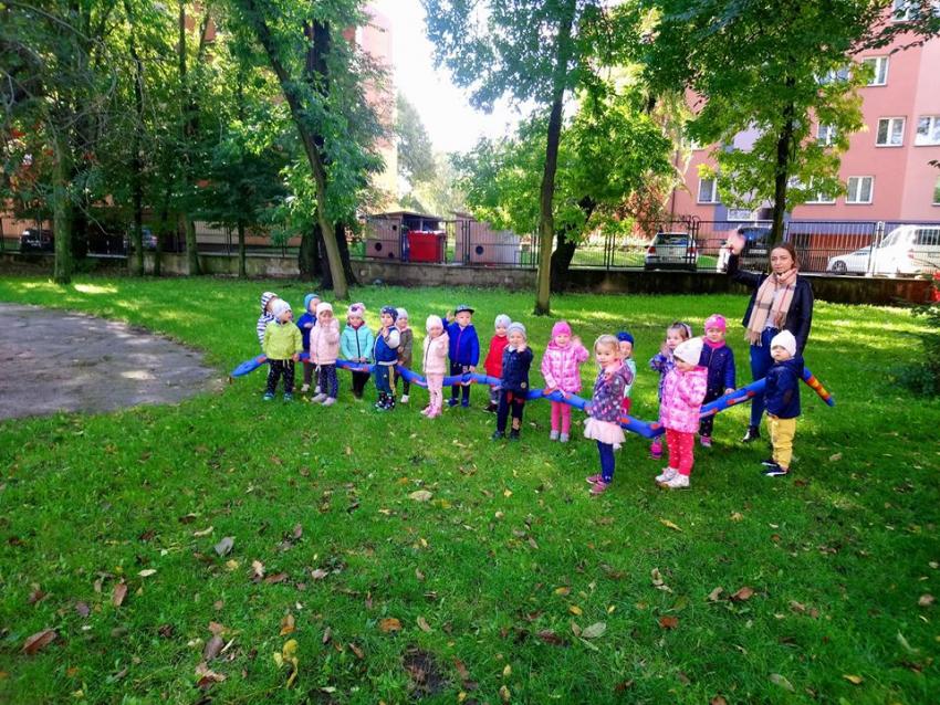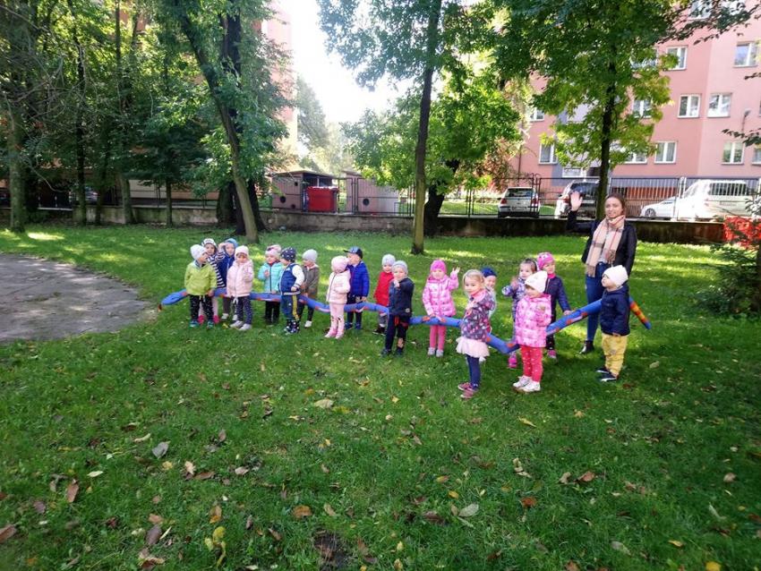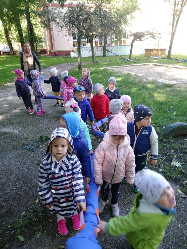 Nasz pierwszy spacer do ogrodu przedszkolnego. Już w sali zapoznaliśmy się z przyjaznym wężem, który będzie z nami spacerował. A podczas spaceru spotkaliśmy mieszkankę naszego ogrodu- wiewiórkę Basię. Chętnie wzięła od nas prezent- orzeszka.