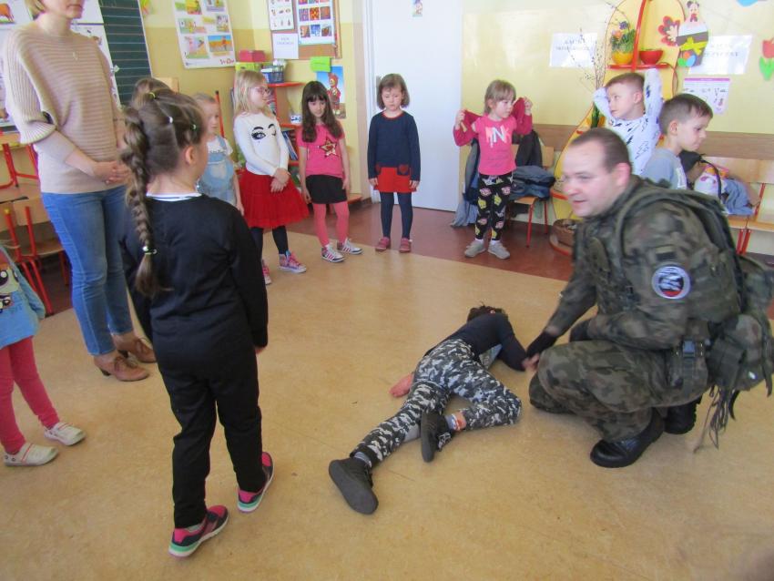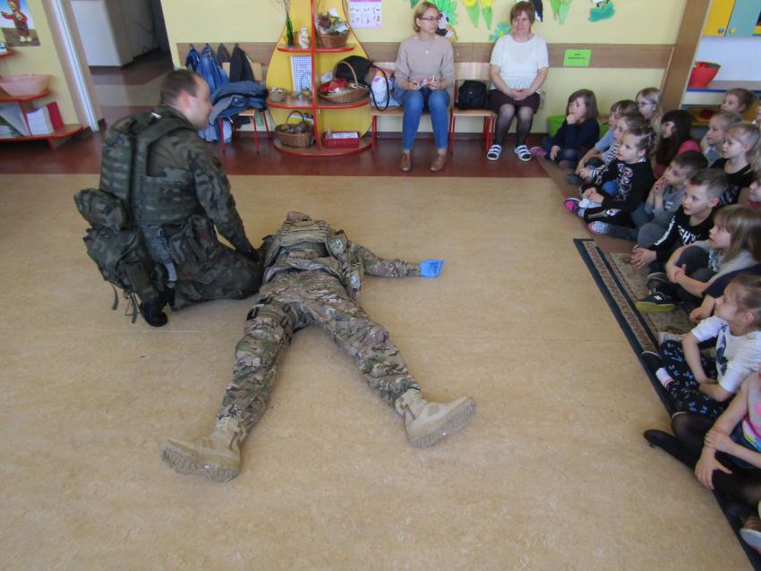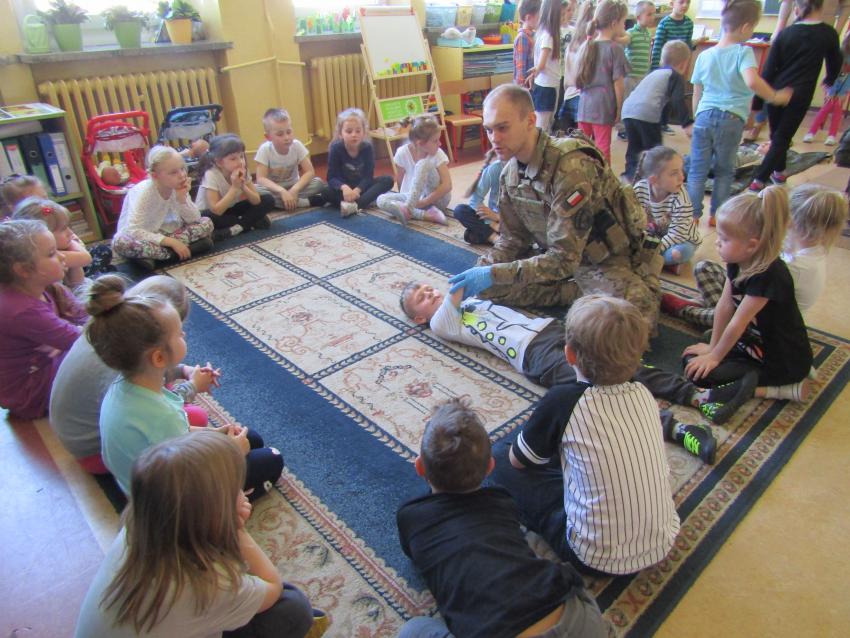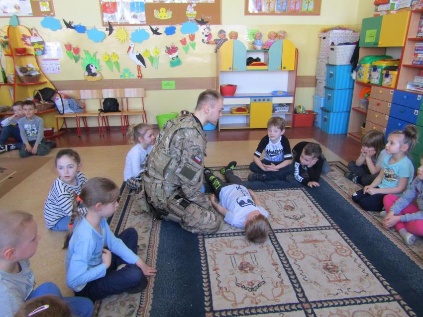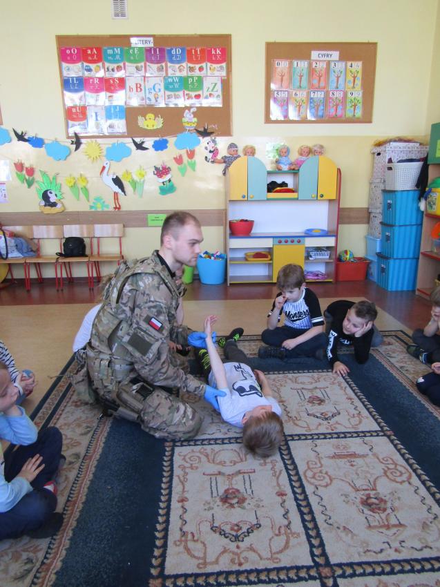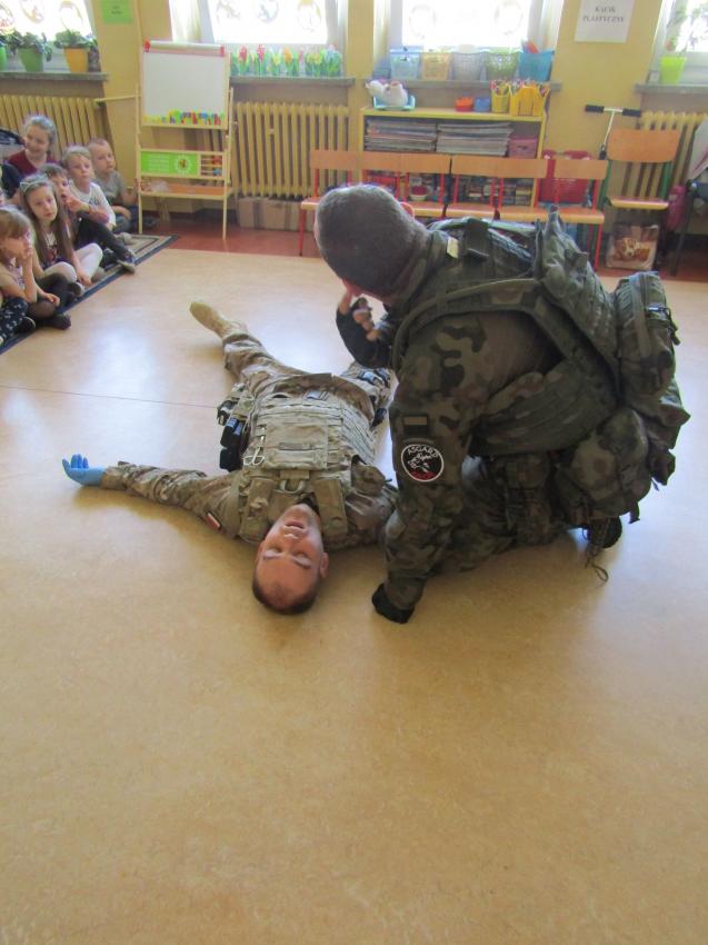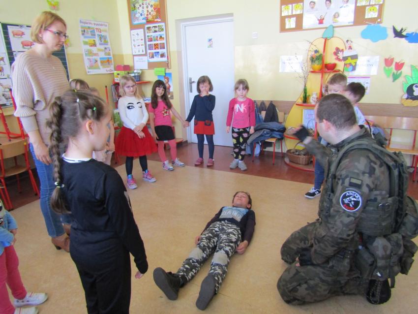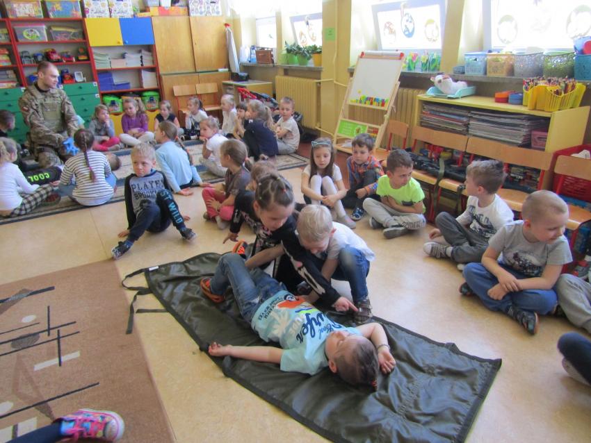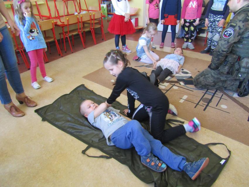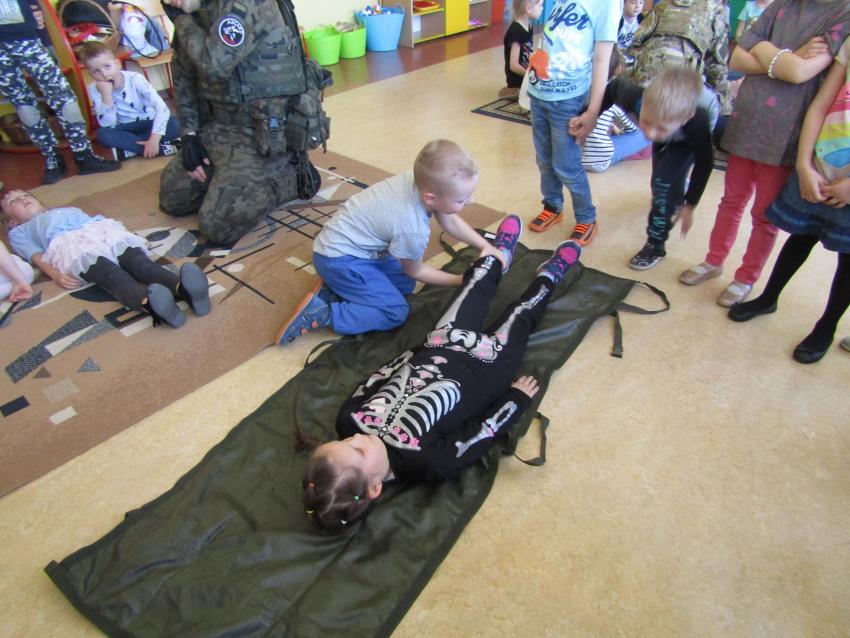 Wszystkie grupy przedszkolne uczestniczyły w pokazie przygotowanym przez panów ze stowarzyszenia ASGARD Radom na temat udzielania pierszej pomocy. Uczyliśmy się wielu potrzebnych rzeczy. Okazało się, że nawet małe dzieci mogą udzielić pomocy w razie konieczności swoim najbliższym. Muszą tylko wiedzieć, jak to zrobić. I właśnie w takiej lekcji uczestniczyliśmy. Odgrywaliśmy scenki rozmowy telefonicznej z pogotowiem. Sprawdzaliśmy stan poszkodowanego. Liczyliśmy ilośc wdechów i ucisków. Układaliśmy siebie nawzajem w pozycji bocznej ustalonej. A na koniec oglądaliśmy i dotykaliśmy wyposażenie wojskowe. To było bardzo cenne i pouczające spotkanie. Dziękujemy panom!