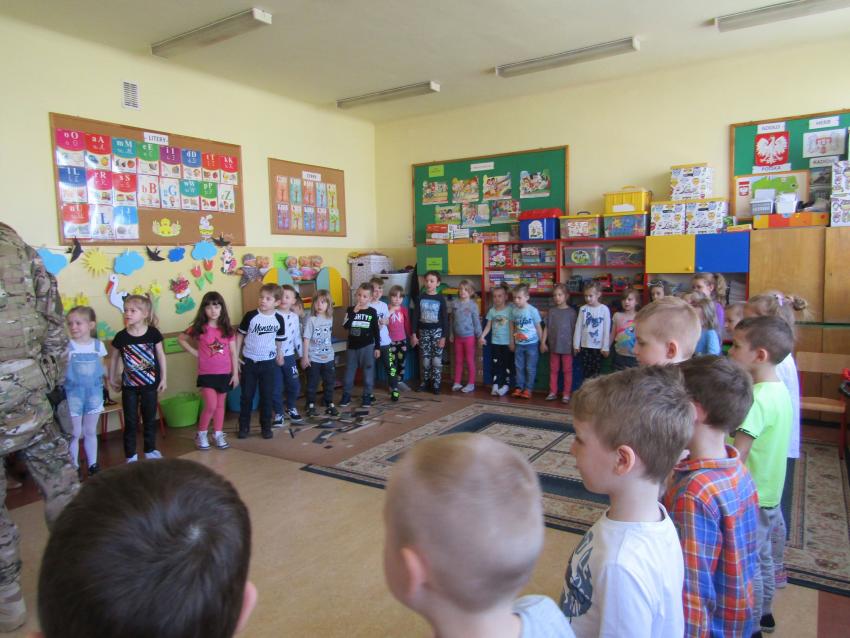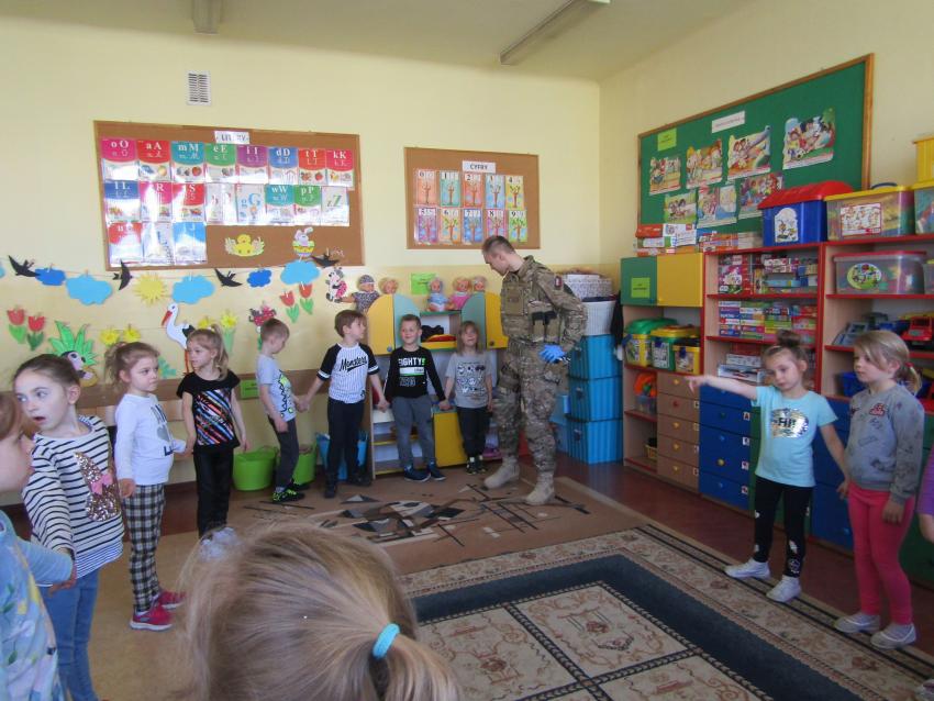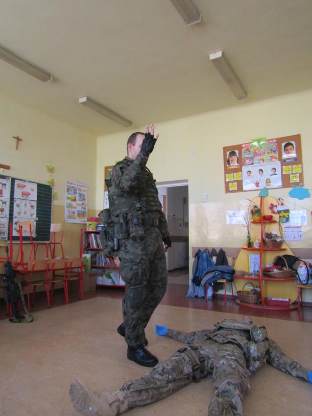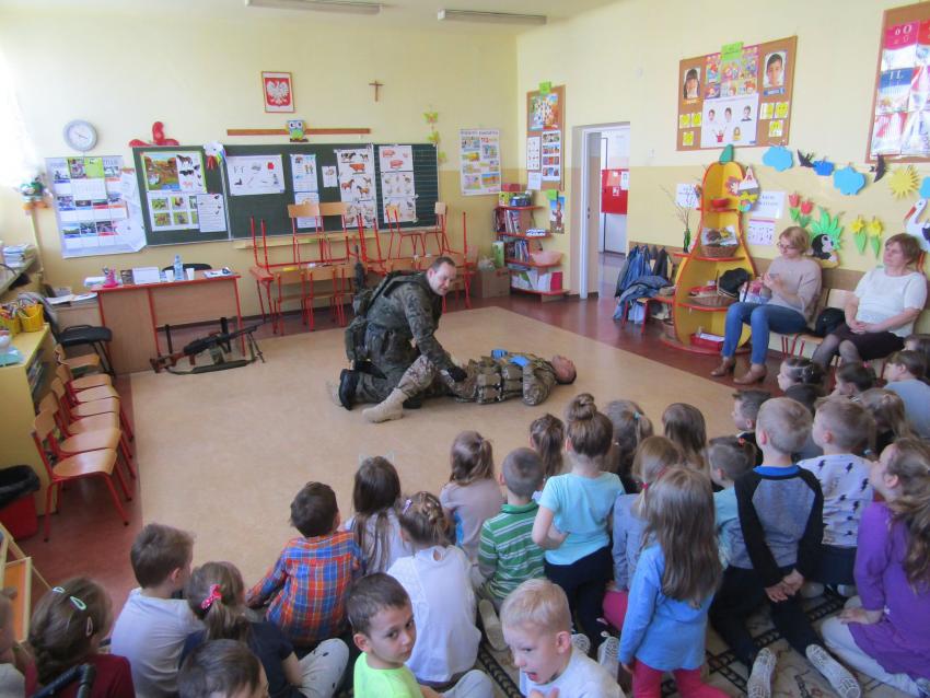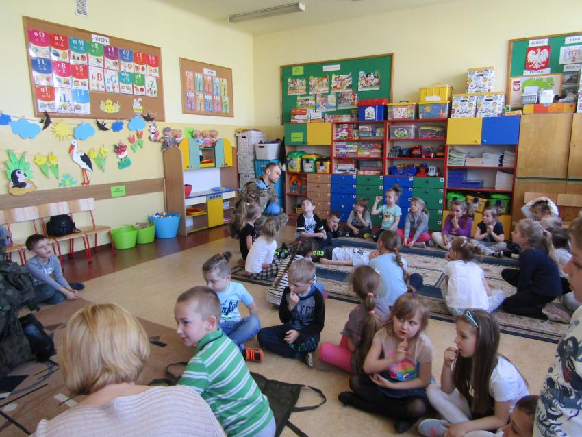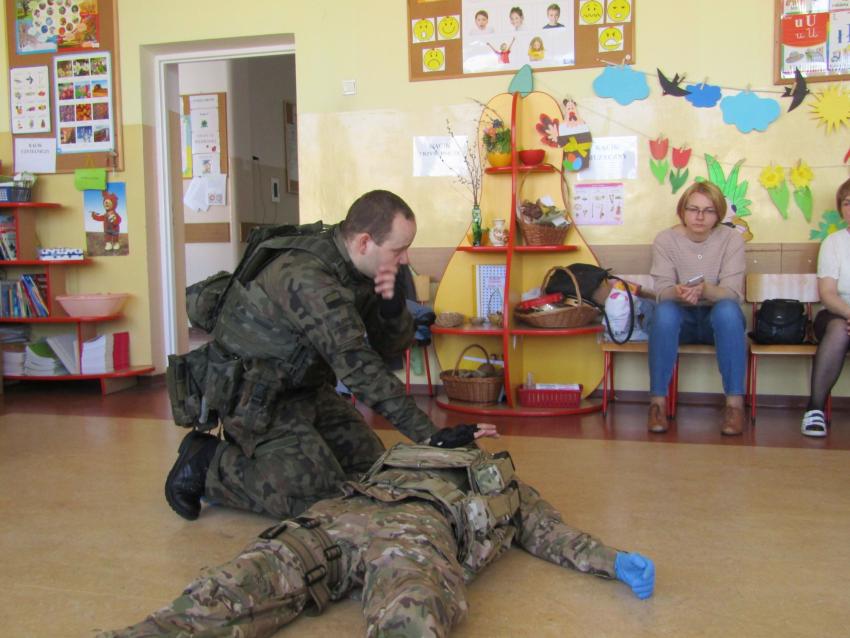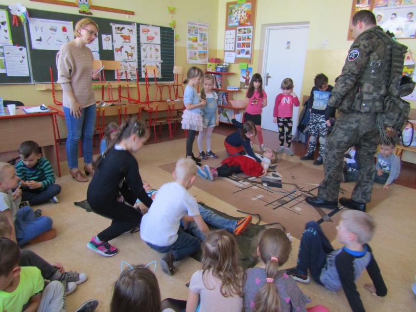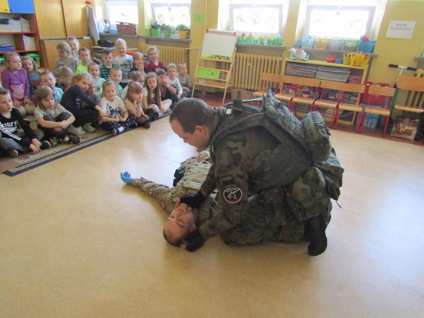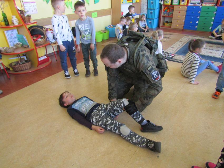 Wszystkie grupy przedszkolne uczestniczyły w pokazie przygotowanym przez panów ze stowarzyszenia ASGARD Radom na temat udzielania pierszej pomocy. Uczyliśmy się wielu potrzebnych rzeczy. Okazało się, że nawet małe dzieci mogą udzielić pomocy w razie konieczności swoim najbliższym. Muszą tylko wiedzieć, jak to zrobić. I właśnie w takiej lekcji uczestniczyliśmy. Odgrywaliśmy scenki rozmowy telefonicznej z pogotowiem. Sprawdzaliśmy stan poszkodowanego. Liczyliśmy ilośc wdechów i ucisków. Układaliśmy siebie nawzajem w pozycji bocznej ustalonej. A na koniec oglądaliśmy i dotykaliśmy wyposażenie wojskowe. To było bardzo cenne i pouczające spotkanie. Dziękujemy panom!