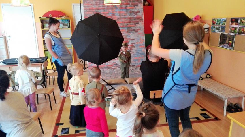 26 września w naszym przedszkolu odbyła się prelekcja pod tytułem "POLSKA - MOJA OJCZYZNA". Dzieciom zostały przypomniane symbole narodowe. Po spotkaniu była sesja zdjęciowa, chłopcy przebrani za żołnierzy, a dziewczynki za sanitariuszki.
