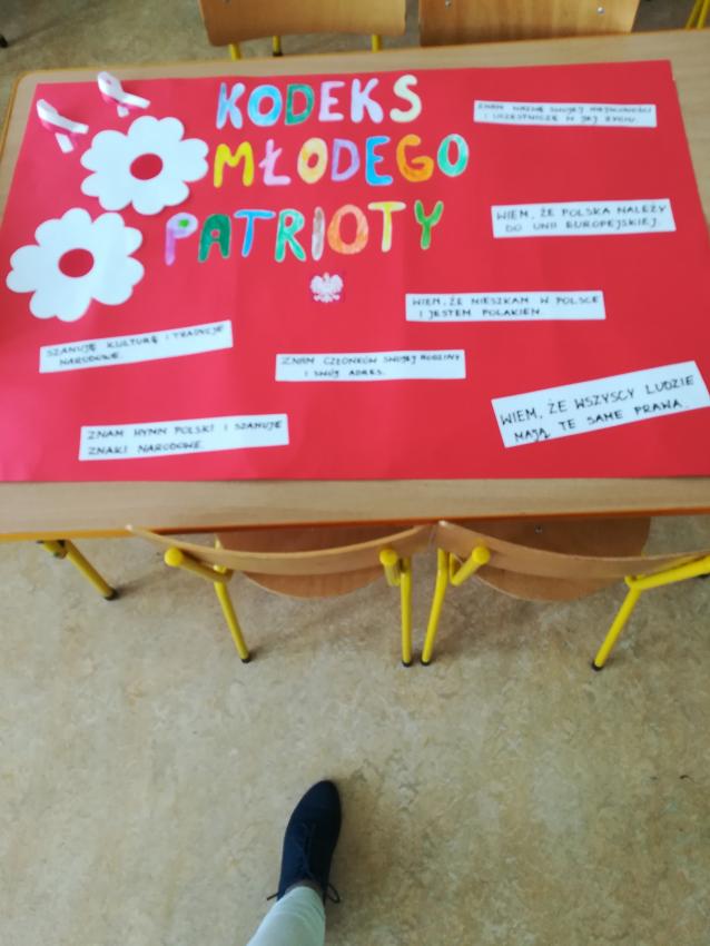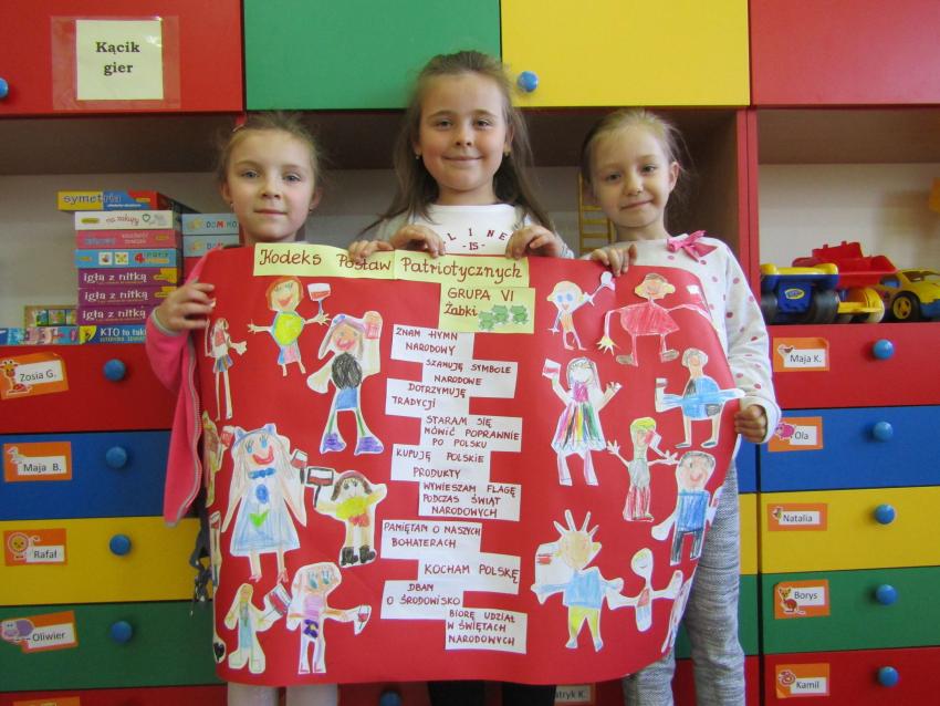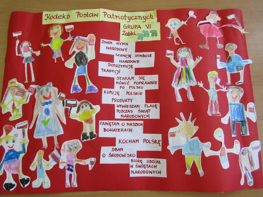 W ramach Ogólnopolskiego Konkursu "Przedszkole Młodych Patriotów " III edycja - każda z grup miała za zadanie przygotować własny Kodeks Postaw Patriotycznych. Dzieci zgłaszały swoje pomysły, które zapisywalismy na kartkach i wspólnie stworzyliśmy plakat. Prezentujemy prace grupy VI i VII.