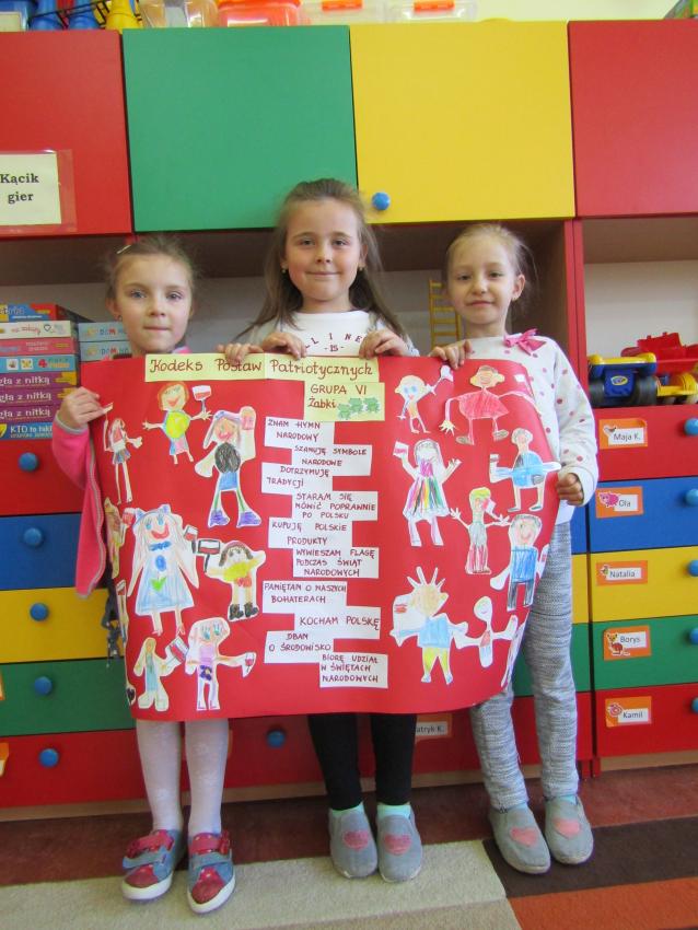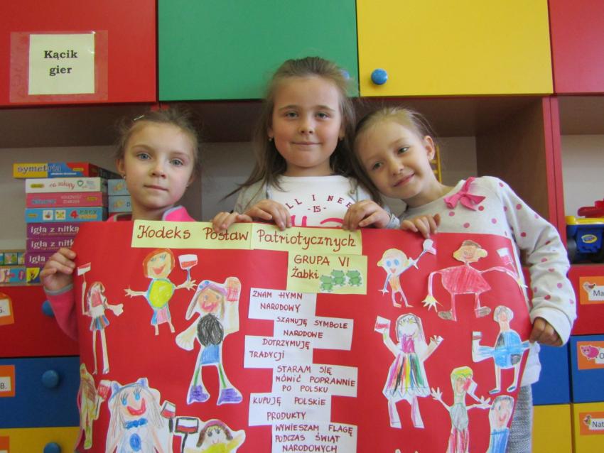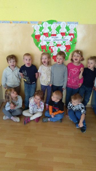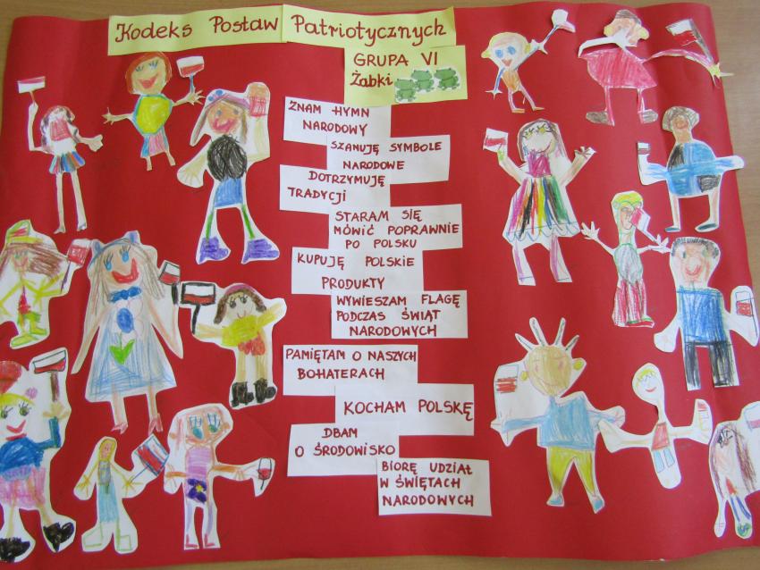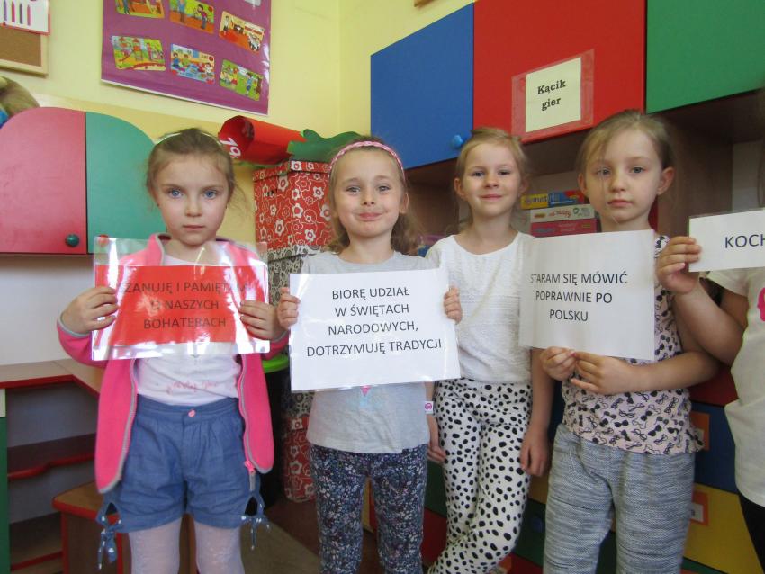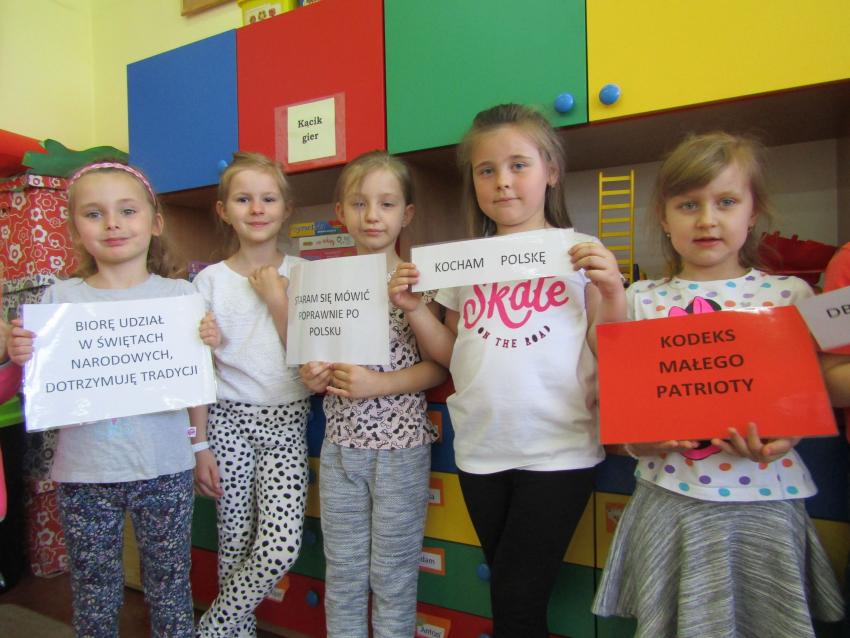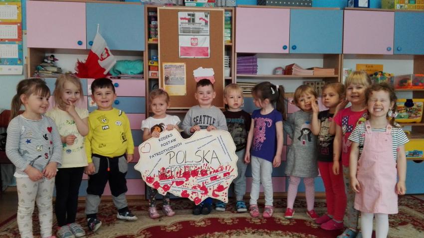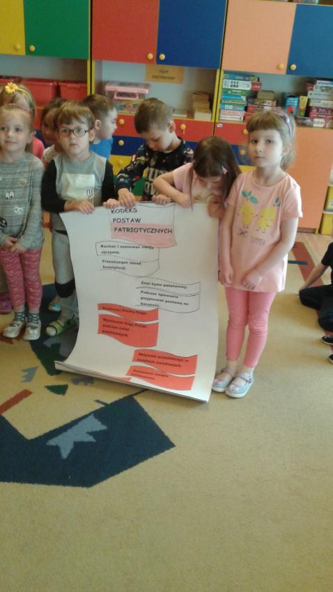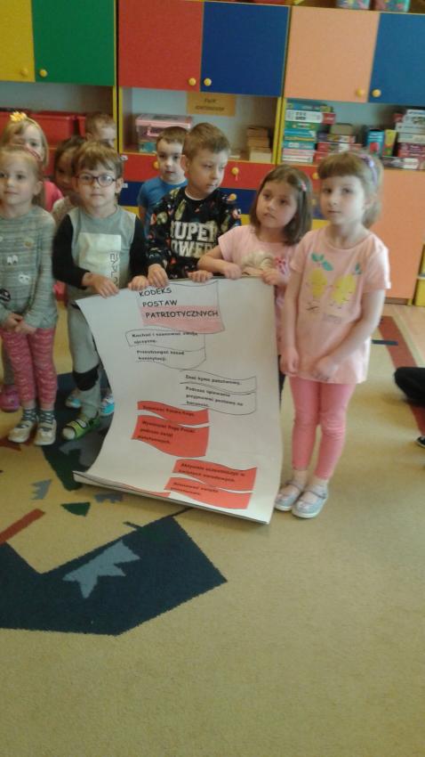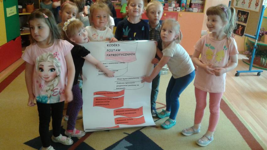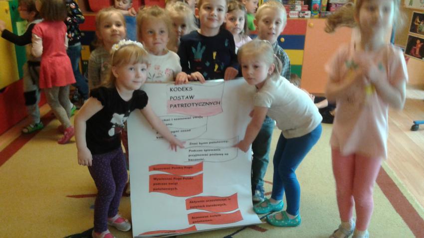 W kwietniu dzieci ze wszystkich grup przedszkolnych zaangażowane były w tworzenie Kodeksu Postaw Patriotycznych, co jest jednym z punktów Ogólnopolskiego Konkursu Patriotycznego „Przedszkole młodych patriotów III edycja”.
