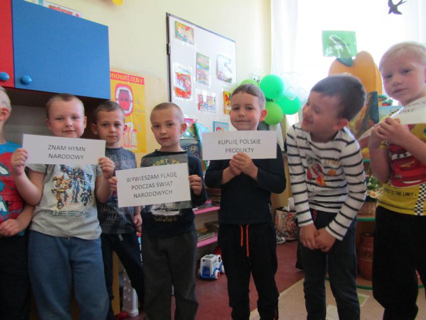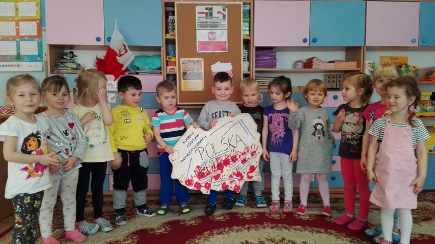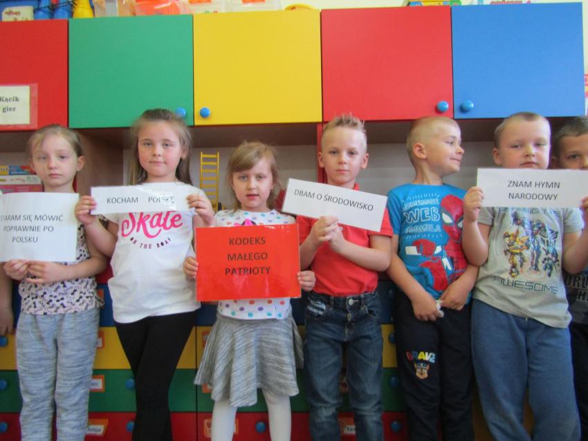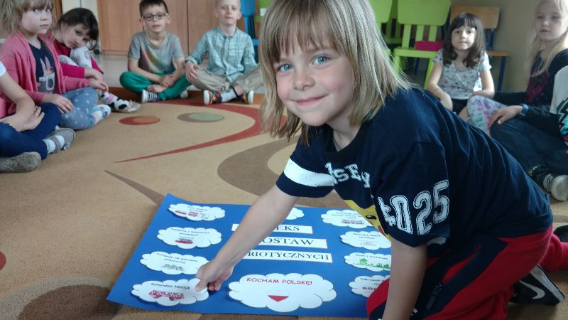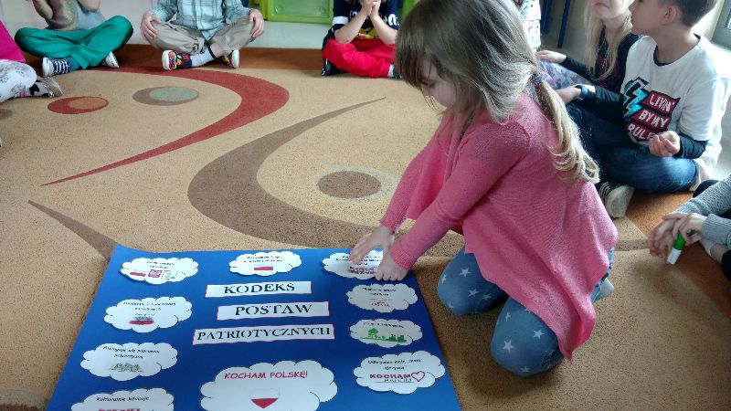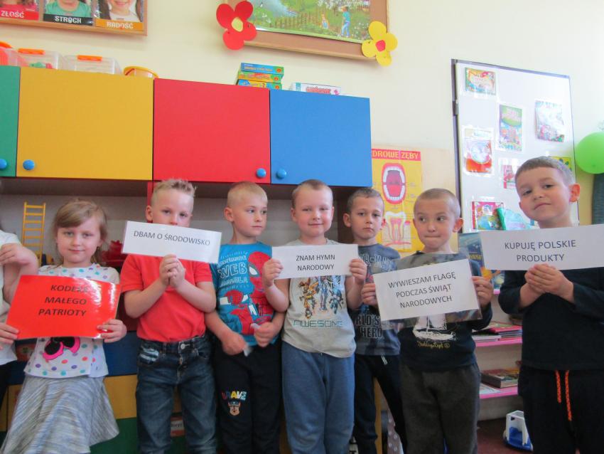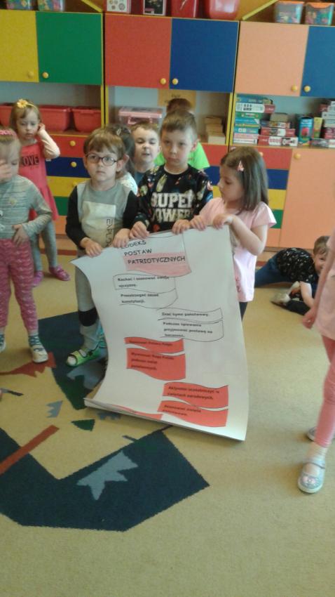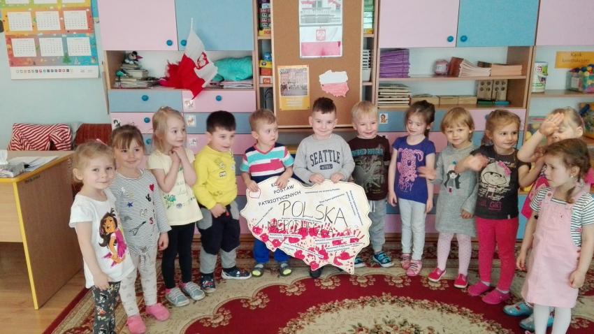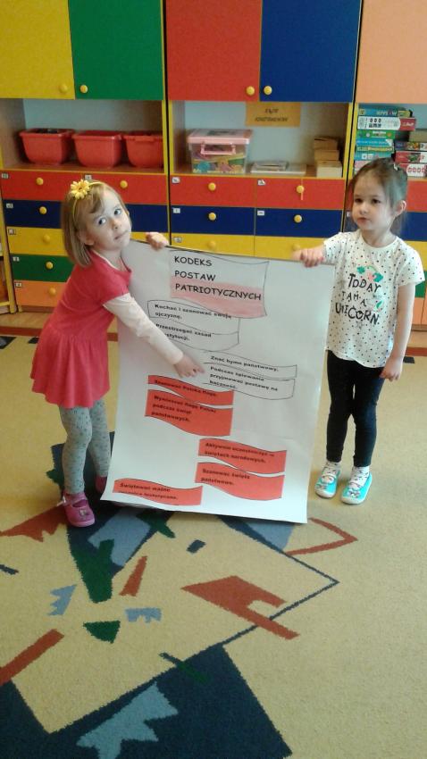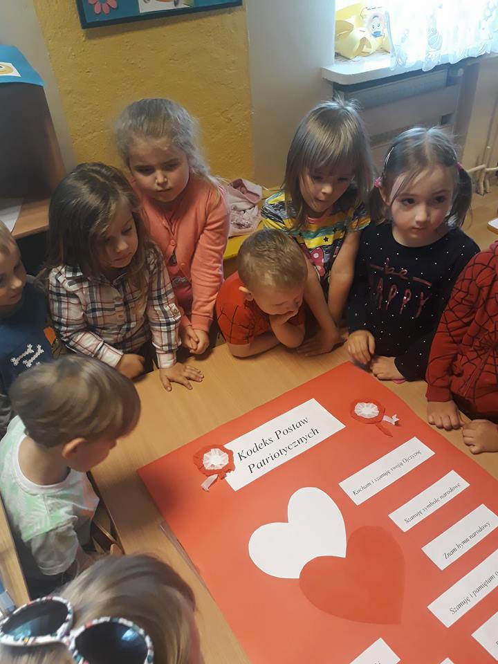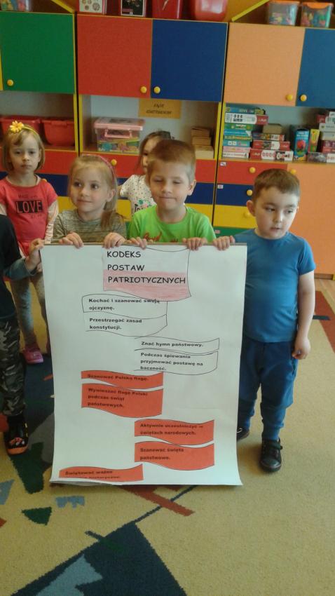 W kwietniu dzieci ze wszystkich grup przedszkolnych zaangażowane były w tworzenie Kodeksu Postaw Patriotycznych, co jest jednym z punktów Ogólnopolskiego Konkursu Patriotycznego „Przedszkole młodych patriotów III edycja”.
