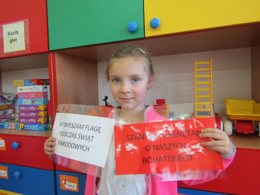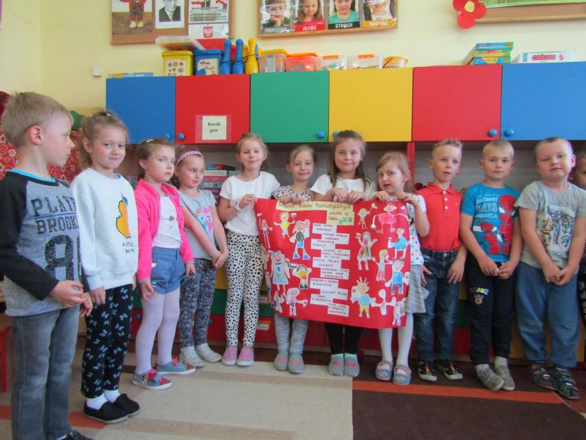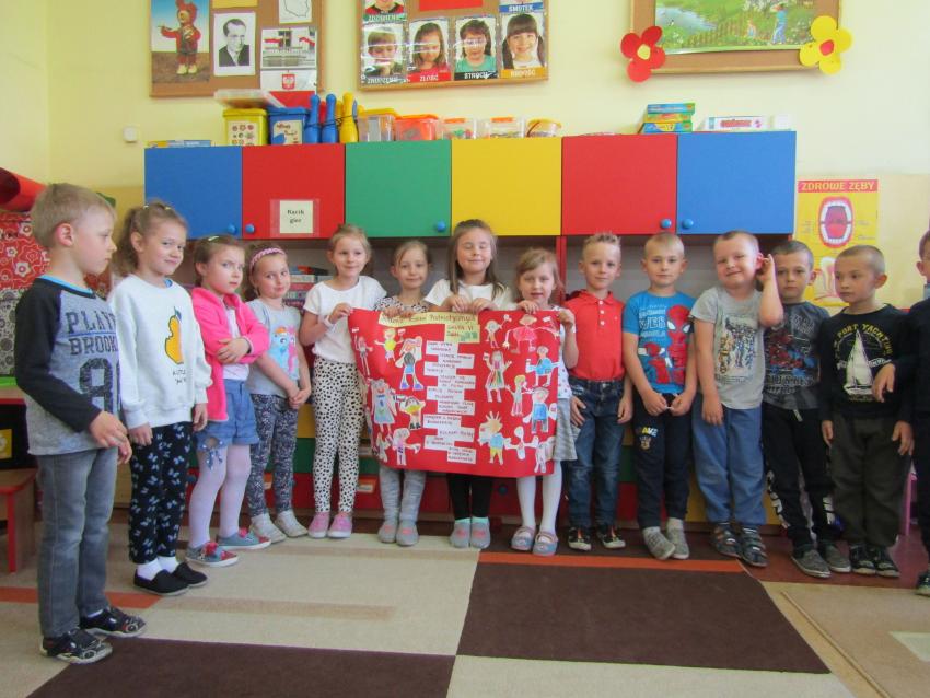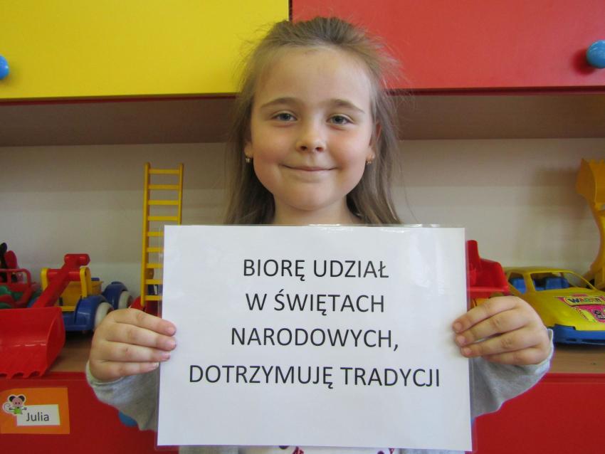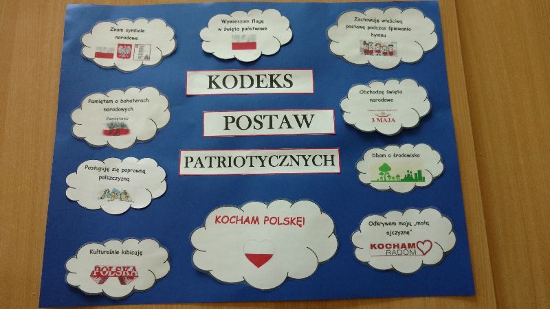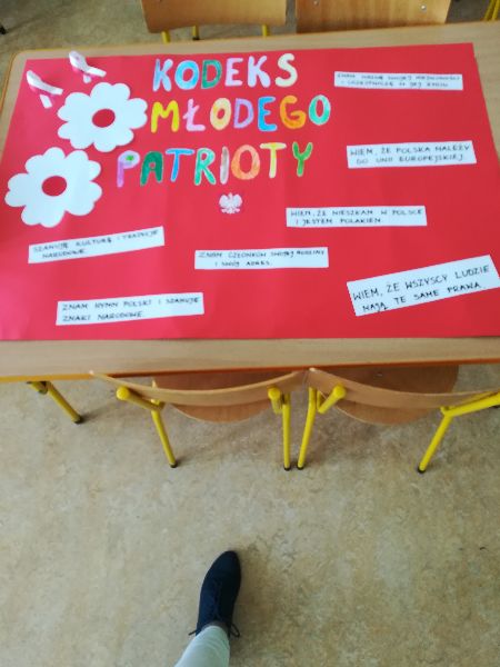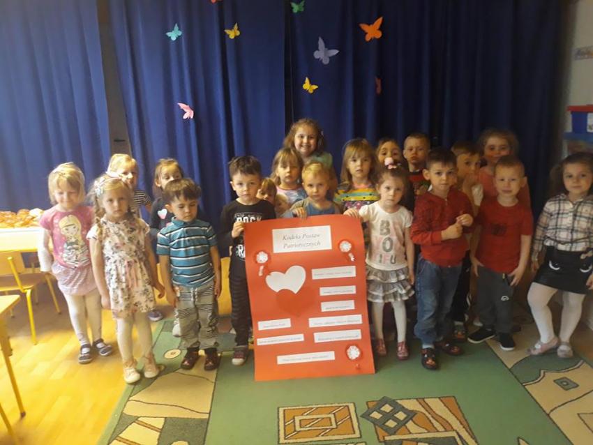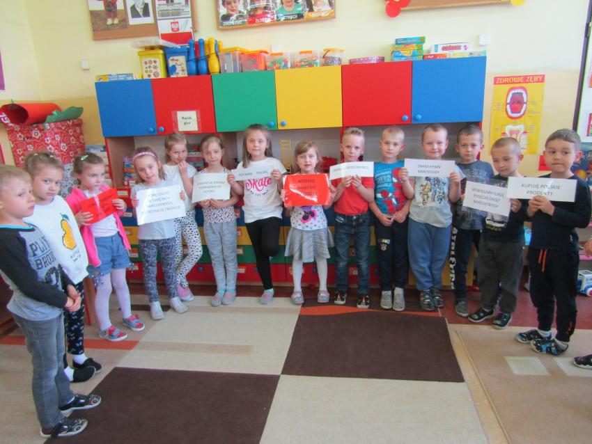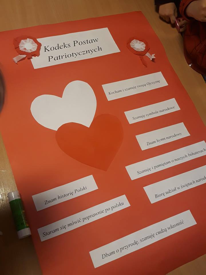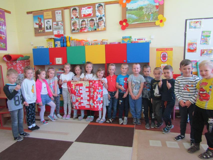W kwietniu dzieci ze wszystkich grup przedszkolnych zaangażowane były w tworzenie Kodeksu Postaw Patriotycznych, co jest jednym z punktów Ogólnopolskiego Konkursu Patriotycznego „Przedszkole młodych patriotów III edycja”.
