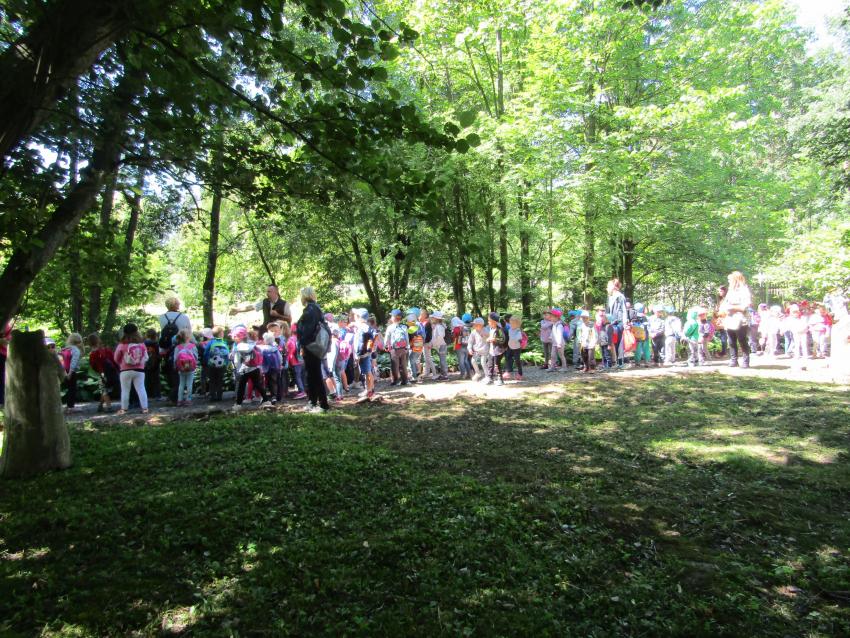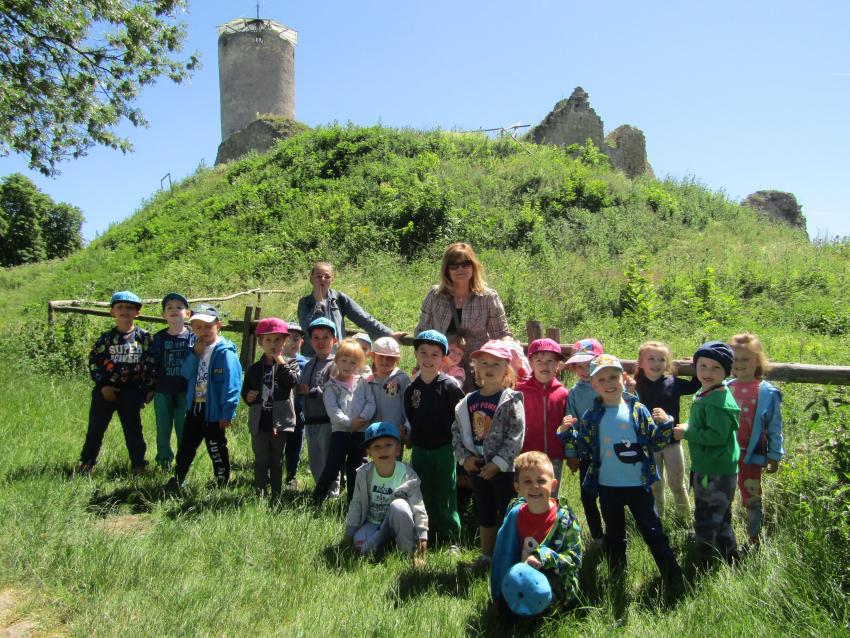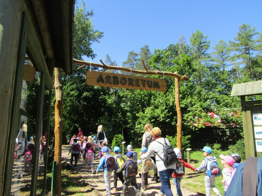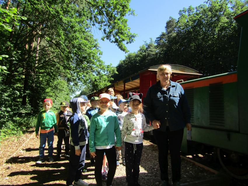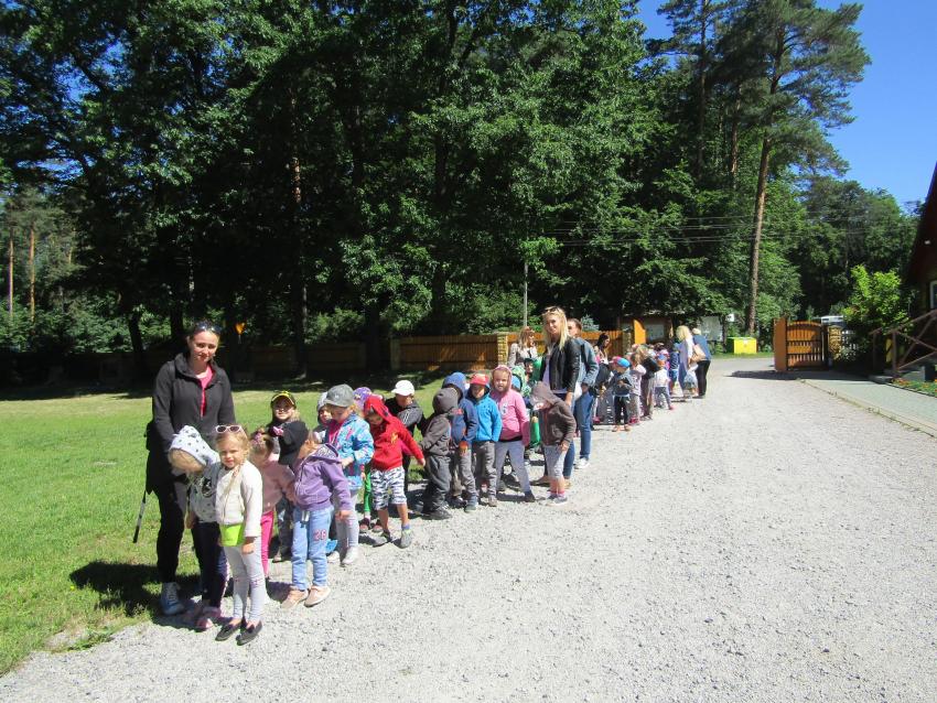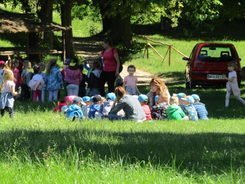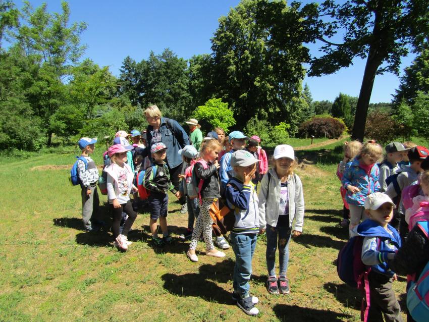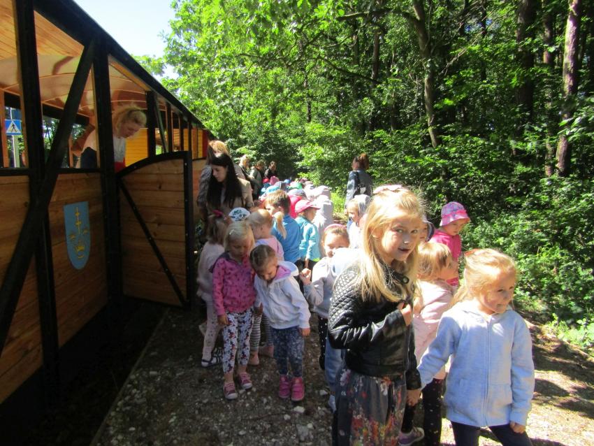 W dniu 6 czerwca dzieci z grup od III do VI wybrały się z wychowawcami i opiekunkami na wycieczkę autokarową do Nadleśnictwa Marcule. Po przejażdżce autokarem do Iłży, udaliśmy się na stację kolejki wąskotorowej. Dla większości dzieci było to wielkie przeżycie, ponieważ po raz pierwszy w życiu jechały zabytkowymi wagonami, ciągniętymi przez ciuchcię. Bardzo podobały nam się widoki okolicznych miejscowości. Po dotarciu do Marcul wyruszyliśmy do Centrum Edukacji Ekologicznej, gdzie zostaliśmy ciepło przywitani przez pana przewodnika. Posiliśmy się i udaliśmy się na wspólne zwiedzanie Arboretum, czyli przepięknego ogrodu pełnego zagadkowych roślin, eksponatów i zwierząt. Dzieci poznały wiele ciekawostek na temat przyrody, przytulały się do najstarszego drzewa o imieniu Marcel, które ma 182 lata. Dzieci z zainteresowaniem słuchały wypowiedzi pana przewodnika, ponieważ nigdy wcześniej nie miały możliwości dowiedzieć się tylu ciekawych rzeczy na temat roślin i zwierząt, znajdujących się w tych okolicach. Na zakończenie długiego spaceru, czekało na nas spotkanie ze zwierzętami, hodowanymi w Arboretum m.in. danielami, baranami, kozami, ozdobnym drobiem, osiołkiem, kucykiem, a nawet małym koziołkiem. Po wyczerpującej lekcji w terenie dzieci mogły sie posilić pieczoną kiełbaską i napić ciepłej herbaty. Każde z dzieci bardzo cieszyło się z własnego jedzenia, wszystkie dzieliły się wzajemnie zabranym prowiantem. W drodze powrotenej zatrzymalismy się w Iłży, aby zwiedzić ruiny zamku. Dzieci zadawały mnóstwo pytań na temat historii tej budowli, murów pozostawionych na wzgórzu. Podziwialiśmy panoramę miasta z wysoka, ciesząc się piękną pogodą. Tak zakończyła się nasza wycieczka. Wszystkie dzieci wróciły zadowolone, chociaż bardzo zmęczone. Pozdrawiamy naszych małych podróżników!