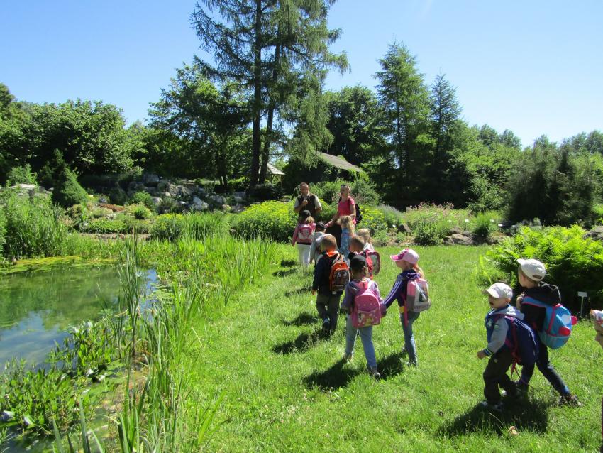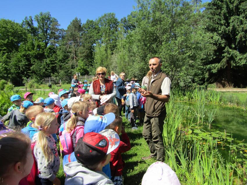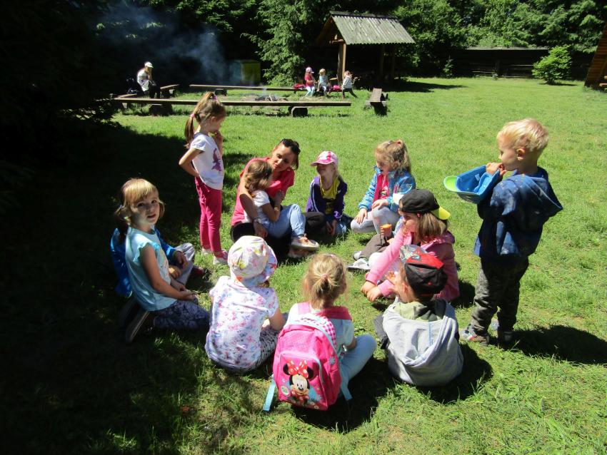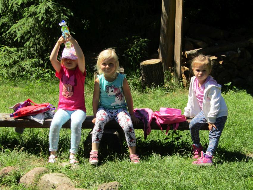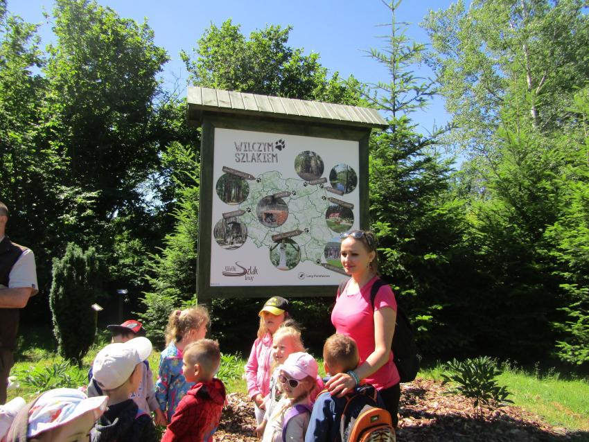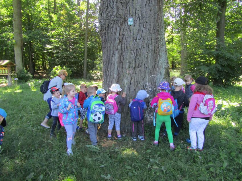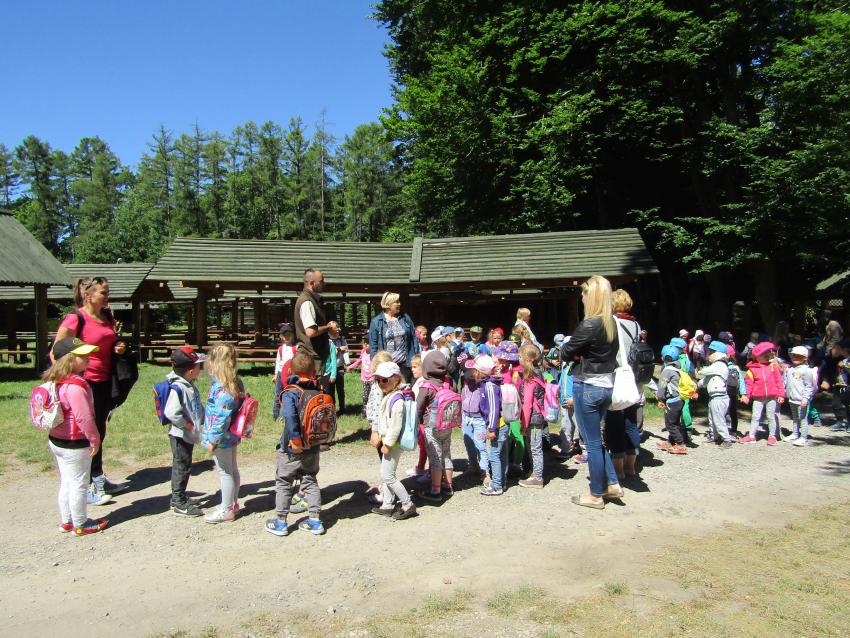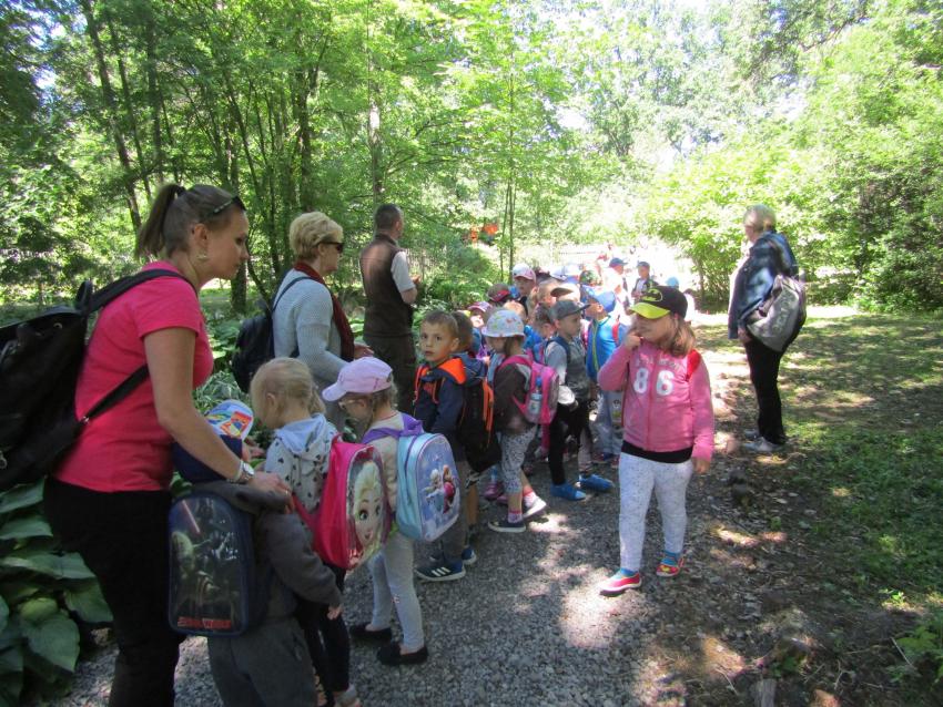 W dniu 6 czerwca dzieci z grup od III do VI wybrały się z wychowawcami i opiekunkami na wycieczkę autokarową do Nadleśnictwa Marcule. Po przejażdżce autokarem do Iłży, udaliśmy się na stację kolejki wąskotorowej. Dla większości dzieci było to wielkie przeżycie, ponieważ po raz pierwszy w życiu jechały zabytkowymi wagonami, ciągniętymi przez ciuchcię. Bardzo podobały nam się widoki okolicznych miejscowości. Po dotarciu do Marcul wyruszyliśmy do Centrum Edukacji Ekologicznej, gdzie zostaliśmy ciepło przywitani przez pana przewodnika. Posiliśmy się i udaliśmy się na wspólne zwiedzanie Arboretum, czyli przepięknego ogrodu pełnego zagadkowych roślin, eksponatów i zwierząt. Dzieci poznały wiele ciekawostek na temat przyrody, przytulały się do najstarszego drzewa o imieniu Marcel, które ma 182 lata. Dzieci z zainteresowaniem słuchały wypowiedzi pana przewodnika, ponieważ nigdy wcześniej nie miały możliwości dowiedzieć się tylu ciekawych rzeczy na temat roślin i zwierząt, znajdujących się w tych okolicach. Na zakończenie długiego spaceru, czekało na nas spotkanie ze zwierzętami, hodowanymi w Arboretum m.in. danielami, baranami, kozami, ozdobnym drobiem, osiołkiem, kucykiem, a nawet małym koziołkiem. Po wyczerpującej lekcji w terenie dzieci mogły sie posilić pieczoną kiełbaską i napić ciepłej herbaty. Każde z dzieci bardzo cieszyło się z własnego jedzenia, wszystkie dzieliły się wzajemnie zabranym prowiantem. W drodze powrotenej zatrzymalismy się w Iłży, aby zwiedzić ruiny zamku. Dzieci zadawały mnóstwo pytań na temat historii tej budowli, murów pozostawionych na wzgórzu. Podziwialiśmy panoramę miasta z wysoka, ciesząc się piękną pogodą. Tak zakończyła się nasza wycieczka. Wszystkie dzieci wróciły zadowolone, chociaż bardzo zmęczone. Pozdrawiamy naszych małych podróżników!