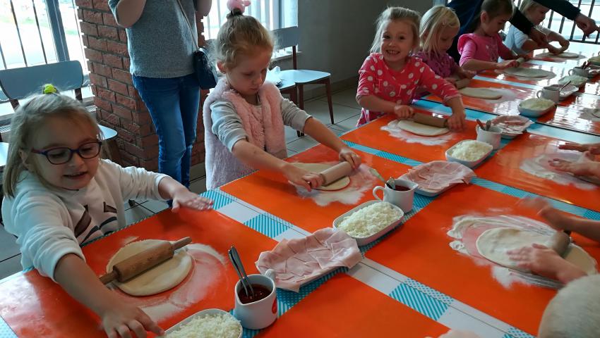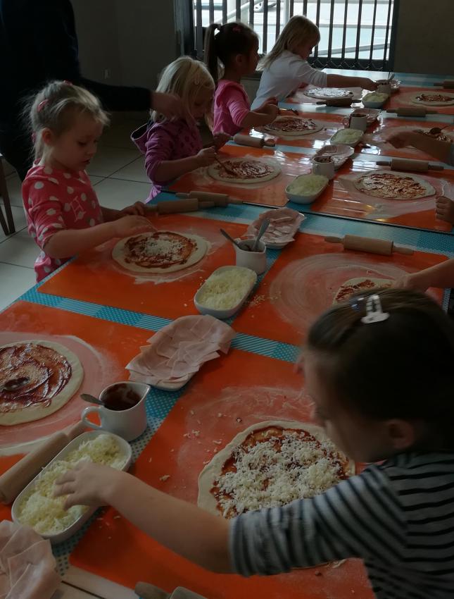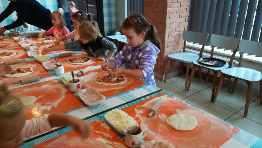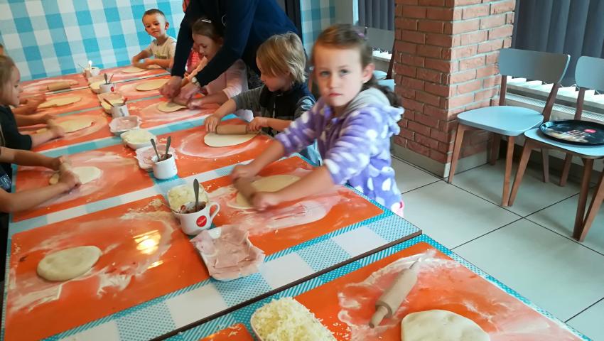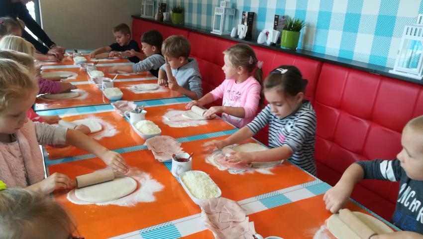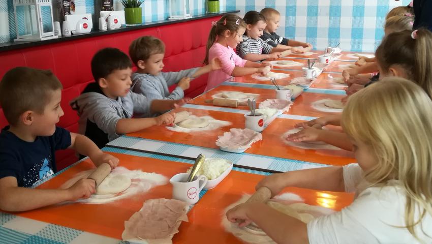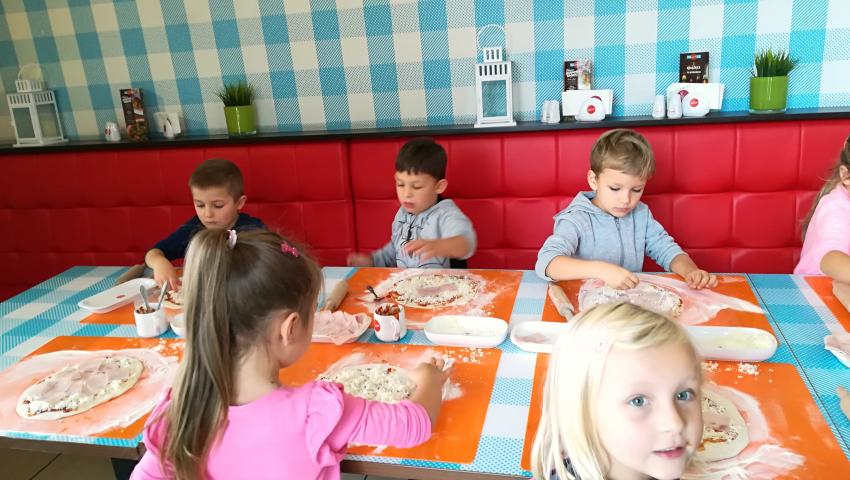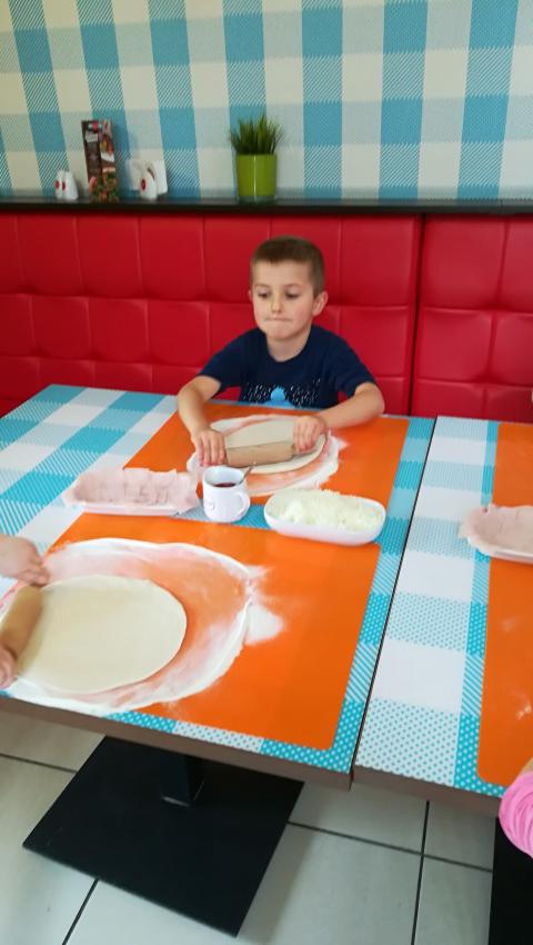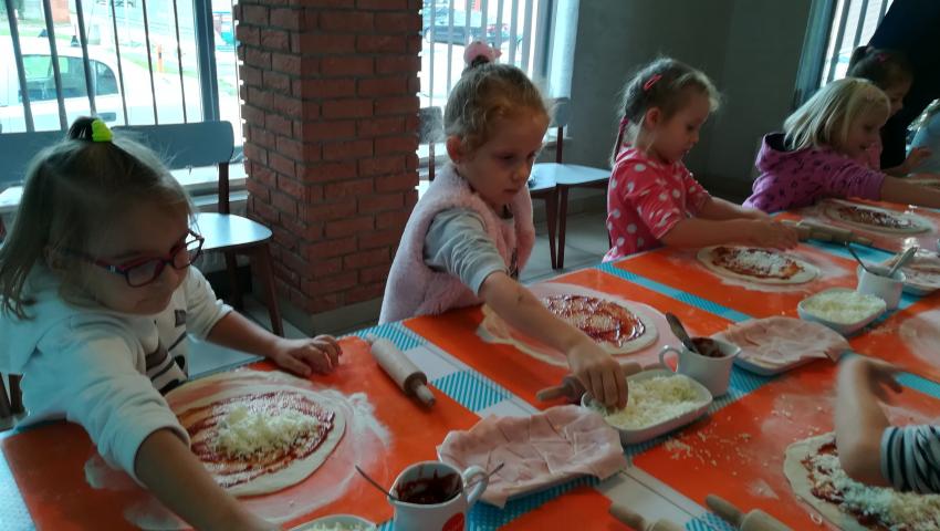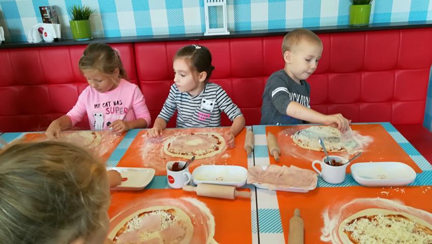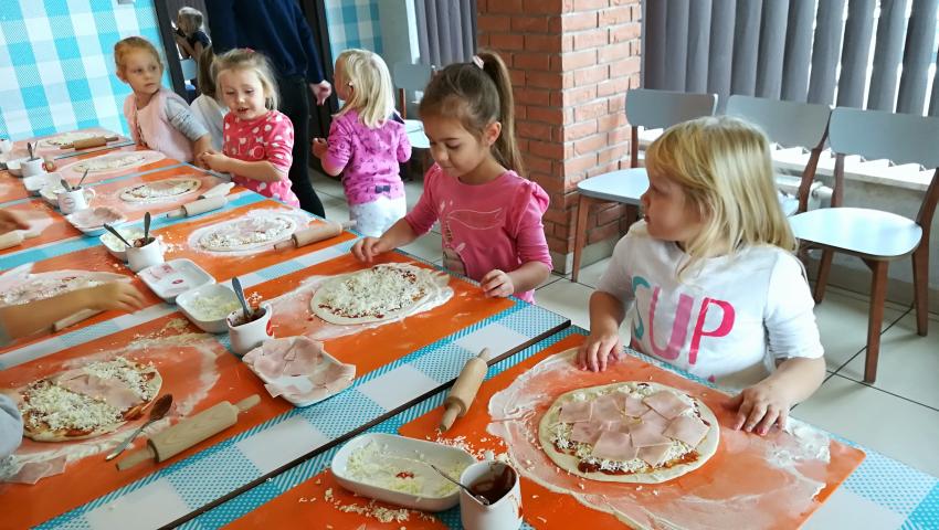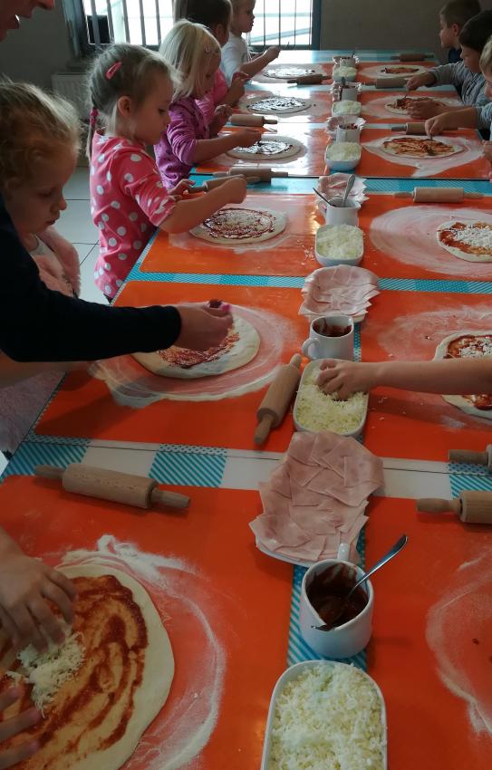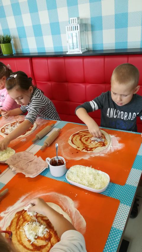 Z okazji Dnia Chłopaka grupa Misiów wybrała się na warsztaty kulinarne zorganizowane przez pizzerię Da Grasso. Przedszkolaki podczas wyjścia samodzielnie wykonały pizzę. Pierwszym etapem ich pracy było rozwałkowanie ciasta oraz posmarowanie go sosem pomidorowym. Następnie dzieci nakładały ser i szynkę. Pizze zostały upieczone w specjalnym piecu a zadaniem dzieci było spróbowanie swoich wypieków. Pizza smakowała wszystkim uczestnikom spotkania a także rodzinom dzieci. Niezjedzoną pizzę dzieci zabrały do domku. Dziękujemy pizzerii za zorganizowanie pysznych warsztatów.