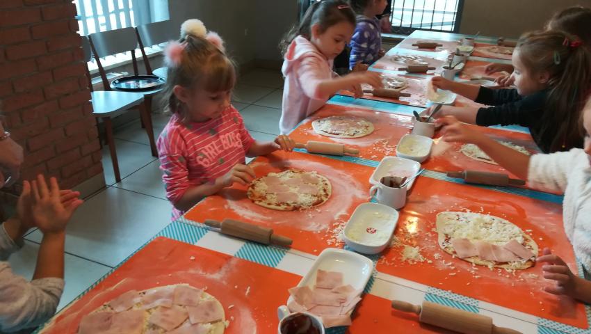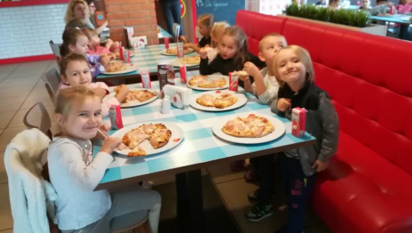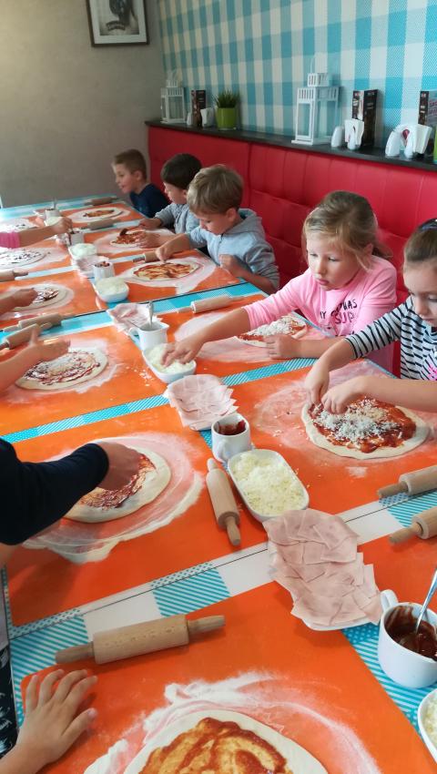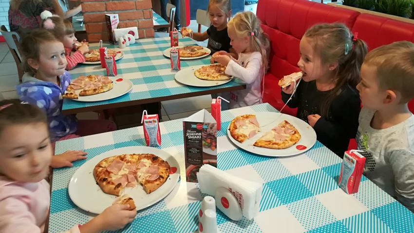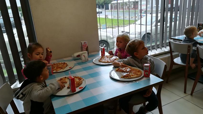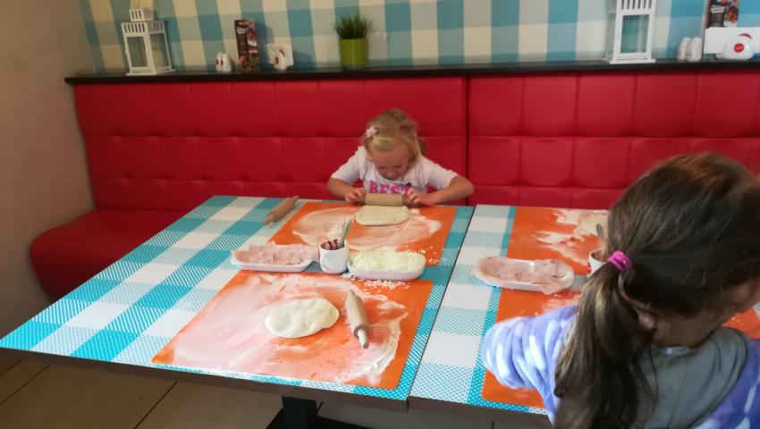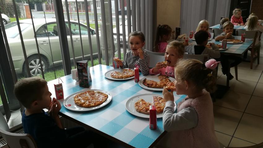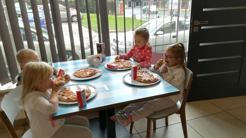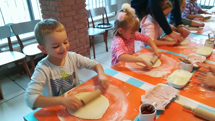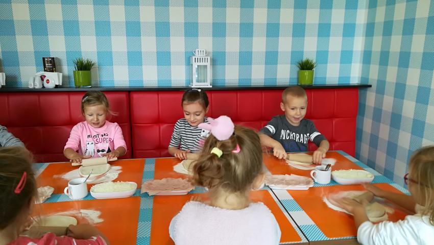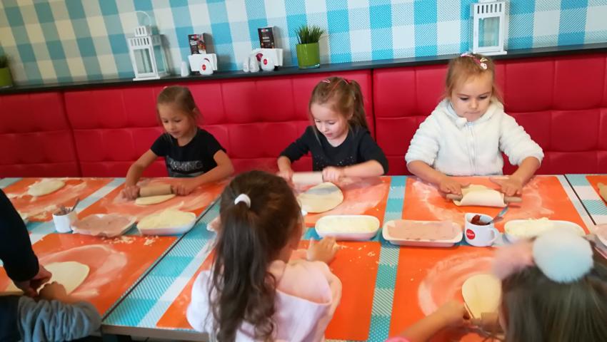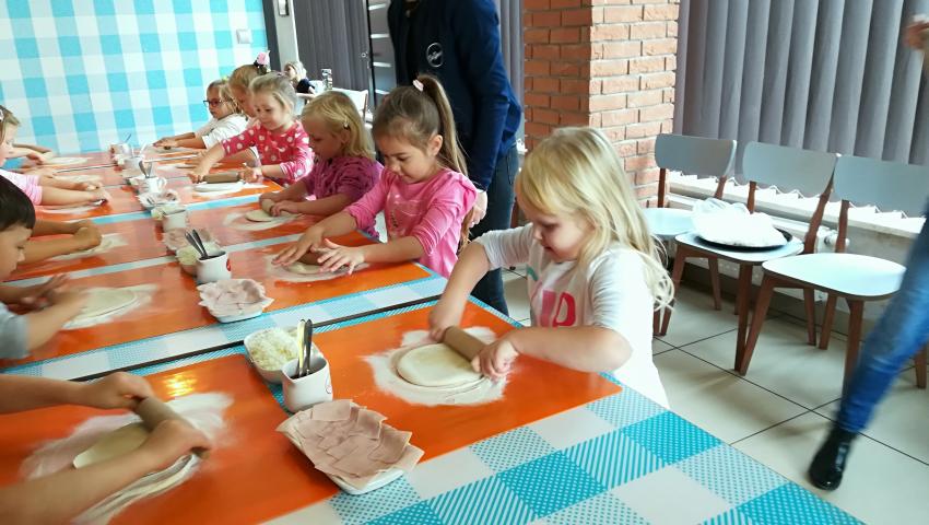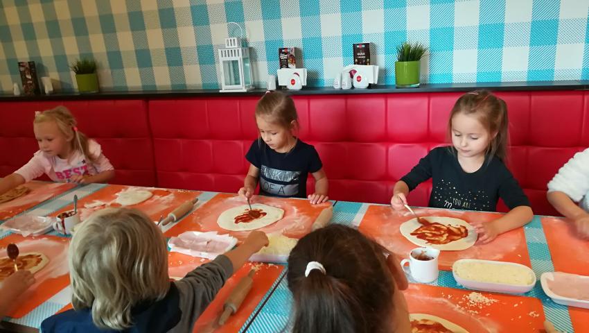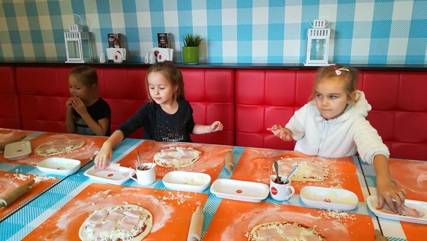 Z okazji Dnia Chłopaka grupa Misiów wybrała się na warsztaty kulinarne zorganizowane przez pizzerię Da Grasso. Przedszkolaki podczas wyjścia samodzielnie wykonały pizzę. Pierwszym etapem ich pracy było rozwałkowanie ciasta oraz posmarowanie go sosem pomidorowym. Następnie dzieci nakładały ser i szynkę. Pizze zostały upieczone w specjalnym piecu a zadaniem dzieci było spróbowanie swoich wypieków. Pizza smakowała wszystkim uczestnikom spotkania a także rodzinom dzieci. Niezjedzoną pizzę dzieci zabrały do domku. Dziękujemy pizzerii za zorganizowanie pysznych warsztatów.