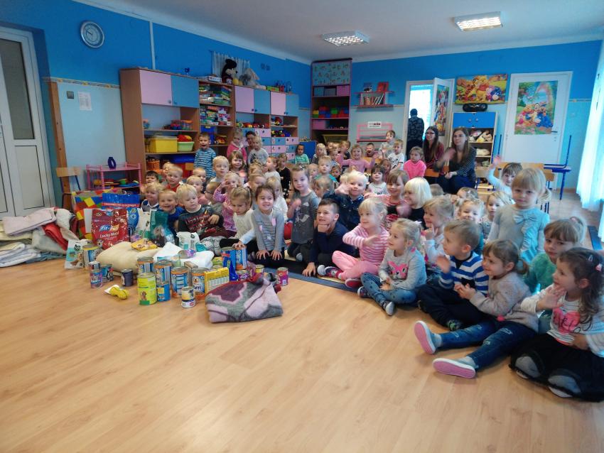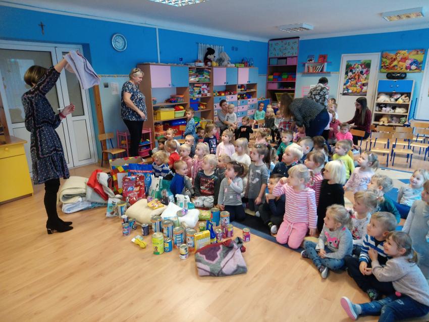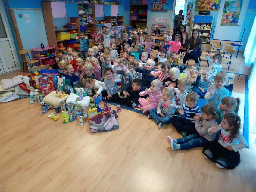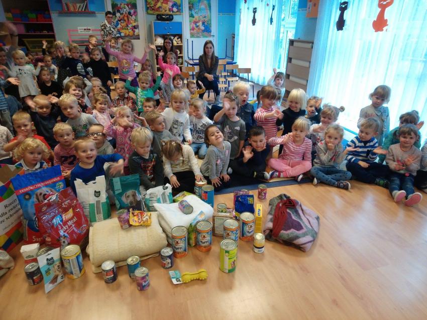 Przyniesione przez przedszkolaków i ich rodziców karmy i materiały wyścielające zostały przekazane pracownikowi schroniska. Serdecznie dziękujemy za włączenie się w  akcję!