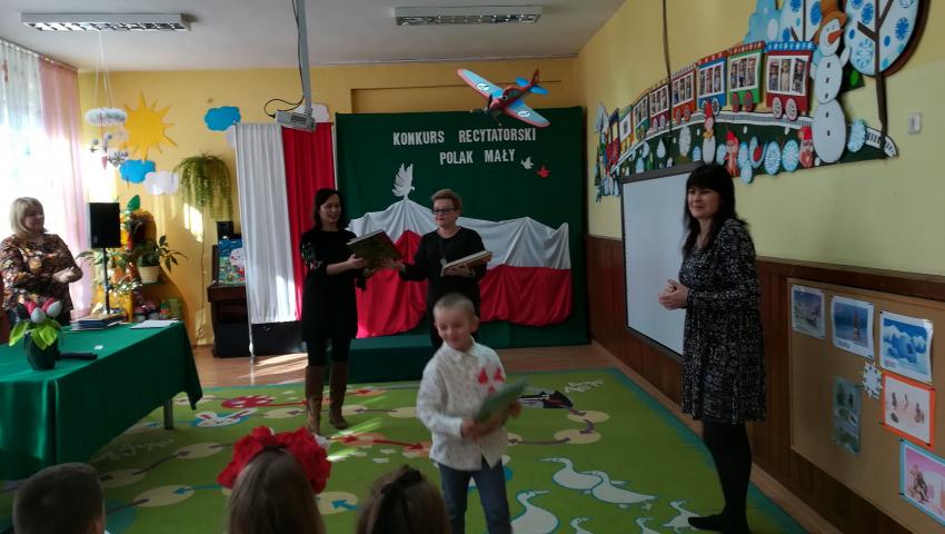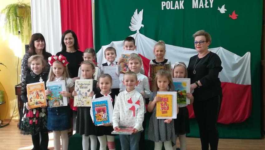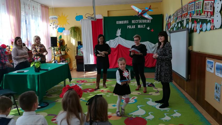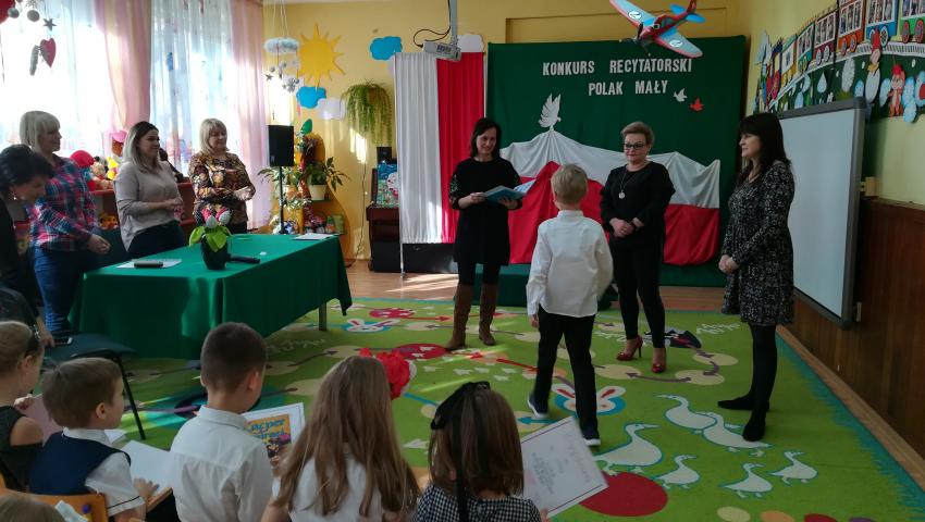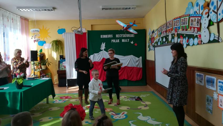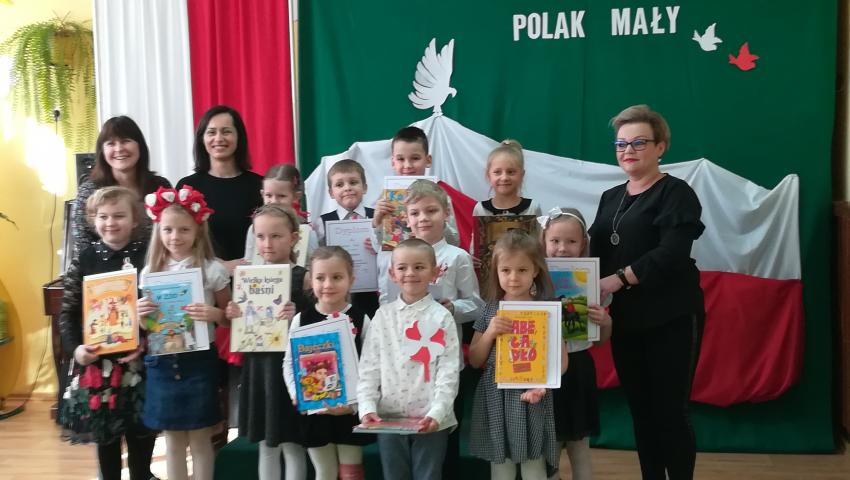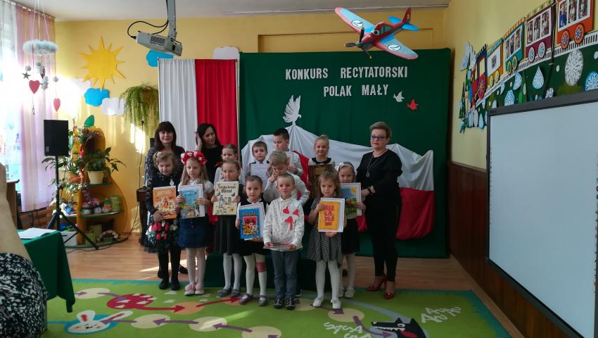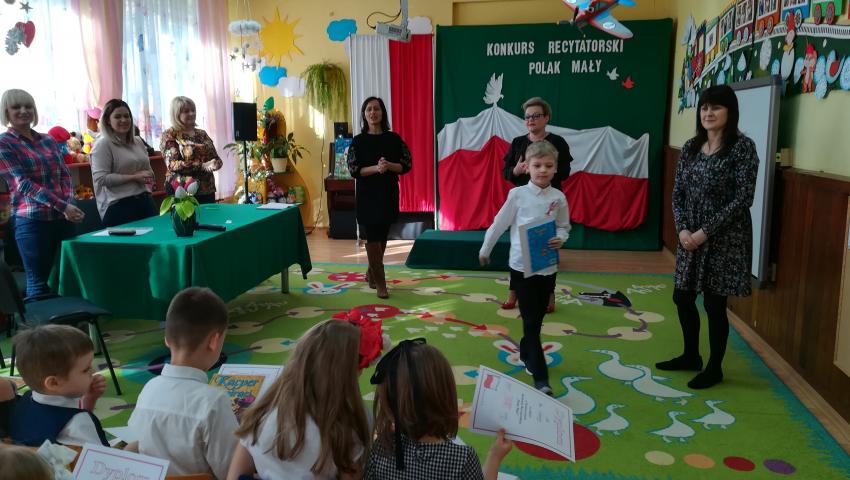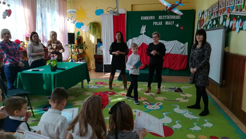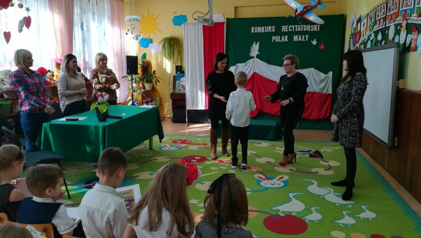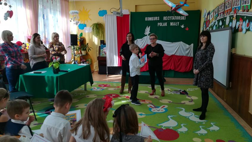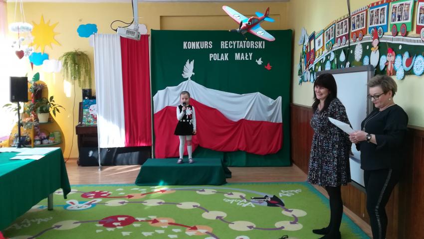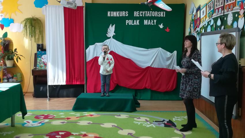 W dniu 26 lutego 2019 roku reprezentanci grup VI-VIII wzięli udział w międzyprzedszkolnym konkursie recytatorskim zorganizowanym przez Przedszkole Publiczne nr 3 w Radomiu. Był to konkurs Patriotyczny pod hasłem „Polak Mały”. Bartosz M. z grupy VI recytował wiersz „Co to jest Polska” autorstwa K. Grochowskiej, Hania Ch. z grupy VII zaprezentowała wiersz pod tytułem „Moja mała Ojczyzna” J. Białobrzeskiej. Najstarszy z naszych przedstawicieli, Jaś O. z grupy VIII przedstawił wiersz Cz. Janczarskiego „Co to jest Polska”. Podczas obrad komisji dzieci zostały zaproszone na poczęstunek. Rozstrzygnięcie konkursu nastąpiło w dwóch kategoriach wiekowych: 5 i 6-latki. Bartek M. zdobył 3 miejsce w grupie dzieci 5-letnich. Każdy uczestnik rywalizacji otrzymał dyplom oraz nagrodę - książkę.