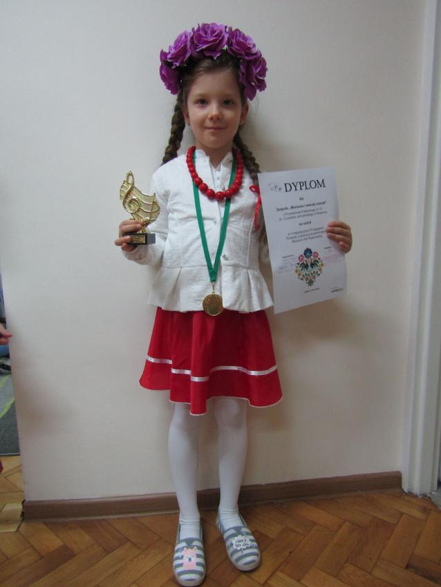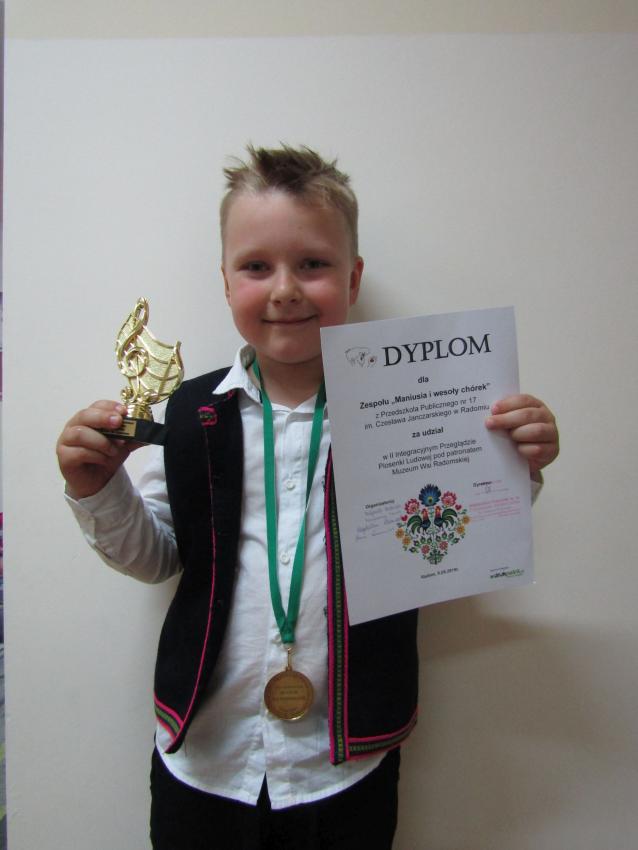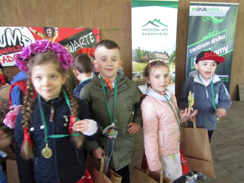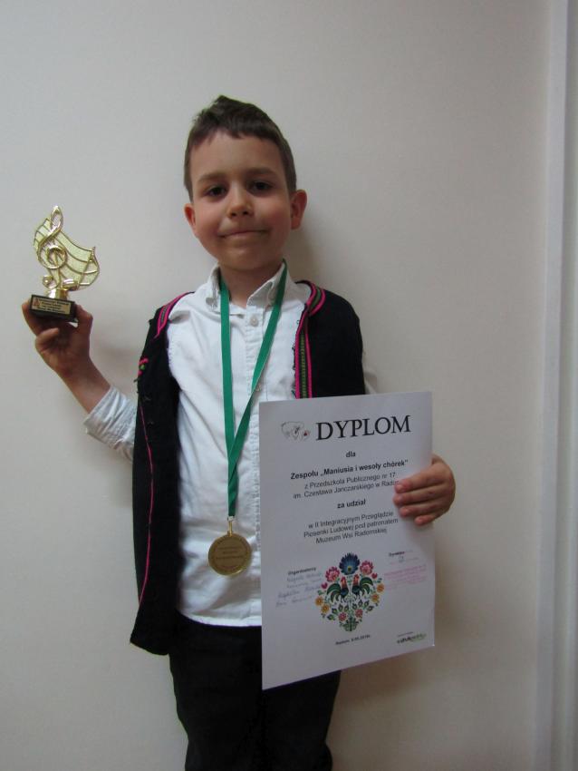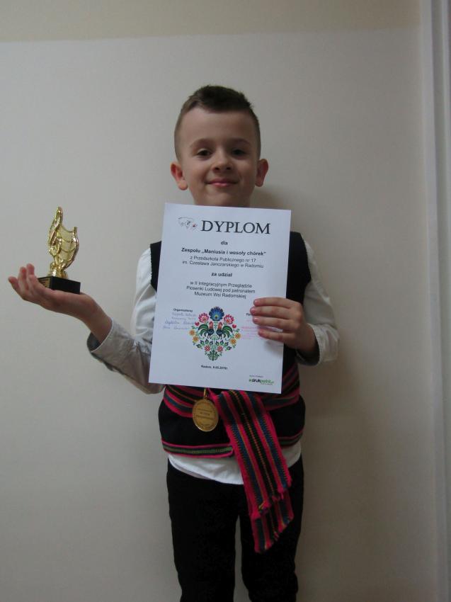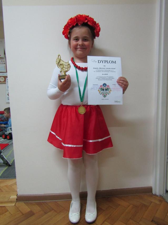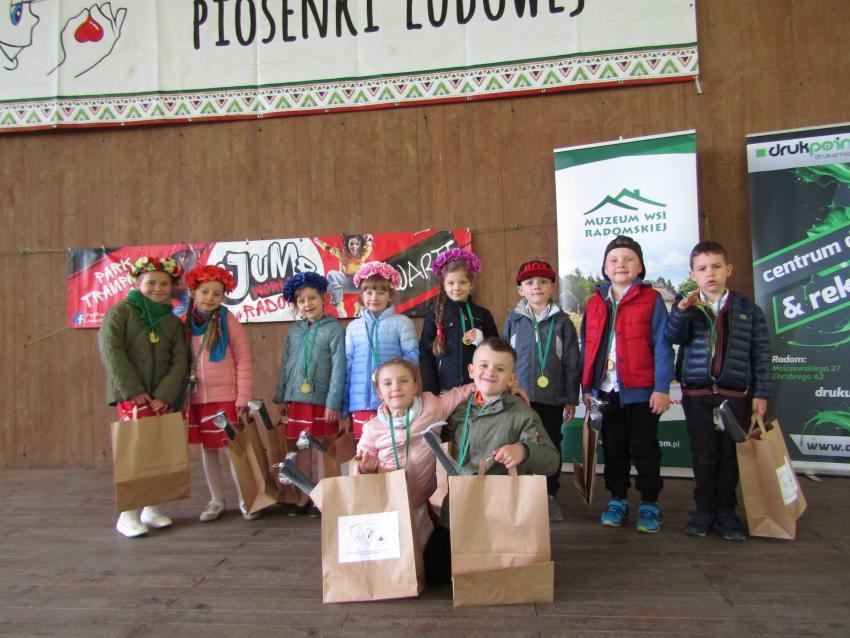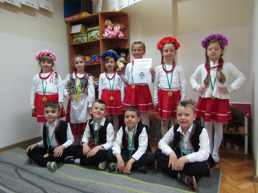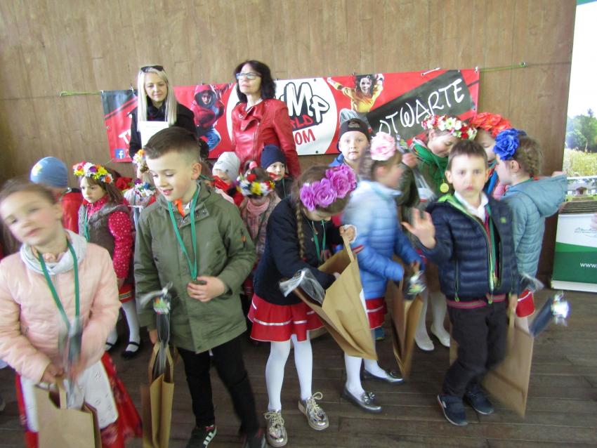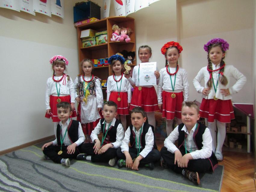 Nie zabrakło tam zespołu z naszego przedszkola. Dziesięcioro dzieci z grupy IX (Lenka Cęckiewicz, Rafał Grabowski, Adaś Podsiadły, Patryk Kowalski, Franek Brudka, Amelia Stysiak, Amelia Wasilewska, Maja Kutkiewicz, Zosia Ogorzałek, Ola Michalczyk) zaprezentowało utwór z repertuaru zespołu Rokiczanka pt. „W moim ogródeczku”. Nasi wykonawcy nie tylko pięknie zaśpiewali, ale wykonali także układ choreograficzny, co bardzo podobało się publiczności i jury. Zespół „Maniusia i wesoły chórek” przygotowała do występu pani Barbara Wojszko – nauczyciel i wychowawca grupy „Żabki”. Otrzymaliśmy specjalne wyróżnienie, statuetkę, dyplomy i nagrody dla naszych uczestników.