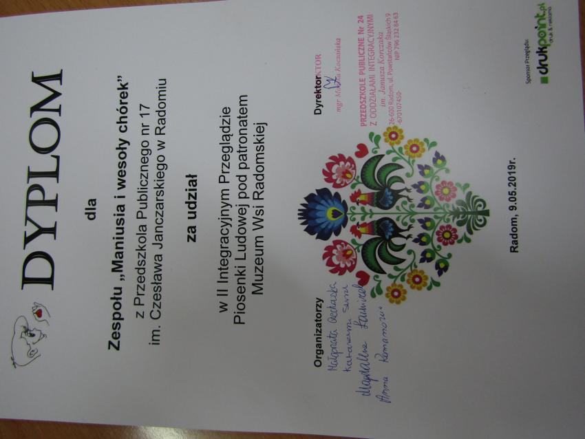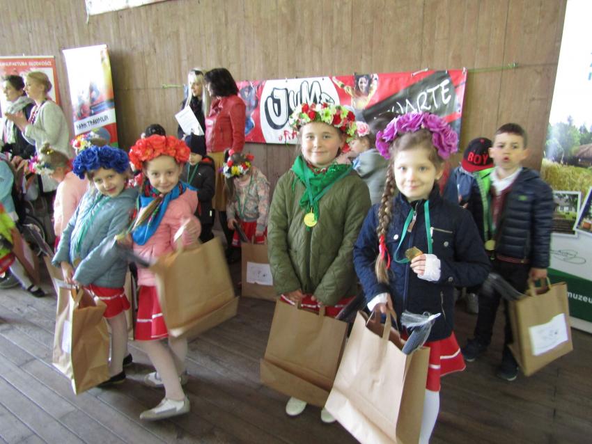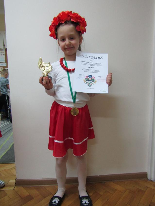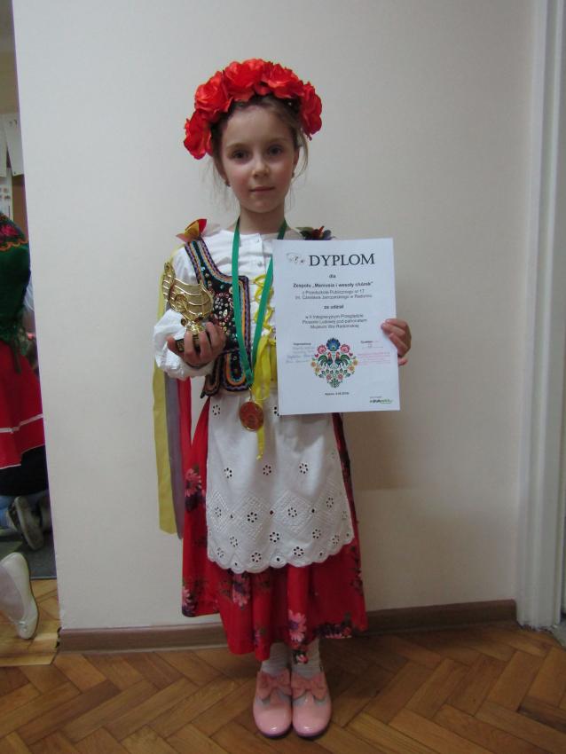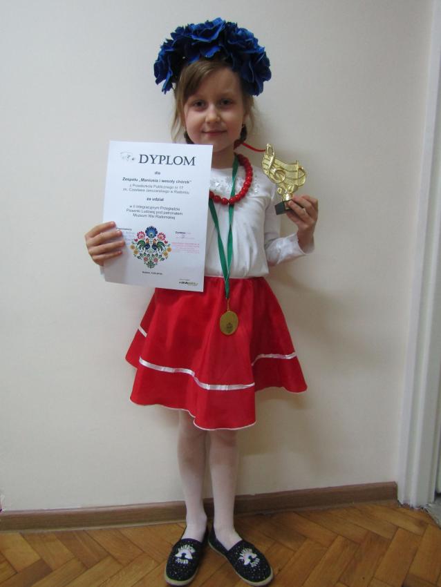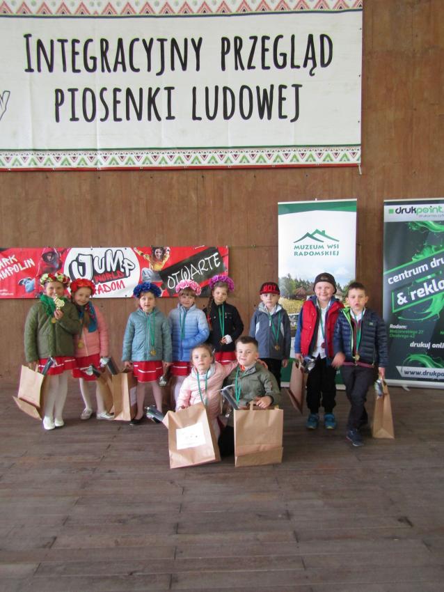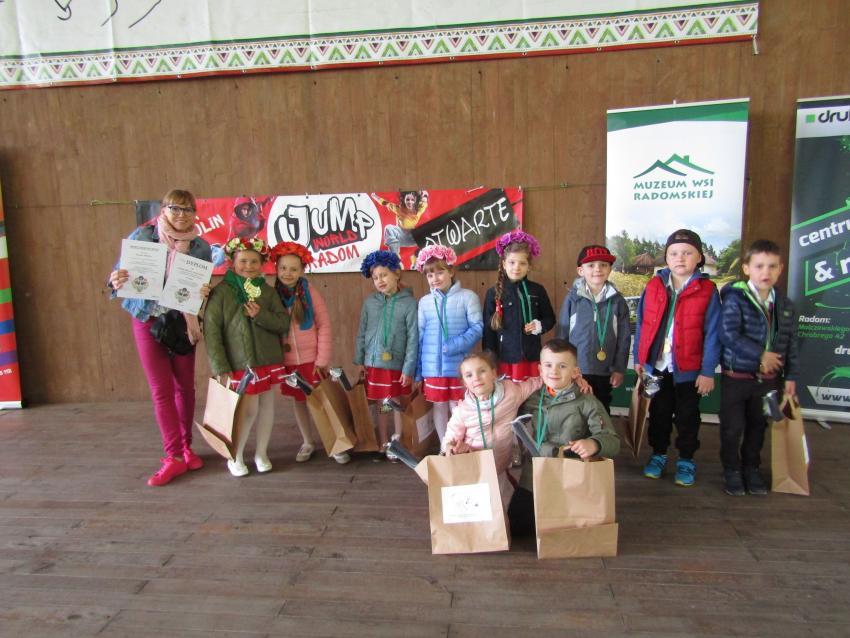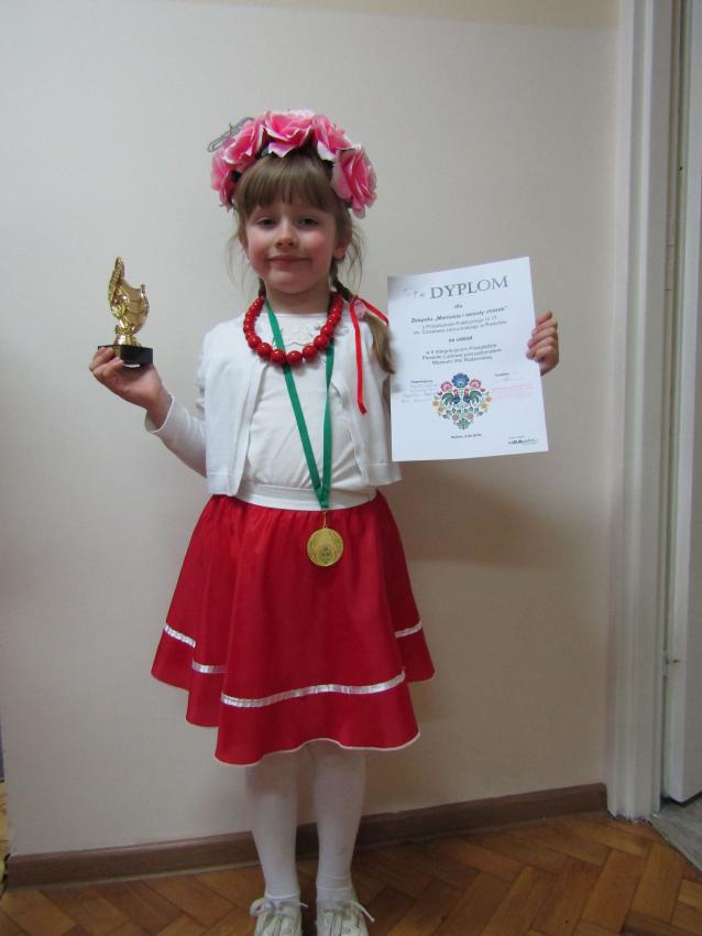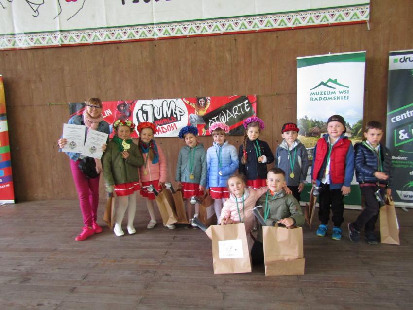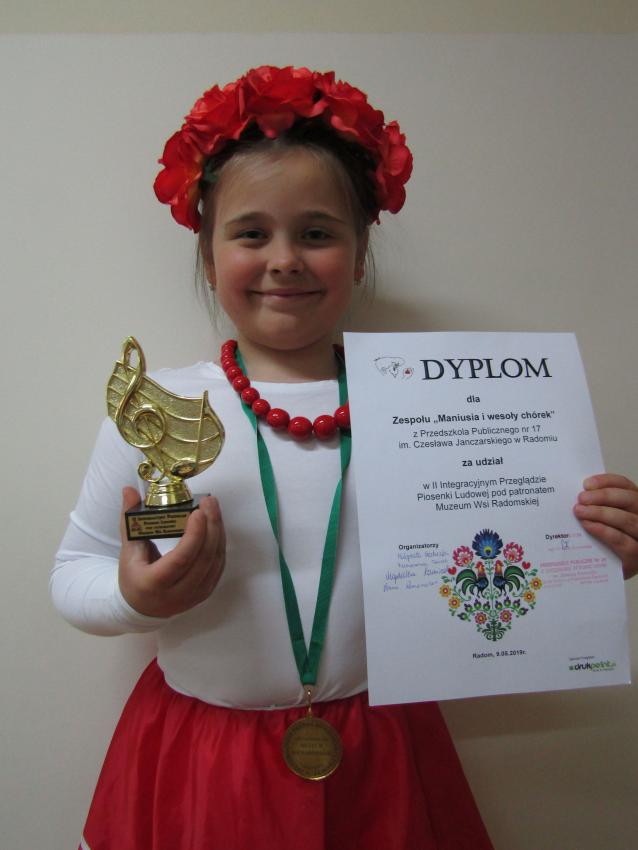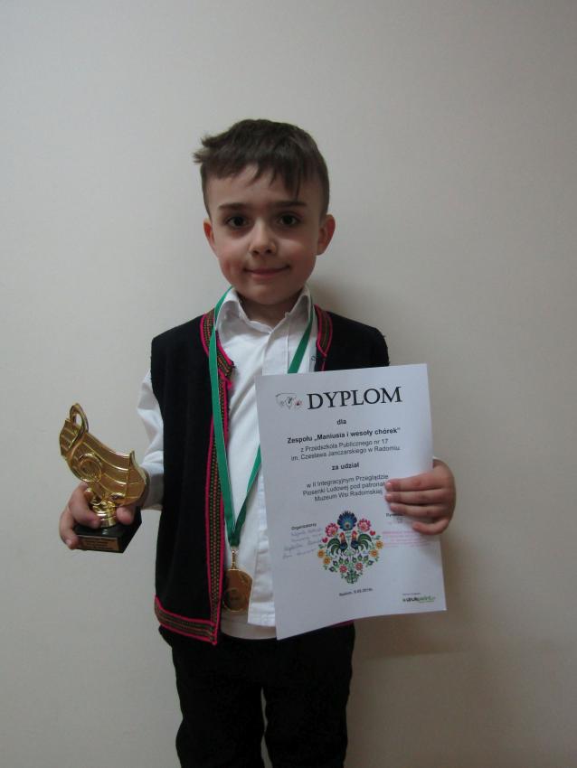 Nie zabrakło tam zespołu z naszego przedszkola. Dziesięcioro dzieci z grupy IX (Lenka Cęckiewicz, Rafał Grabowski, Adaś Podsiadły, Patryk Kowalski, Franek Brudka, Amelia Stysiak, Amelia Wasilewska, Maja Kutkiewicz, Zosia Ogorzałek, Ola Michalczyk) zaprezentowało utwór z repertuaru zespołu Rokiczanka pt. „W moim ogródeczku”. Nasi wykonawcy nie tylko pięknie zaśpiewali, ale wykonali także układ choreograficzny, co bardzo podobało się publiczności i jury. Zespół „Maniusia i wesoły chórek” przygotowała do występu pani Barbara Wojszko – nauczyciel i wychowawca grupy „Żabki”. Otrzymaliśmy specjalne wyróżnienie, statuetkę, dyplomy i nagrody dla naszych uczestników.
