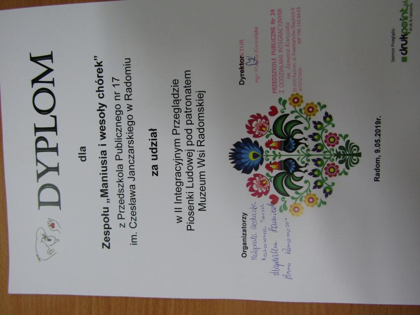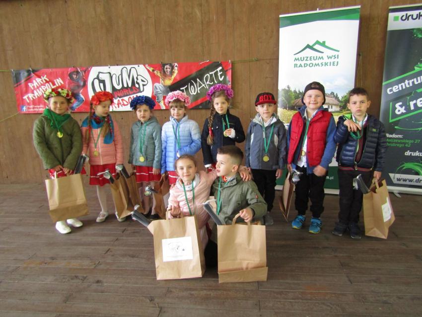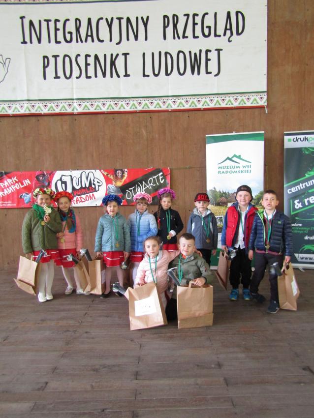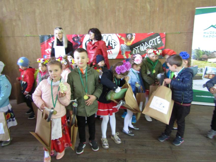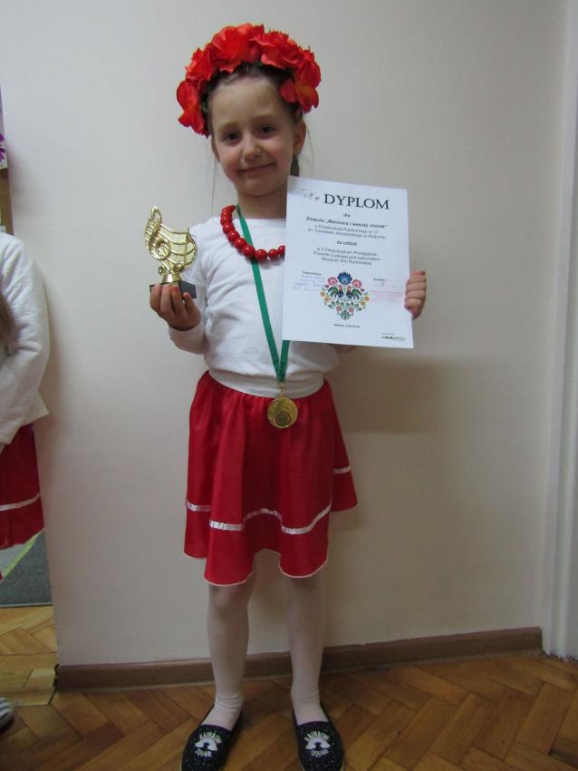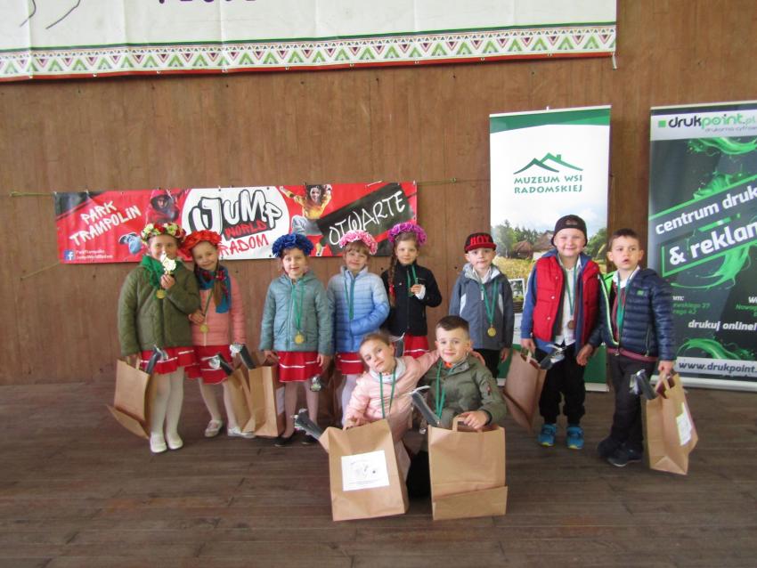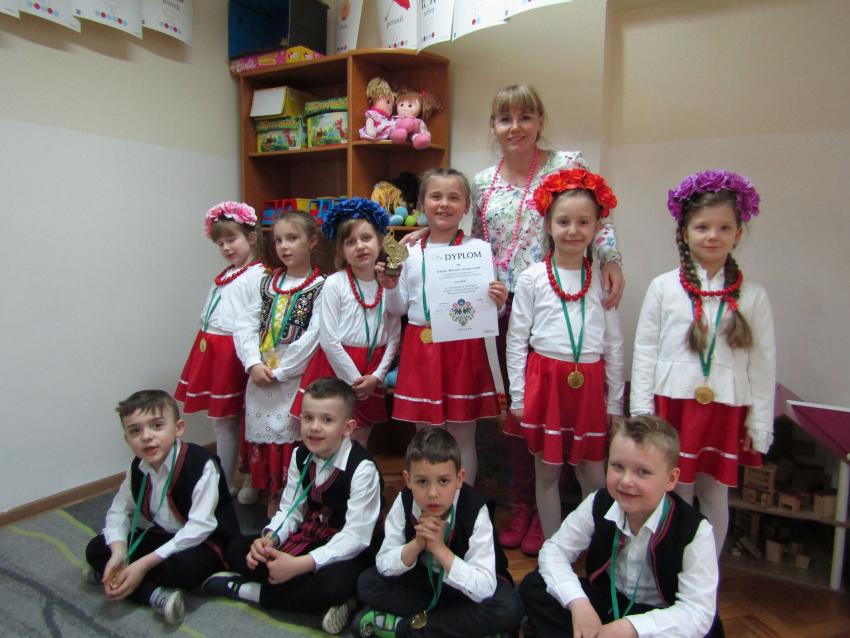 Nie zabrakło tam zespołu z naszego przedszkola. Dziesięcioro dzieci z grupy IX (Lenka Cęckiewicz, Rafał Grabowski, Adaś Podsiadły, Patryk Kowalski, Franek Brudka, Amelia Stysiak, Amelia Wasilewska, Maja Kutkiewicz, Zosia Ogorzałek, Ola Michalczyk) zaprezentowało utwór z repertuaru zespołu Rokiczanka pt. „W moim ogródeczku”. Nasi wykonawcy nie tylko pięknie zaśpiewali, ale wykonali także układ choreograficzny, co bardzo podobało się publiczności i jury. Zespół „Maniusia i wesoły chórek” przygotowała do występu pani Barbara Wojszko – nauczyciel i wychowawca grupy „Żabki”. Otrzymaliśmy specjalne wyróżnienie, statuetkę, dyplomy i nagrody dla naszych uczestników.