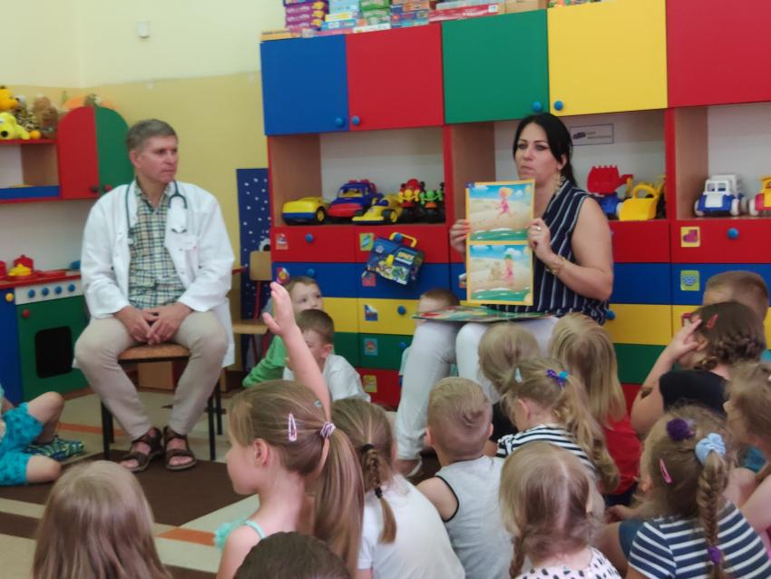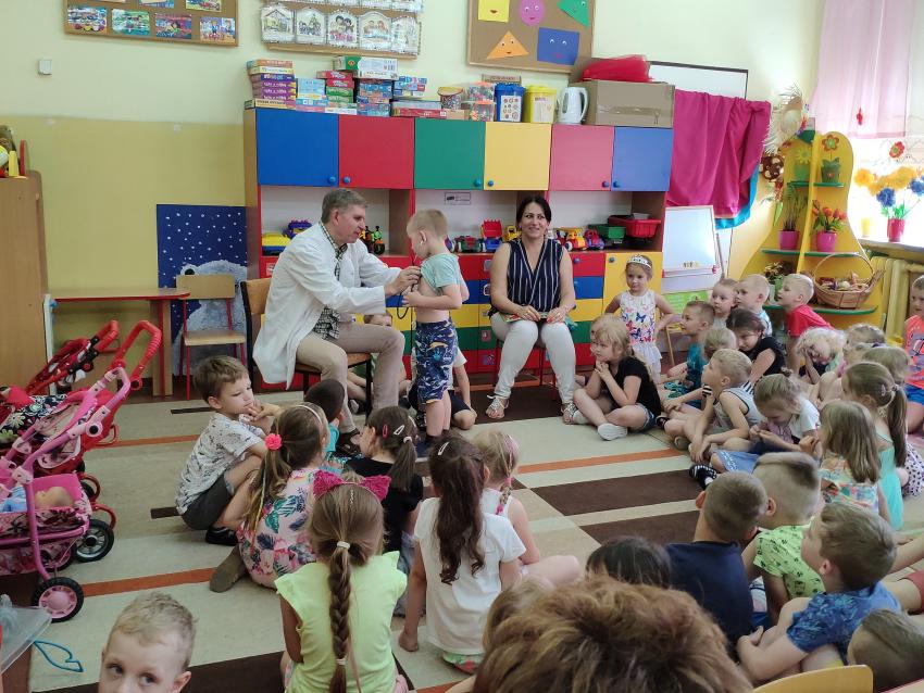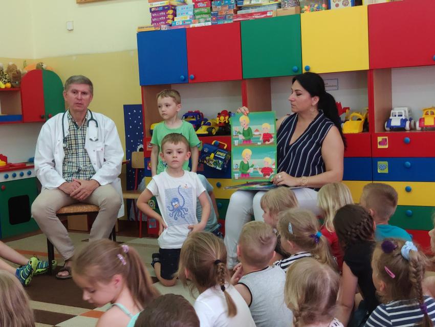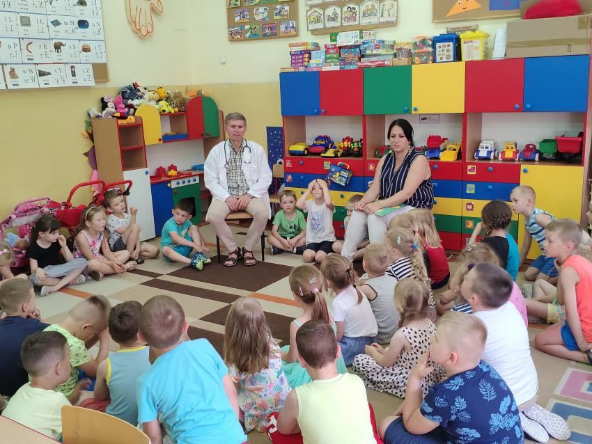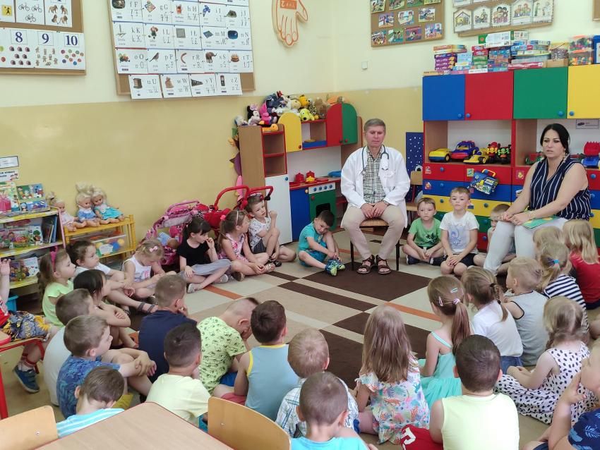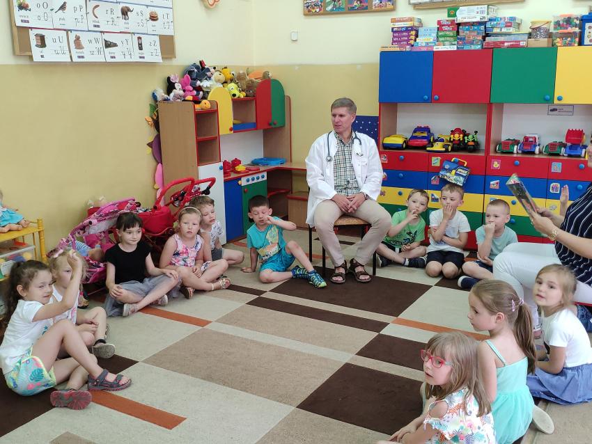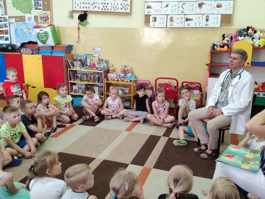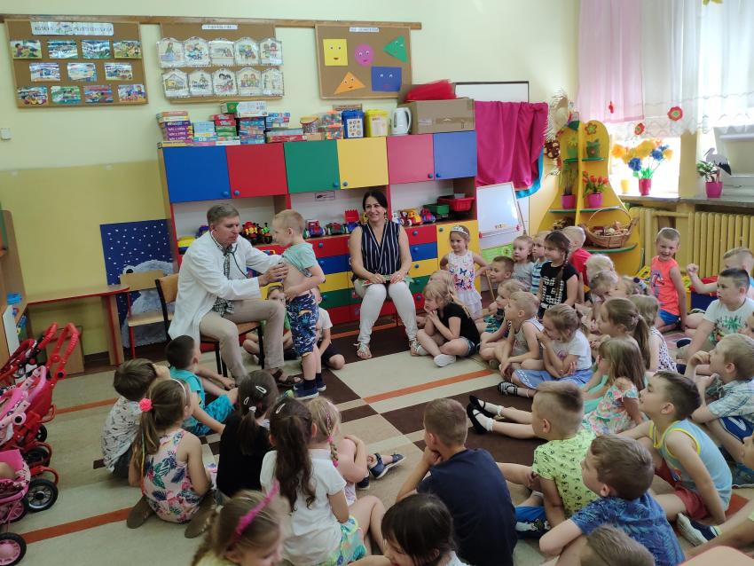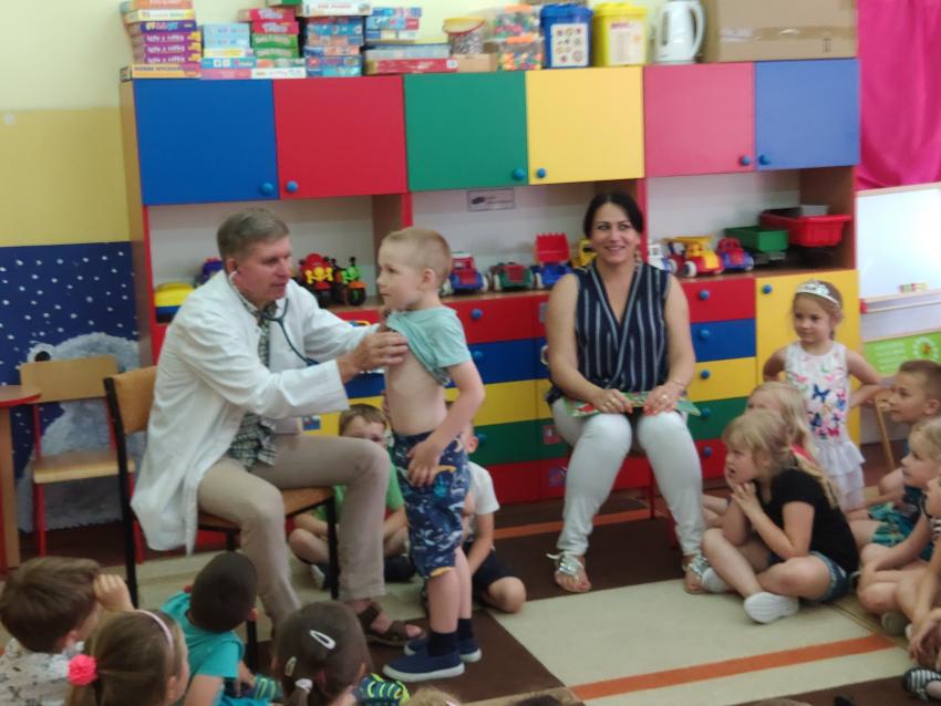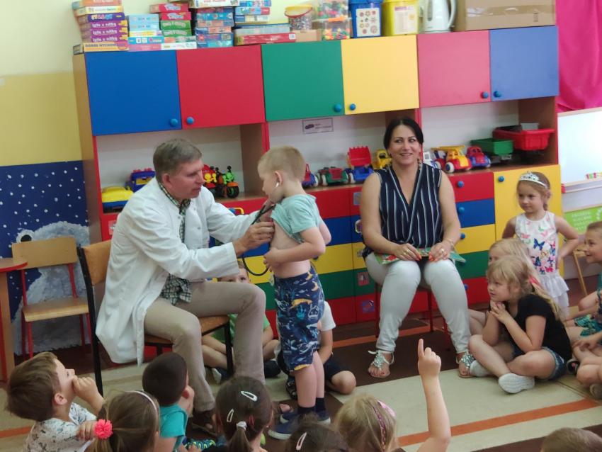 co w nim lubił oraz za czym nie przepadał. Dodatkowo pani Edyta Kozera wraz z dziećmi przeprowadziła krótki wywiad na temat dbania o zdrowie oraz niebezpiecznych sytuacji podczas wakacji. Pan doktor chętnie opowiedział dzieciom o swojej pracy oraz zademonstrował jak działa stetoskop. Serdecznie dziękujemy za odwiedzenie naszego przedszkola.