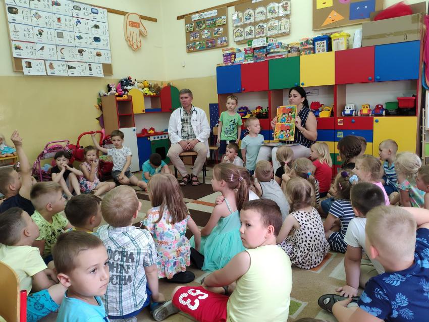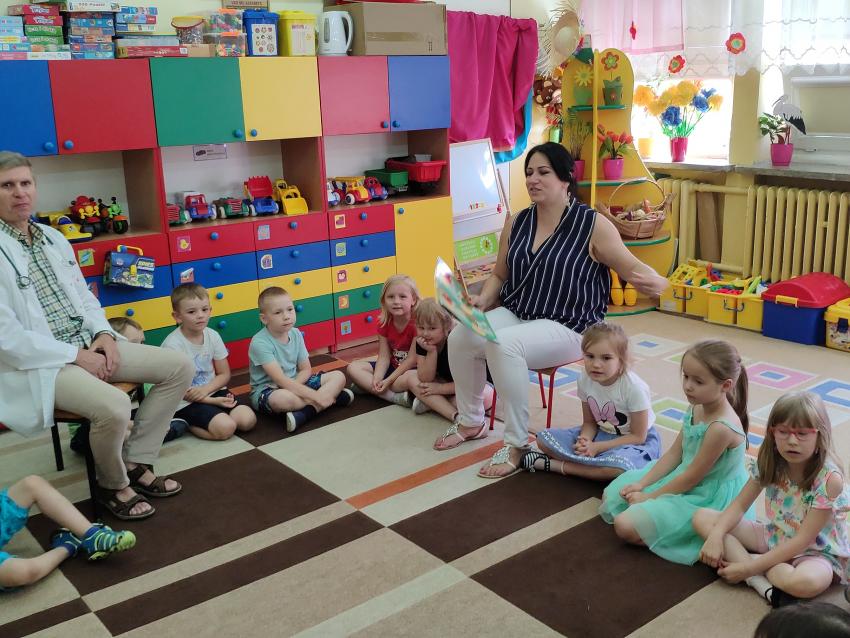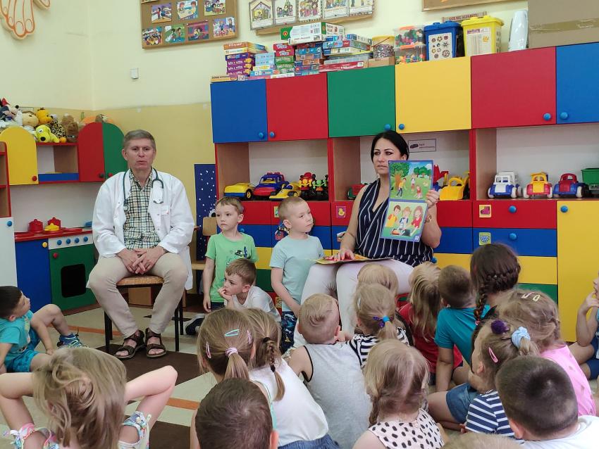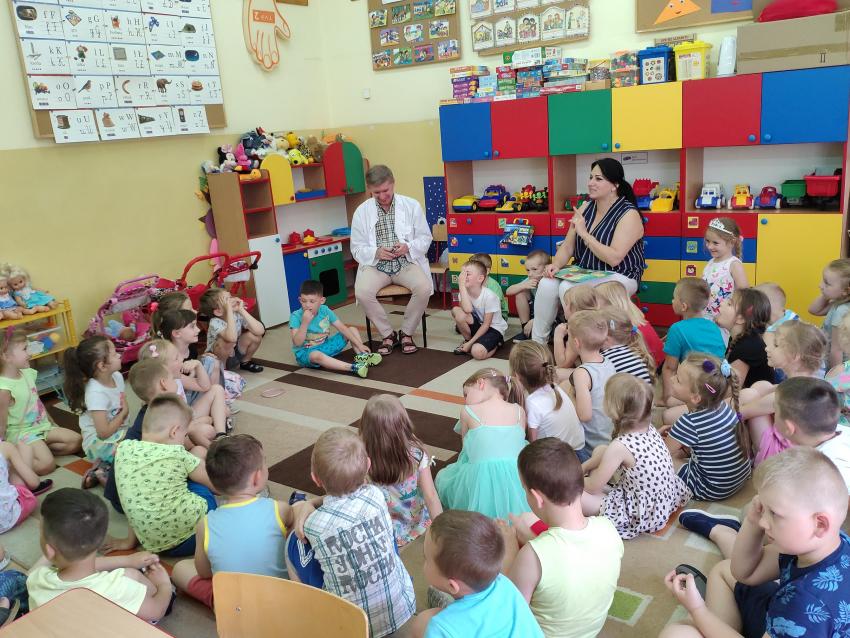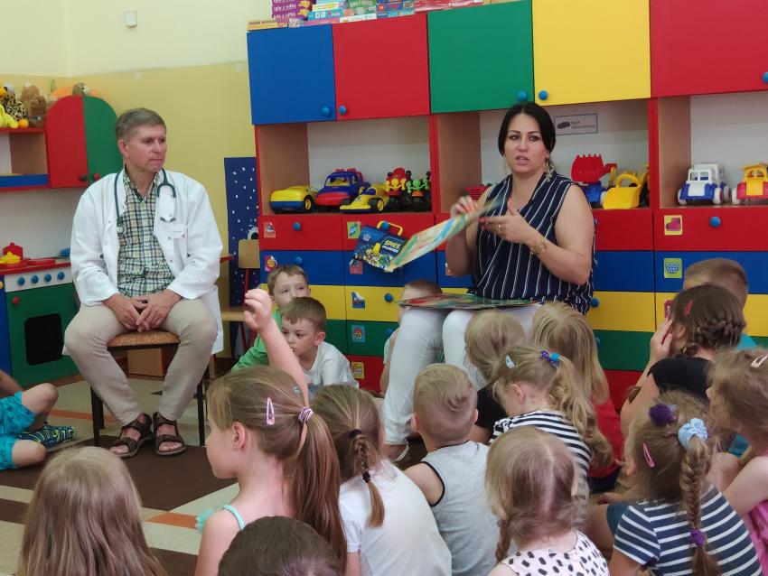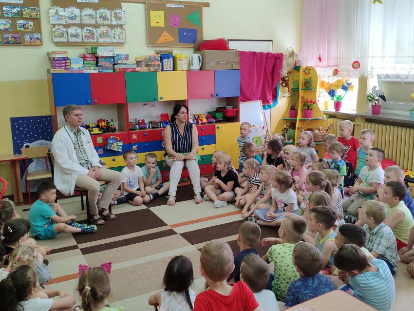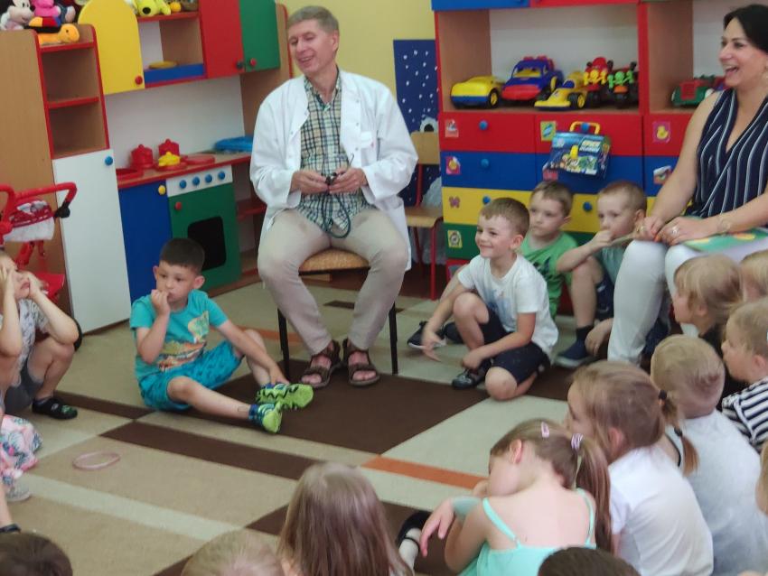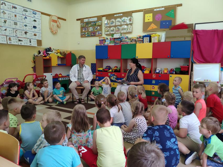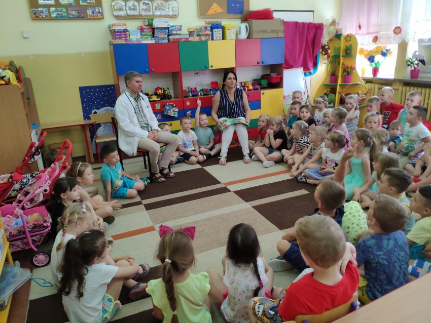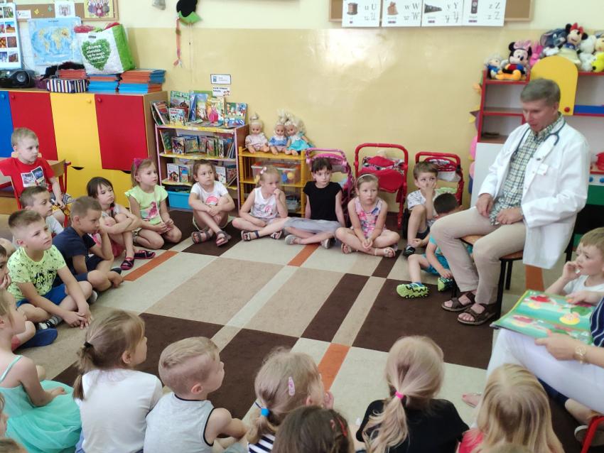 co w nim lubił oraz za czym nie przepadał. Dodatkowo pani Edyta Kozera wraz z dziećmi przeprowadziła krótki wywiad na temat dbania o zdrowie oraz niebezpiecznych sytuacji podczas wakacji. Pan doktor chętnie opowiedział dzieciom o swojej pracy oraz zademonstrował jak działa stetoskop. Serdecznie dziękujemy za odwiedzenie naszego przedszkola.