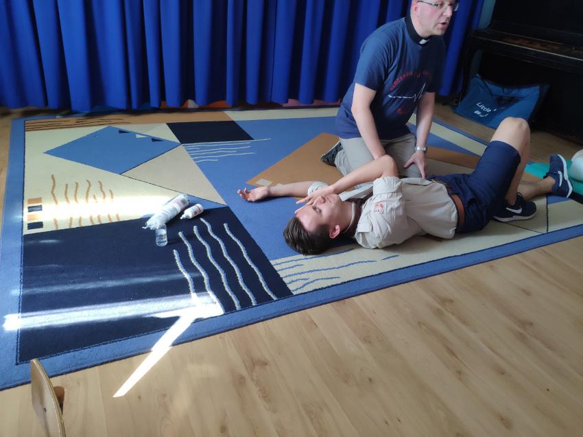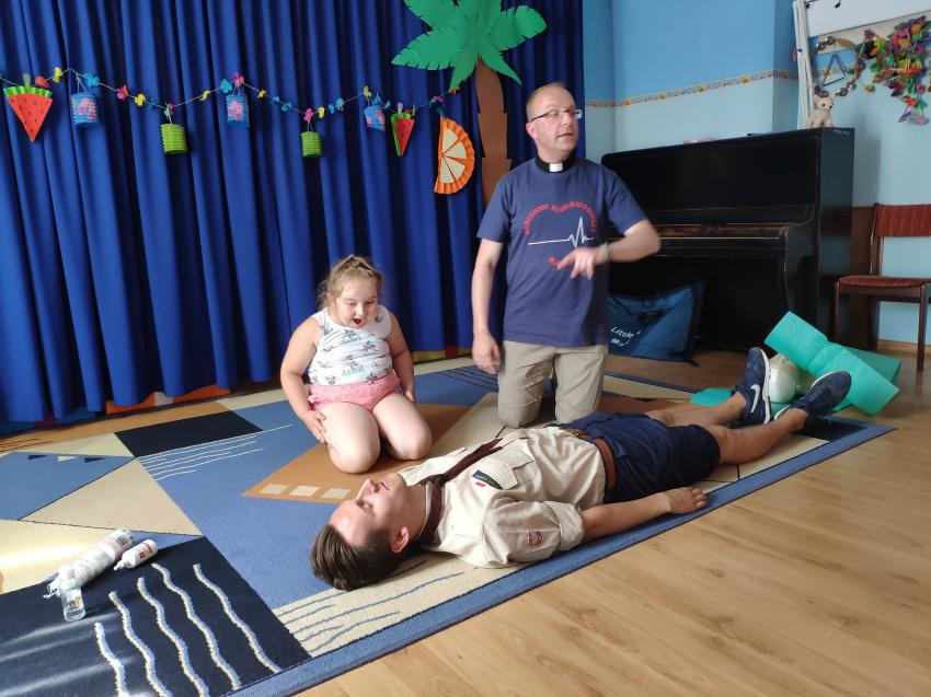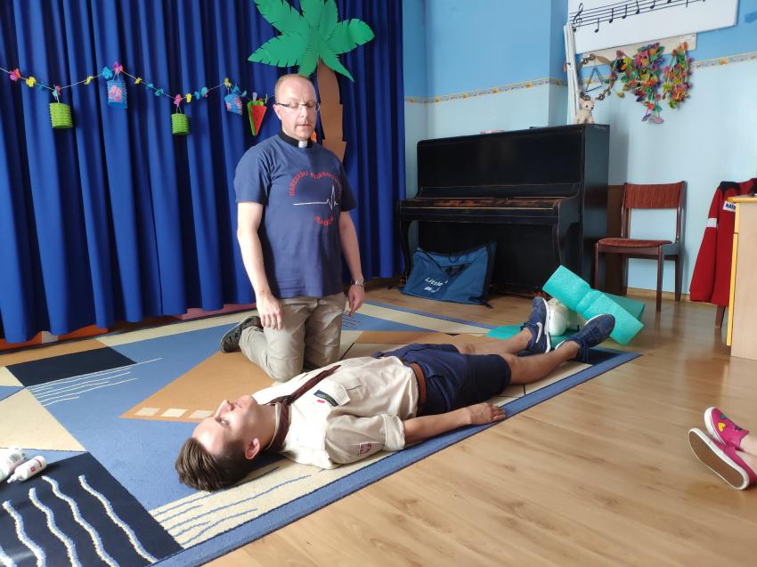 w sytuacji udzielenia pomocy osobom w nagłych przypadkach. Spotkanie prowadził ks. Piotr Woszczyk – posiadający odpowiednie przeszkolenie i kwalifikacje oraz dwóch harcerzy ze Stowarzyszenia Harcerstwa Katolickiego ,,Zawisza” w Radomiu.