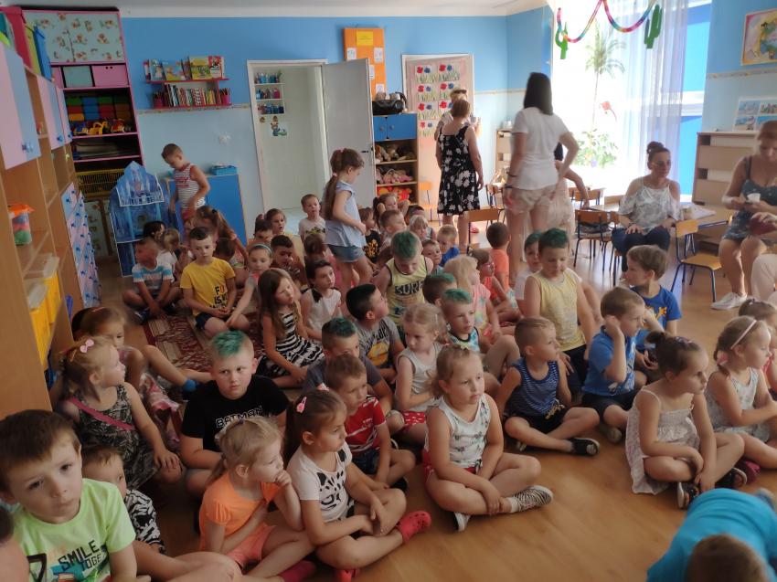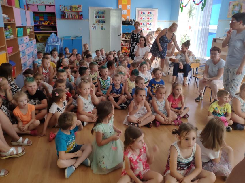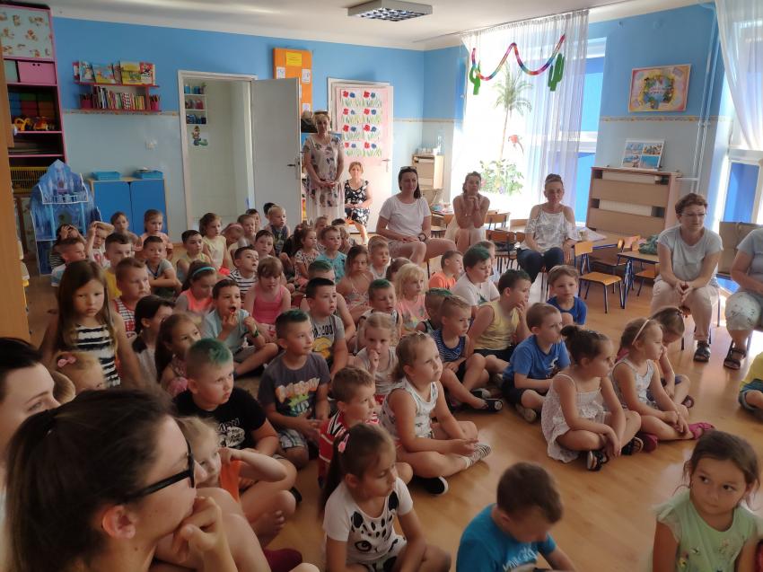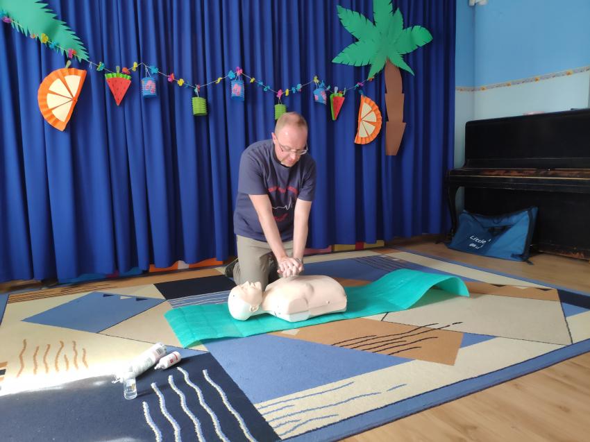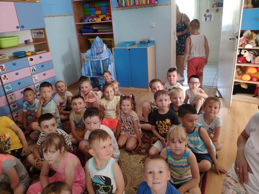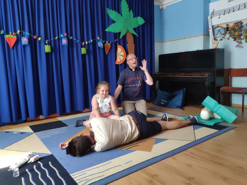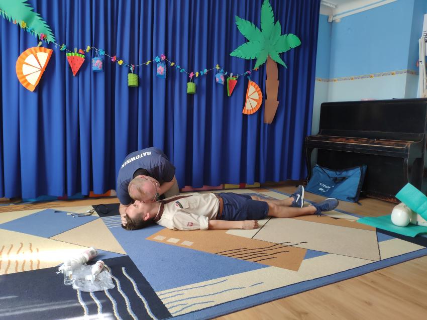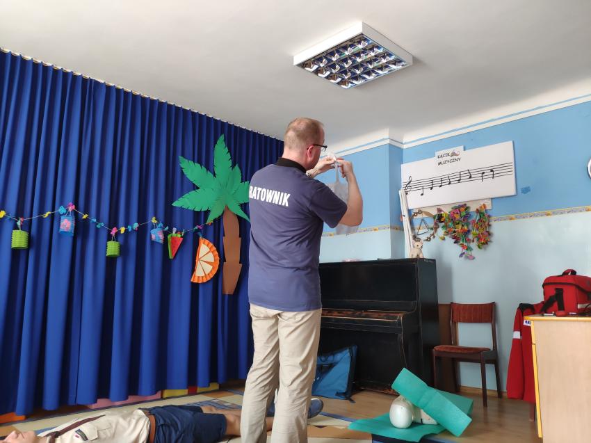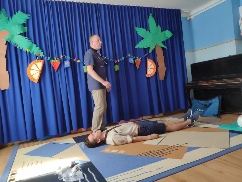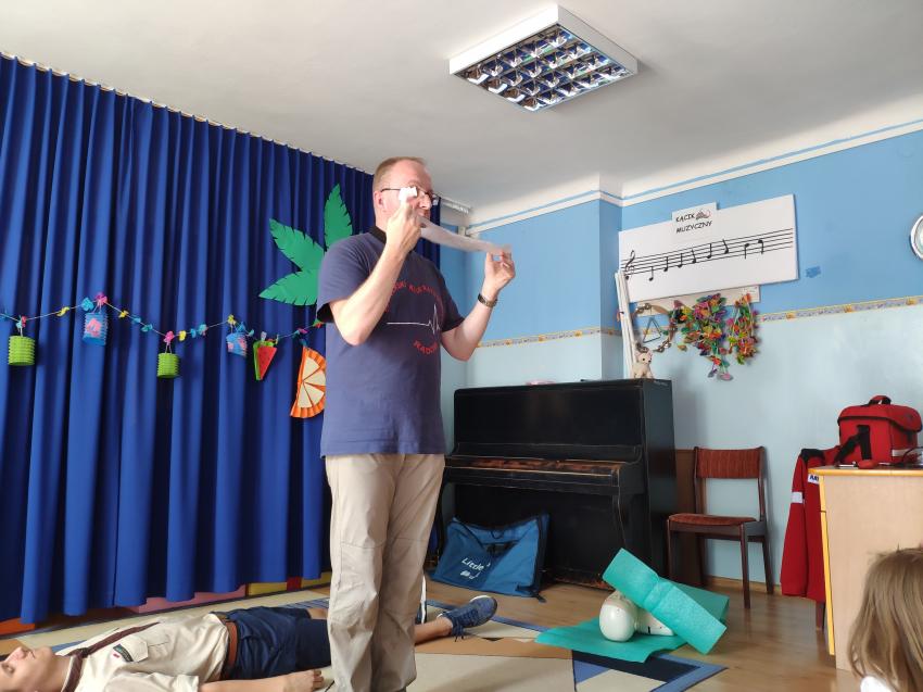 Na początku dzieciom zostały przypomniane zasady bezpiecznego zachowania się w domu, przedszkolu i w czasie pobytu na wakacjach oraz numery alarmowe, następnie prowadzący jeszcze raz omówił zasady wzywania pomocy i zachowania się w sytuacji, w której musimy udzielić poszkodowanemu pomocy. Wyjaśnił i zademonstrował na fantomie jak wygląda: pozycja bezpieczna, jak sprawdzać oznaki życia u osób nieprzytomnych oraz co to jest RKO – czyli resuscytacja krążeniowo-oddechowa i jak prawidłowo ją przeprowadzić. Omówione też zostały zasady opatrywania urazów: skaleczeń, złamań, krwotoków. Dzieci z uwagą , skupieniem i dużym zaciekawieniem słuchały prowadzącego, chętnie udzielały odpowiedzi na pytania i brały udział