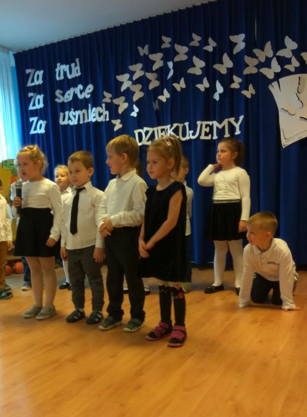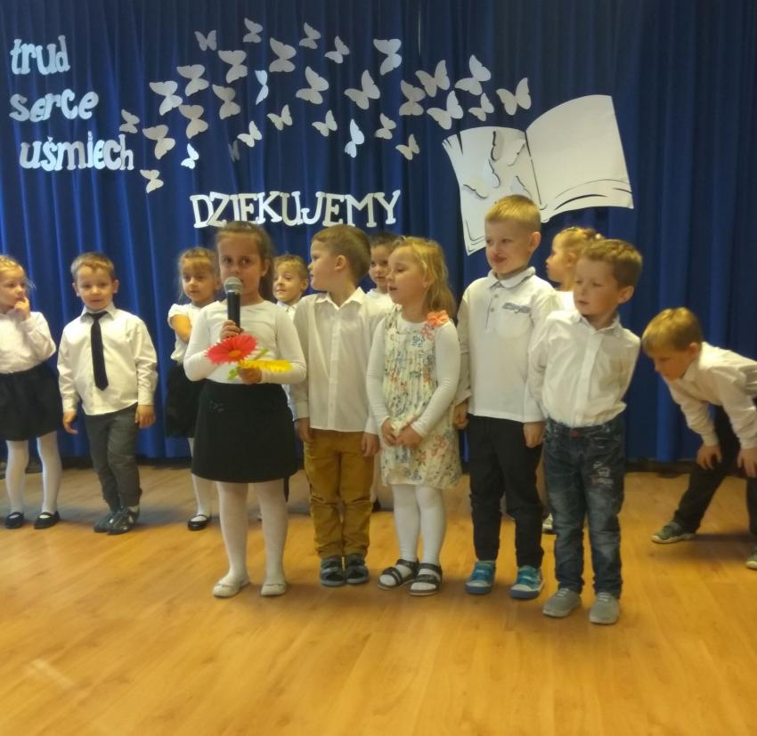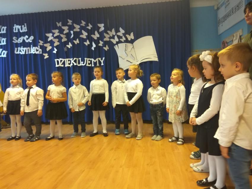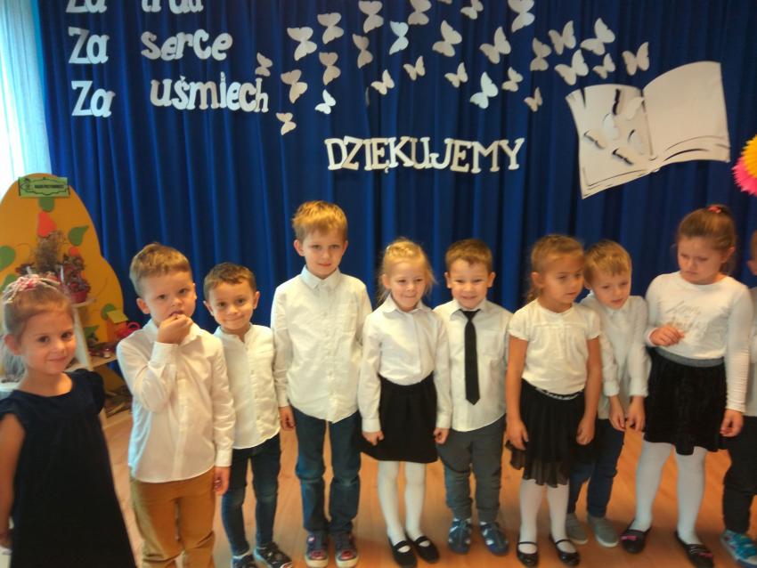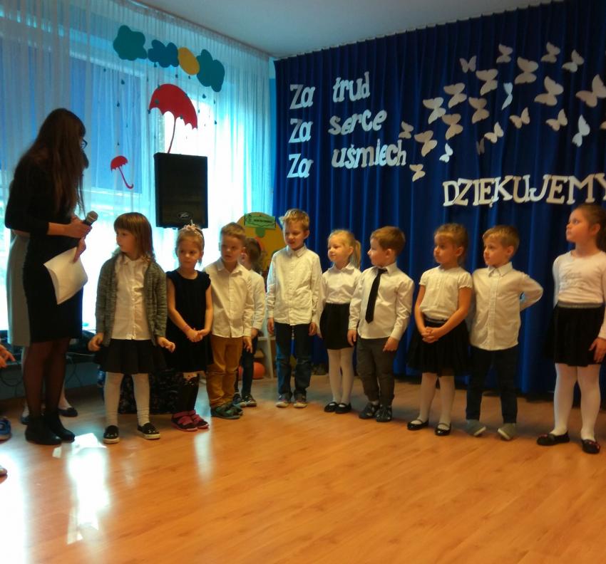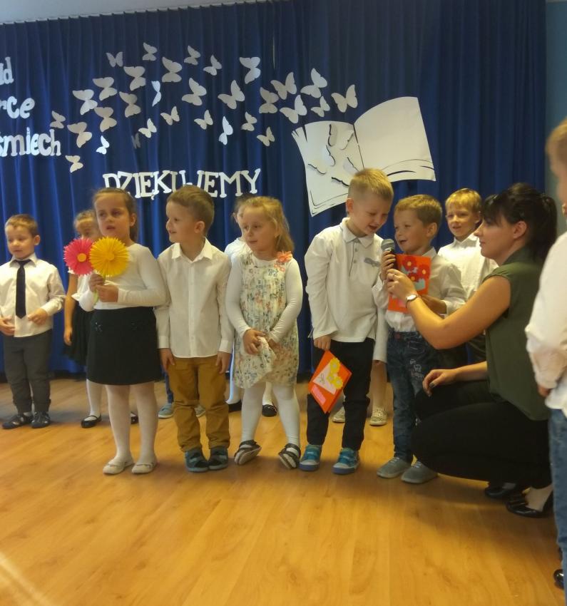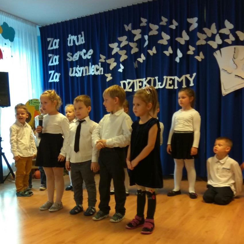 W poniedziałek 14 października dzieci z grupy VI „Motylki” pod kierownictwem wychowawczyń Anny Pęksyk i Małgorzaty Cieślik swoim występem uczciły Dzień Edukacji Narodowej. Przedszkolaki podziękowały swoim ukochanym Paniom i Pracownikom Przedszkola za trud włożony w ich nauczanie i wychowanie. W spotkaniu udział wzięli zaproszeni goście, pracownicy przedszkola , grono pedagogiczne, rodzice i dzieci. Przybyłych gości powitała dyrektor Anna Belowska, która skierowała do wszystkich wiele ciepłych słów oraz życzeń dalszej, owocnej pracy. Nie zabrakło wierszy, życzeń, piosenek, które w całości stworzyły piękne podziękowanie za codzienną, troskę, oddanie i serdeczność, dobre rady, czyste sale, wszelkie naprawy i smaczne posiłki. Na zakończenie pracownicy otrzymali nagrody i kwiaty z rąk dzieci oraz dyrekcji przedszkola. Za część artystyczną przedszkolaki zostały nagrodzone gromkimi brawami. Ten dzień upłynął w miłej i serdecznej atmosferze i na długo pozostanie w naszej pamięci.