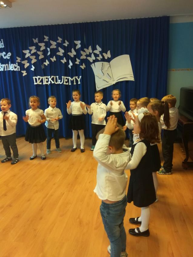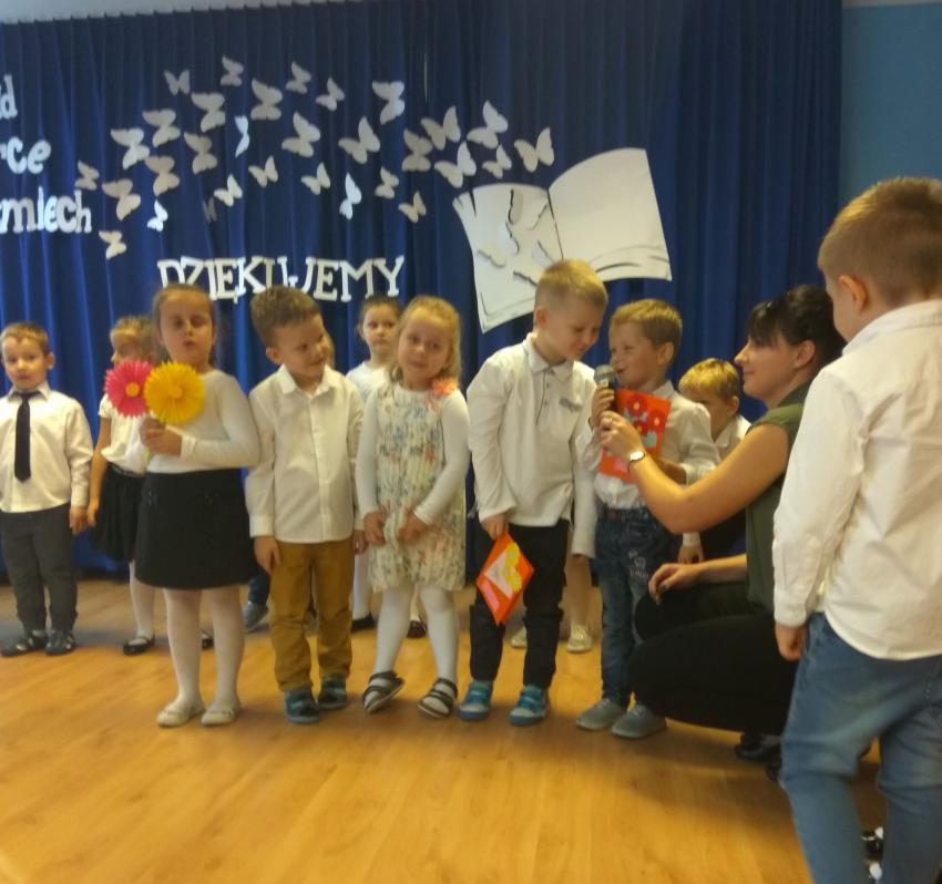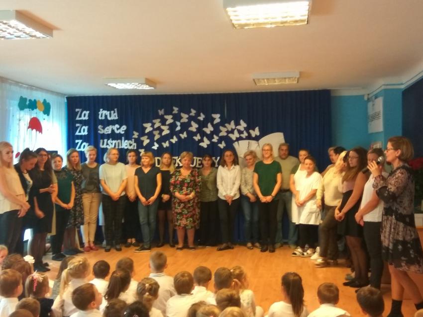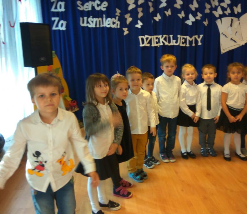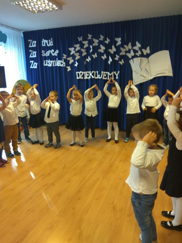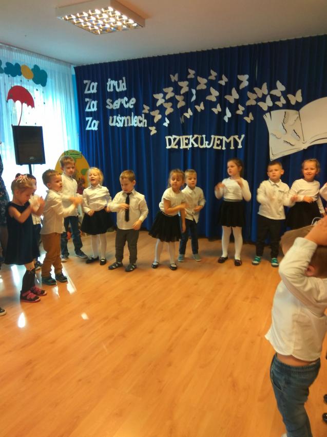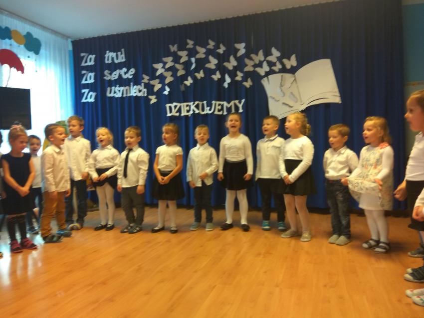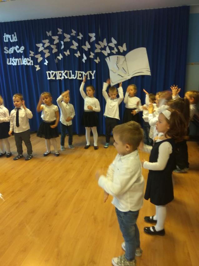 W poniedziałek 14 października dzieci z grupy VI „Motylki” pod kierownictwem wychowawczyń Anny Pęksyk i Małgorzaty Cieślik swoim występem uczciły Dzień Edukacji Narodowej. Przedszkolaki podziękowały swoim ukochanym Paniom i Pracownikom Przedszkola za trud włożony w ich nauczanie i wychowanie. W spotkaniu udział wzięli zaproszeni goście, pracownicy przedszkola , grono pedagogiczne, rodzice i dzieci. Przybyłych gości powitała dyrektor Anna Belowska, która skierowała do wszystkich wiele ciepłych słów oraz życzeń dalszej, owocnej pracy. Nie zabrakło wierszy, życzeń, piosenek, które w całości stworzyły piękne podziękowanie za codzienną, troskę, oddanie i serdeczność, dobre rady, czyste sale, wszelkie naprawy i smaczne posiłki. Na zakończenie pracownicy otrzymali nagrody i kwiaty z rąk dzieci oraz dyrekcji przedszkola. Za część artystyczną przedszkolaki zostały nagrodzone gromkimi brawami. Ten dzień upłynął w miłej i serdecznej atmosferze i na długo pozostanie w naszej pamięci.