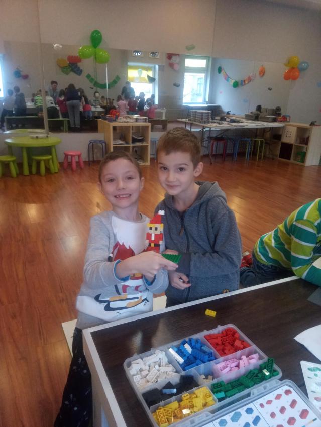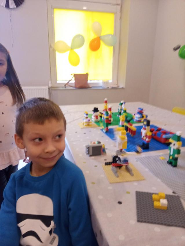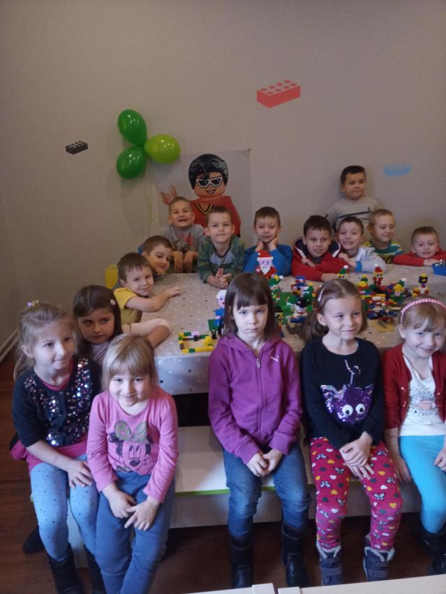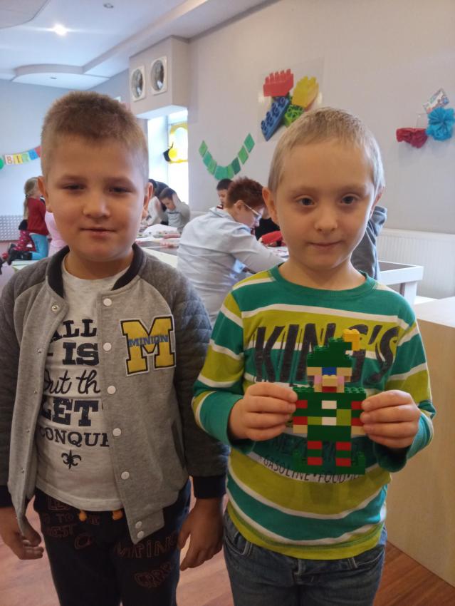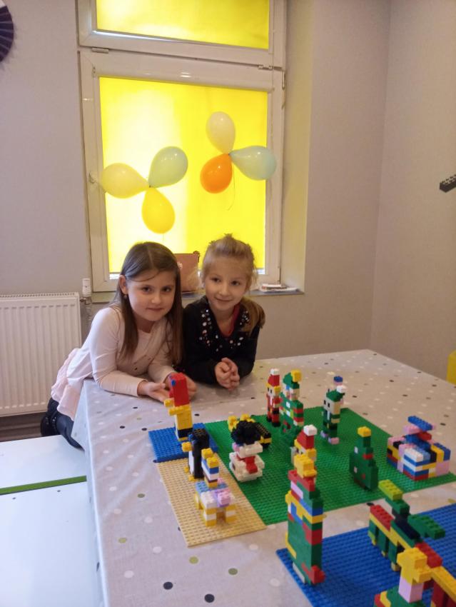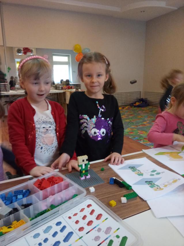 Budowanie z klocków LEGO sprawiło im wiele przyjemności. Dzieci otrzymały instrukcje jak zbudować wybraną zabawkę. Poradziły sobie z tym zadaniem wspaniale. W przerwie animatorki prowadziły wesołe zabawy przy muzyce.
