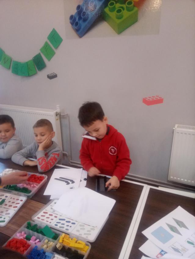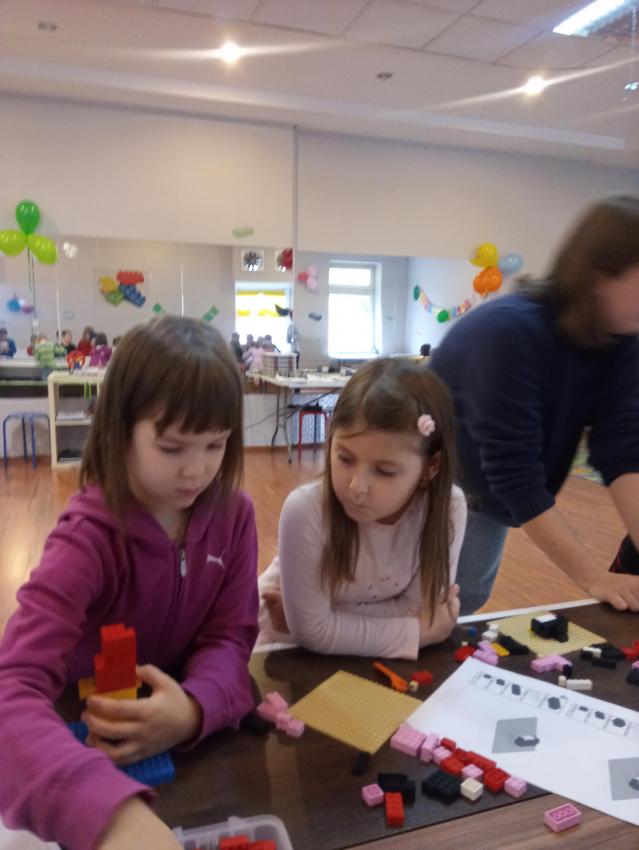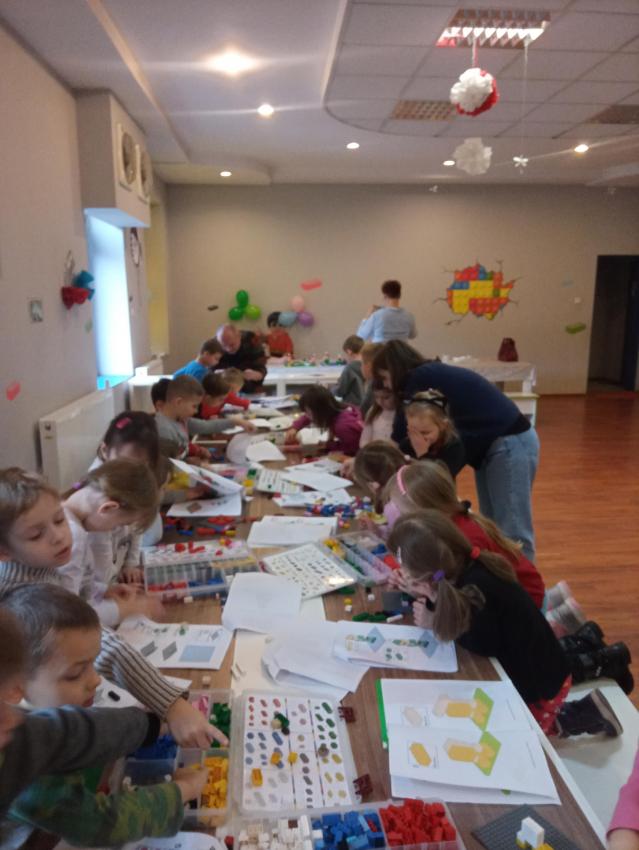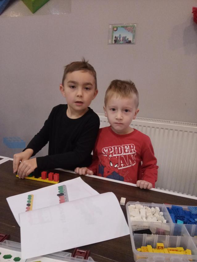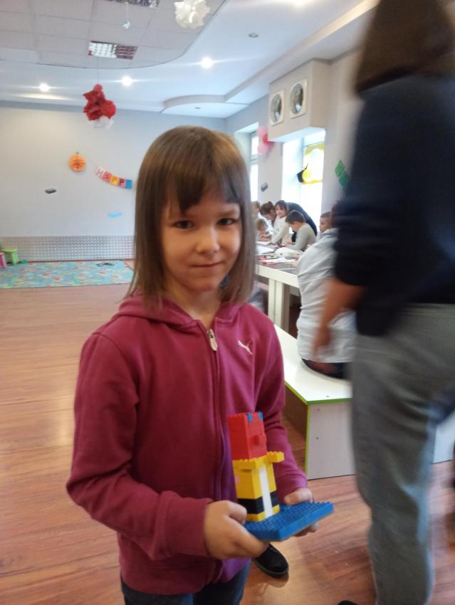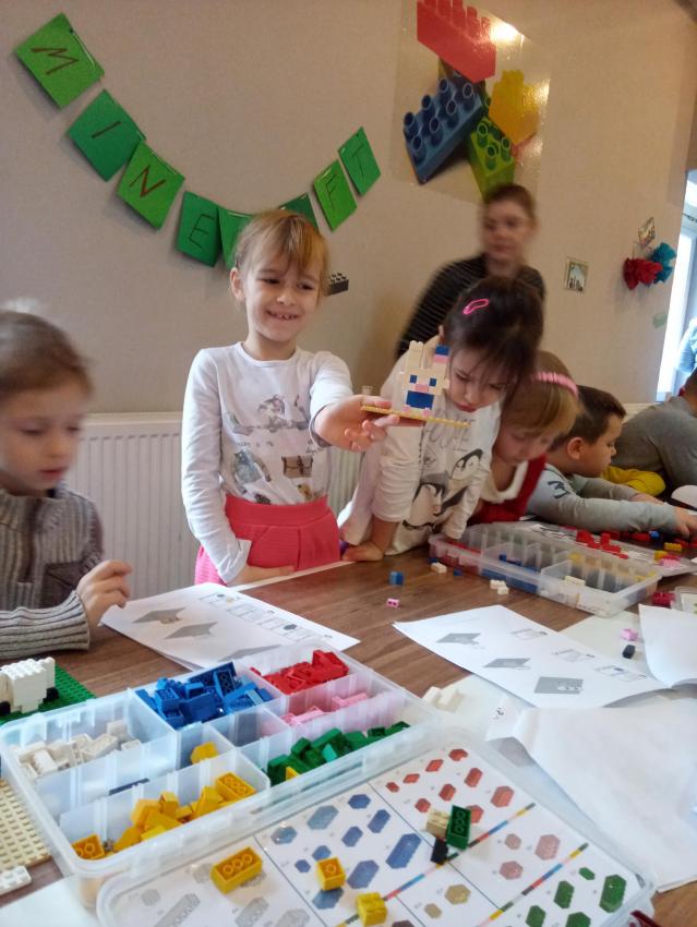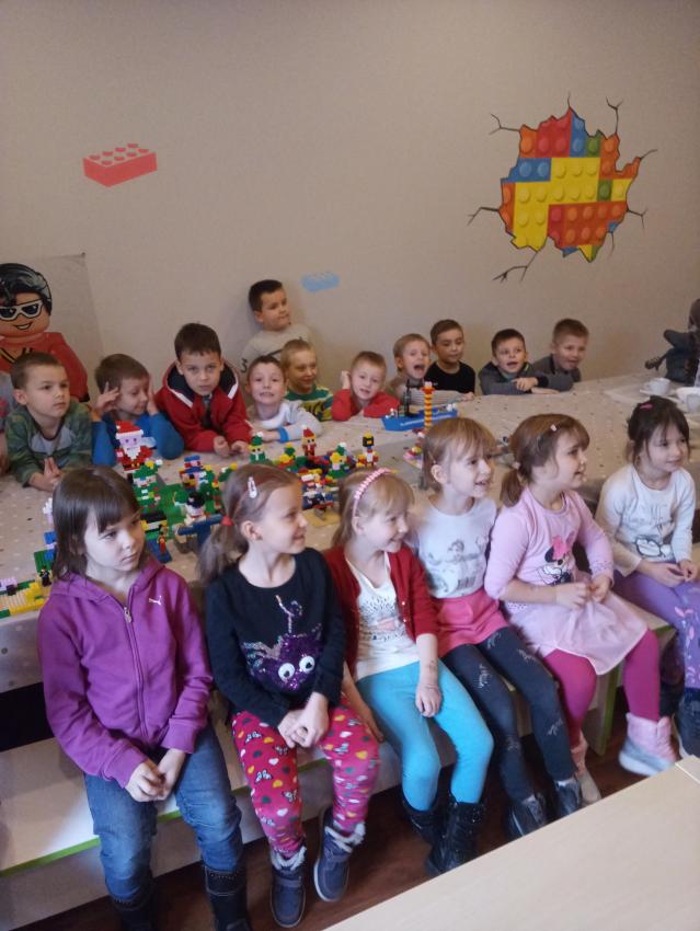 Budowanie z klocków LEGO sprawiło im wiele przyjemności. Dzieci otrzymały instrukcje jak zbudować wybraną zabawkę. Poradziły sobie z tym zadaniem wspaniale. W przerwie animatorki prowadziły wesołe zabawy przy muzyce.