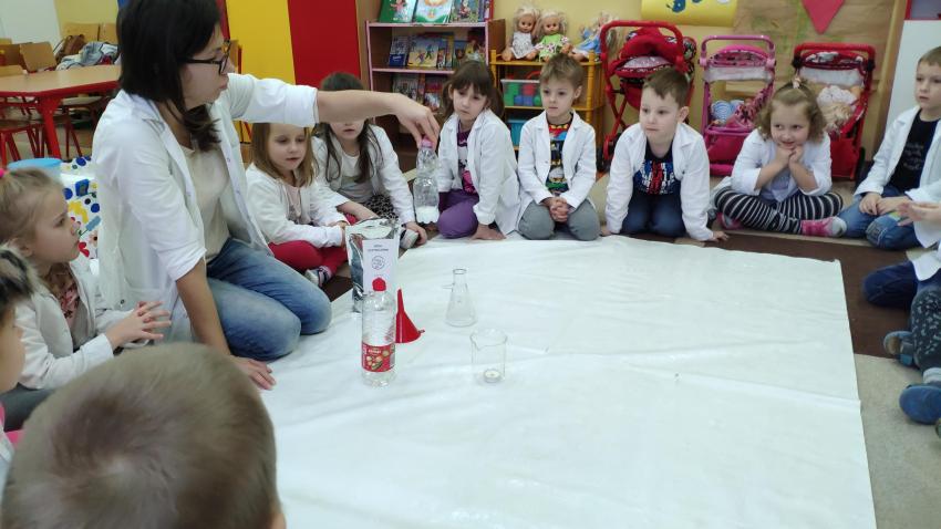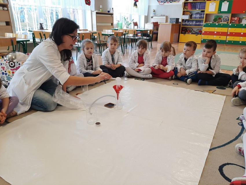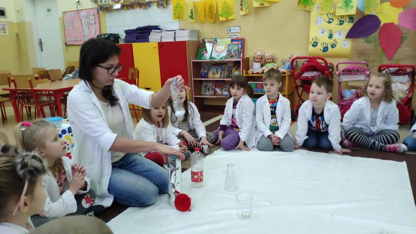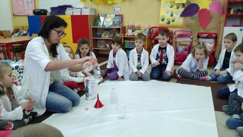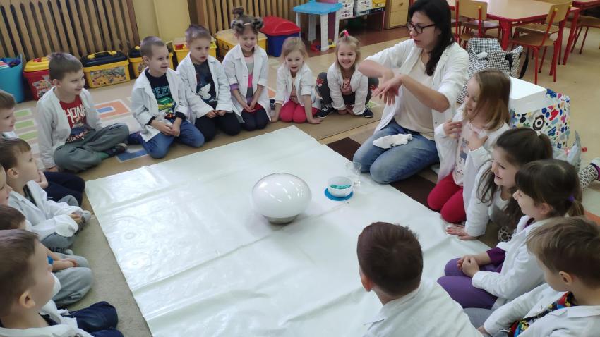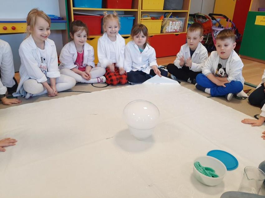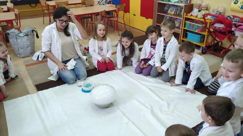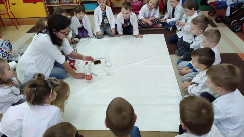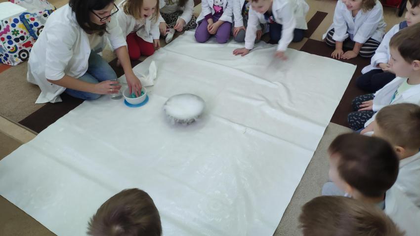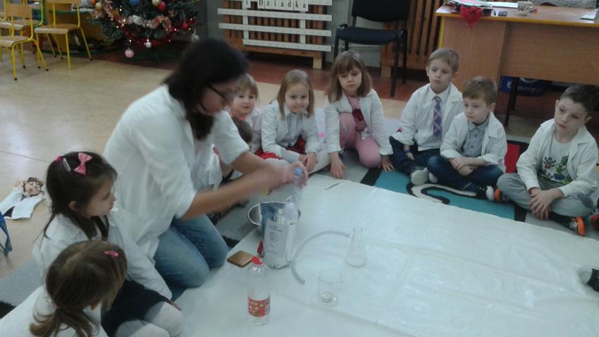W dniach 21 i 22 stycznia odbyły się kolejne spotkania z eksperymentami z cyklu "Mania poznawania". Tym razem dzieci ze wszystkich grup miały okazję poznania gazu występującego w powietrzu „dwutlenku węgla”. Dzieci podczas obserwacji doświadczeń ze świeczką oraz sodą i octem poznały właściwości tego gazu. Wielkie wrażenie wywarła na przedszkolakach prezentacja suchego lodu oraz magicznych sztuczek, które miały okazje oglądać m.in. powstawanie bańki. Śmiało można zatem stwierdzić, że było to kolejne udane spotkanie z nauką.