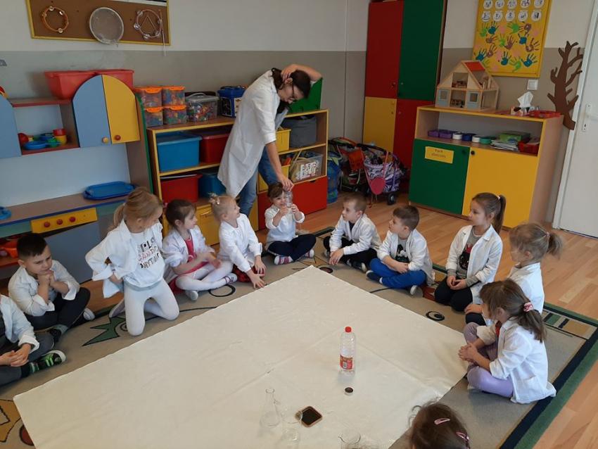 W dniach 21 i 22 stycznia odbyły się kolejne spotkania z eksperymentami z cyklu "Mania poznawania". Tym razem dzieci ze wszystkich grup miały okazję poznania gazu występującego w powietrzu „dwutlenku węgla”. Dzieci podczas obserwacji doświadczeń ze świeczką oraz sodą i octem poznały właściwości tego gazu. Wielkie wrażenie wywarła na przedszkolakach prezentacja suchego lodu oraz magicznych sztuczek, które miały okazje oglądać m.in. powstawanie bańki. Śmiało można zatem stwierdzić, że było to kolejne udane spotkanie z nauką.