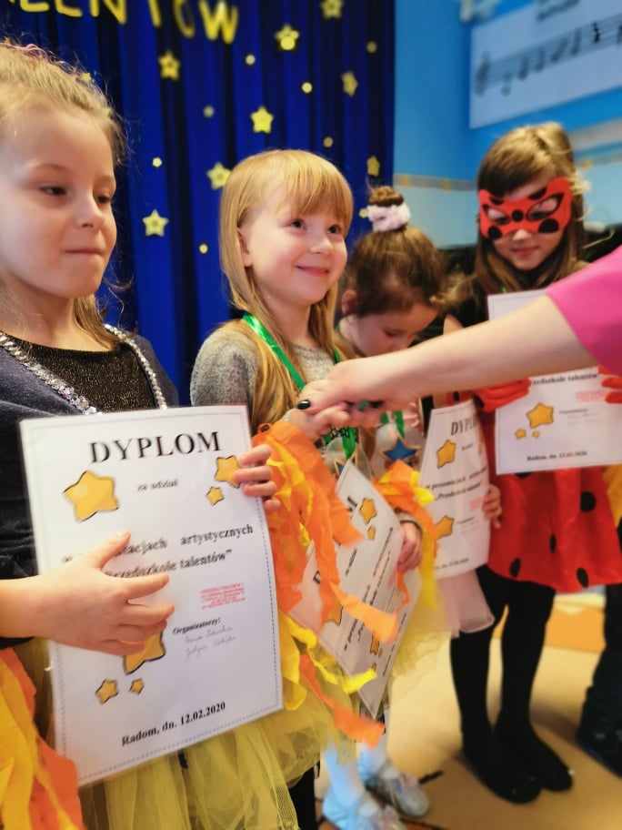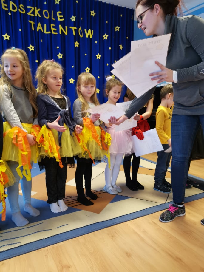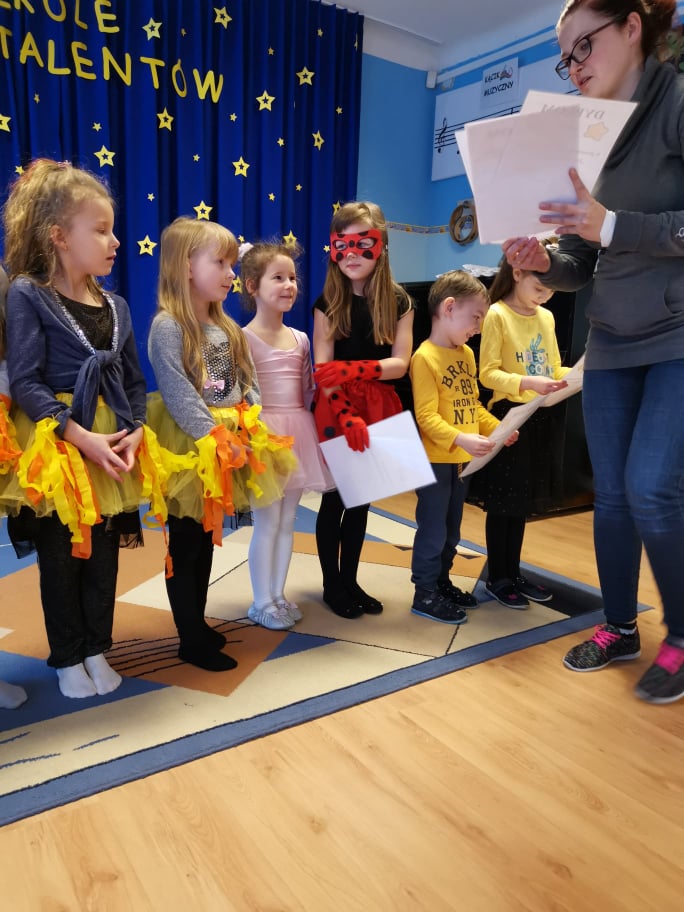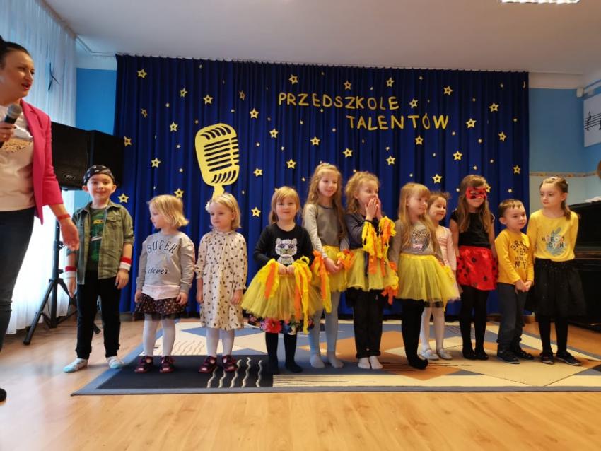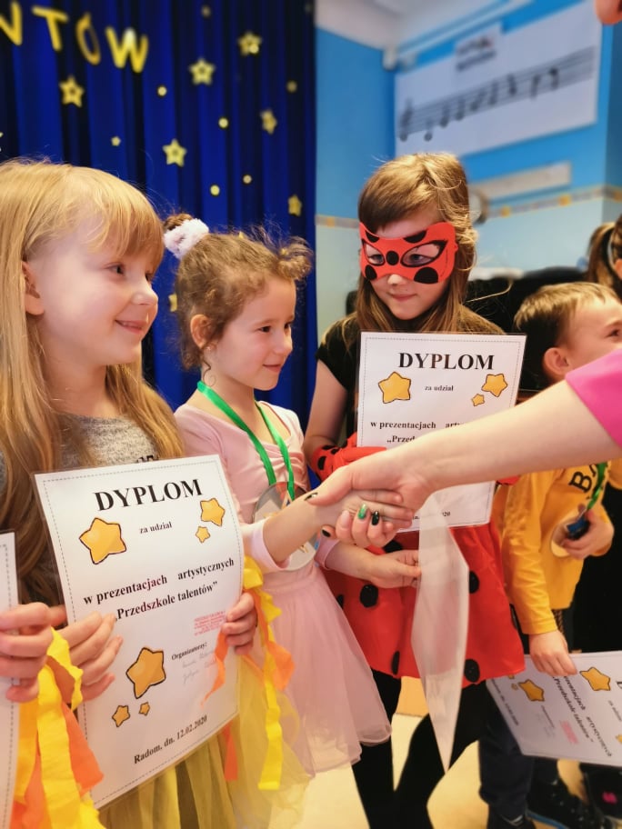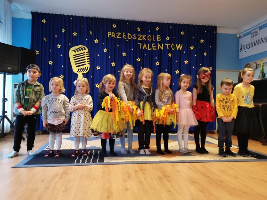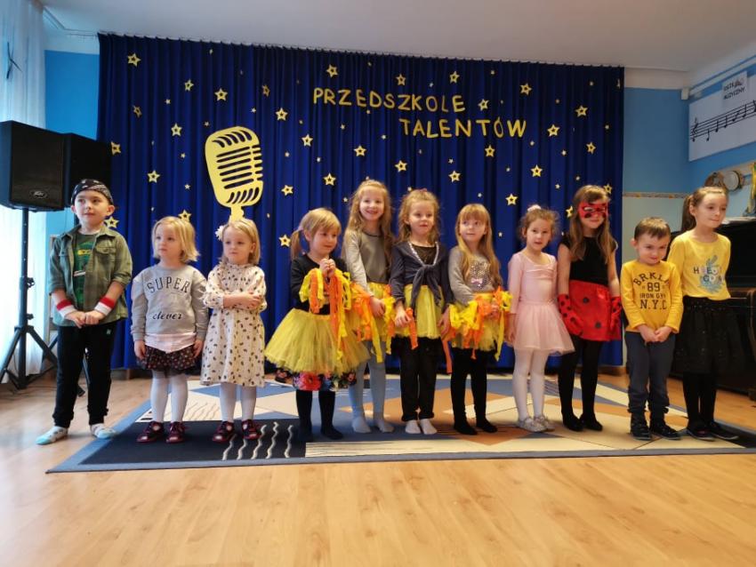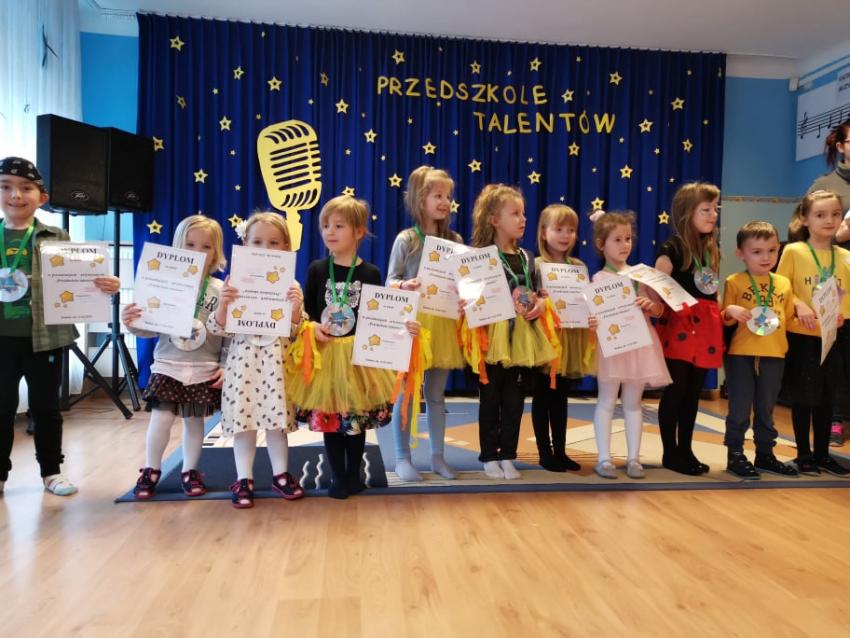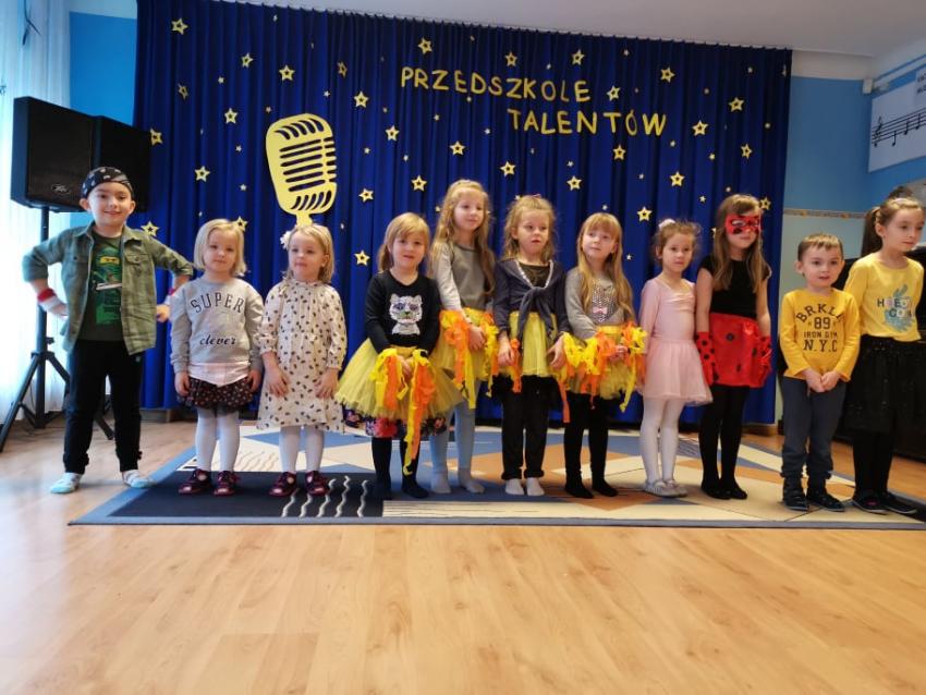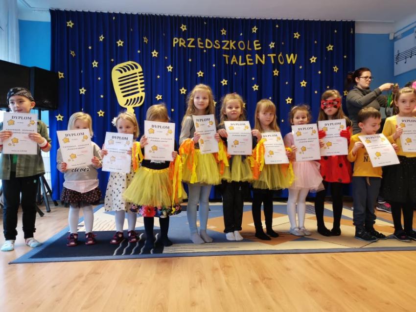 W lutym została zorganizowana przedszkolna edycja prezentacji artystycznych „Przedszkole Talentów”. Zgłosiło się 12 dzieci, aby zaprezentować swoje zdolności i talenty. Emilka i Ola z grupy II "Zajączków" śpiewały piosenki, Lena z grupy IX "Misiów" recytowała wiersz. Filip M. zaprezentował się w tańcu nowoczesnym, a także był choreografem do tańca koleżanek z grupy VII "Pszczółek", które również śpiewały piosenkę. Zosia z grupy V "Myszek" przepięknie zatańczyła układ baletowy. Olek z grupy III "Kotków" wykonał eksperyment, w którym bez użycia powietrza napompował balon. Wszyscy byli zachwyceni. Na koniec Łucja z grupy IX "Misiów" opowiedziała bajkę o misiach, którą sama wymyśliła. Za piękne prezentacje dzieci otrzymały dyplomy, medale, płyty z bajkami oraz drobne upominki.
