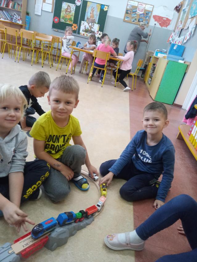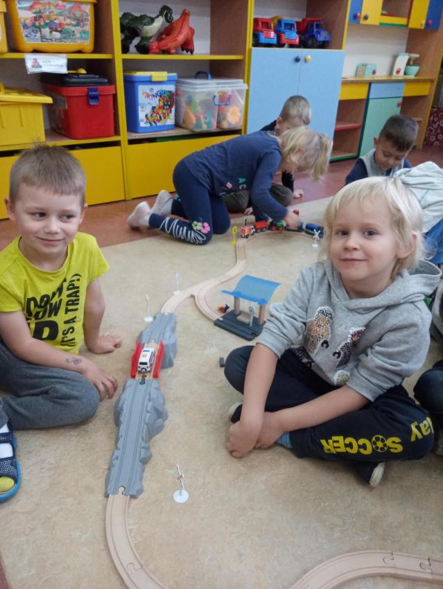 W prezencie dostali kolejkę drewnianą na baterie oraz pudełko klocków.