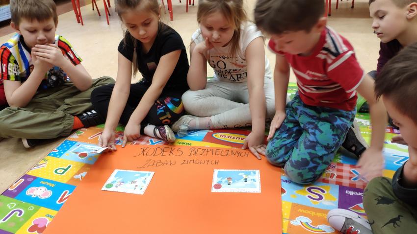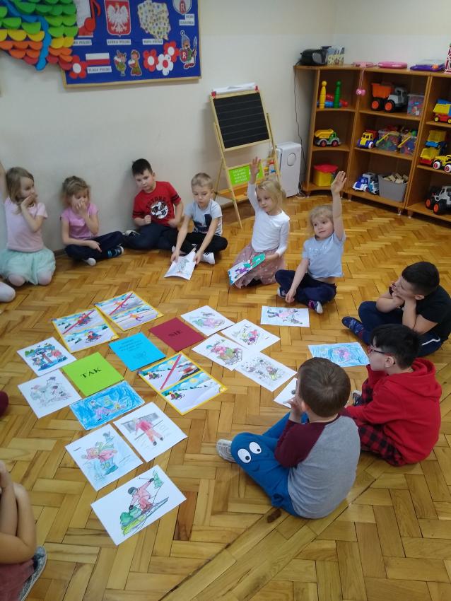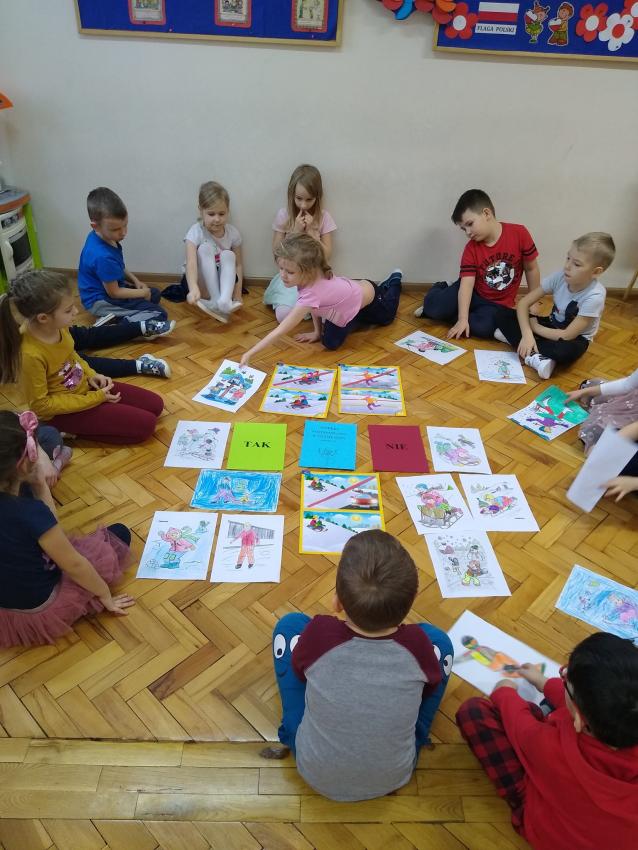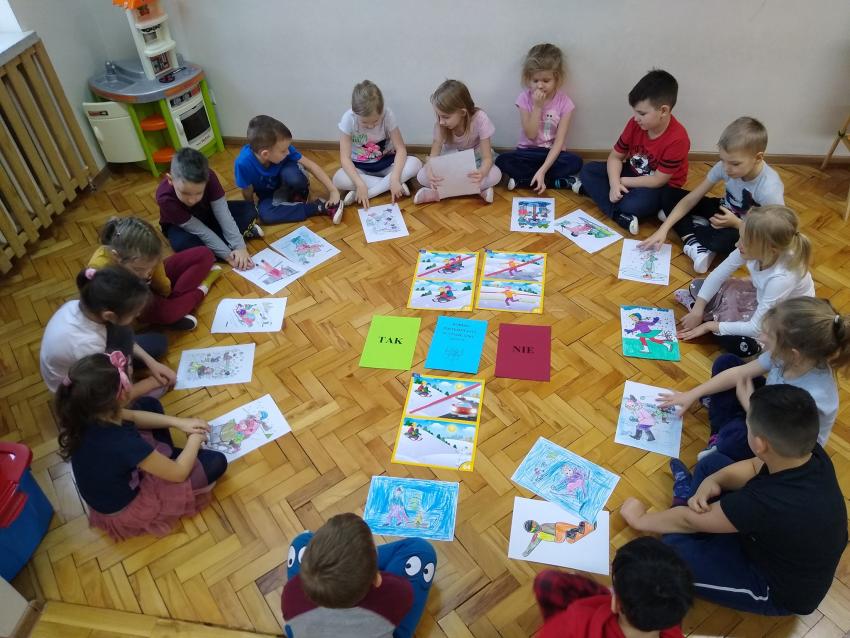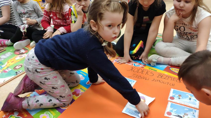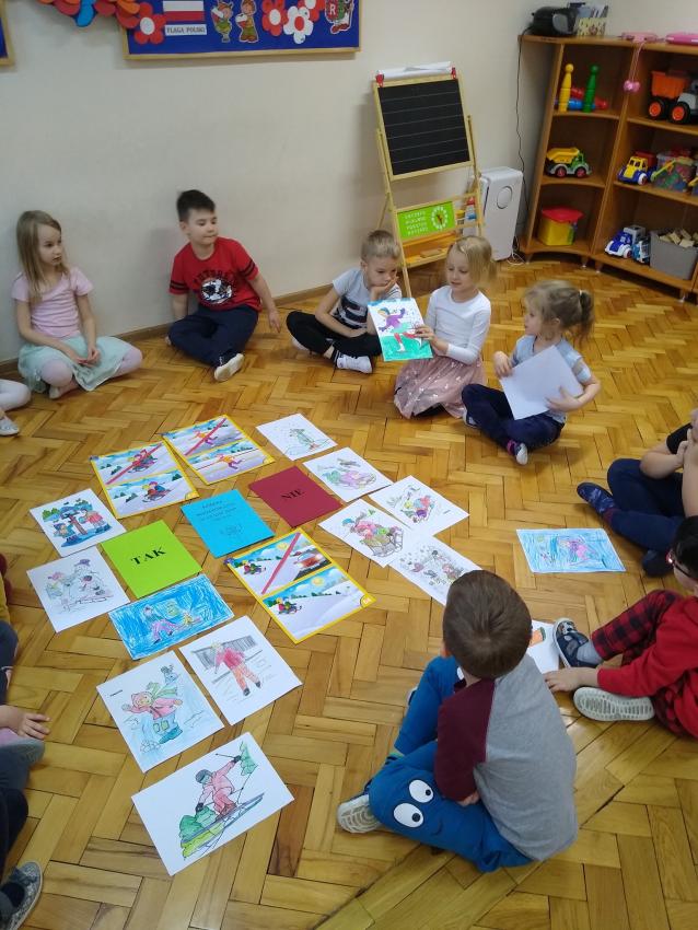 Ostatnie dni pokazały nam, że zima jeszcze istnieje i z tej okazji warto przypomnieć zasady bezpiecznych zabaw na śniegu. Przedszkolaki w ramach programu edukacyjno – wychowawczego „Jestem bezpieczny” obejrzały film pt. „Jedynkowe przedszkole -bezpieczna zima”, poznały piosenkę „Ostrożnie zimą”, wysłuchały bajki „ Zimowe szaleństwo”. Podsumowaniem ich wiedzy na temat bezpiecznych zabaw zimowych było utworzenie przez dzieci KODEKSU POSTĘPOWANIA PODCZAS ZIMY oraz zabawa z wykorzystaniem lizaków – TAK/NIE lub emotikonków wesoła/smutna buźka.