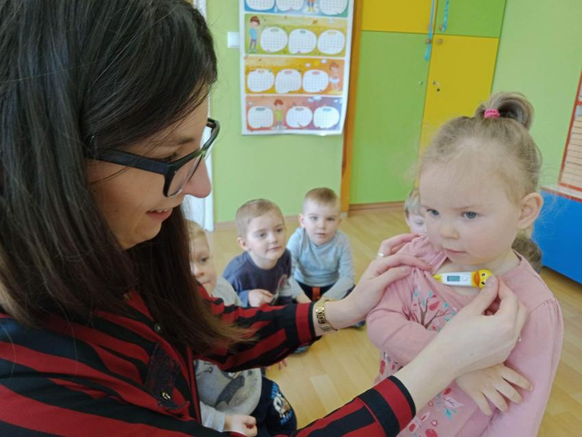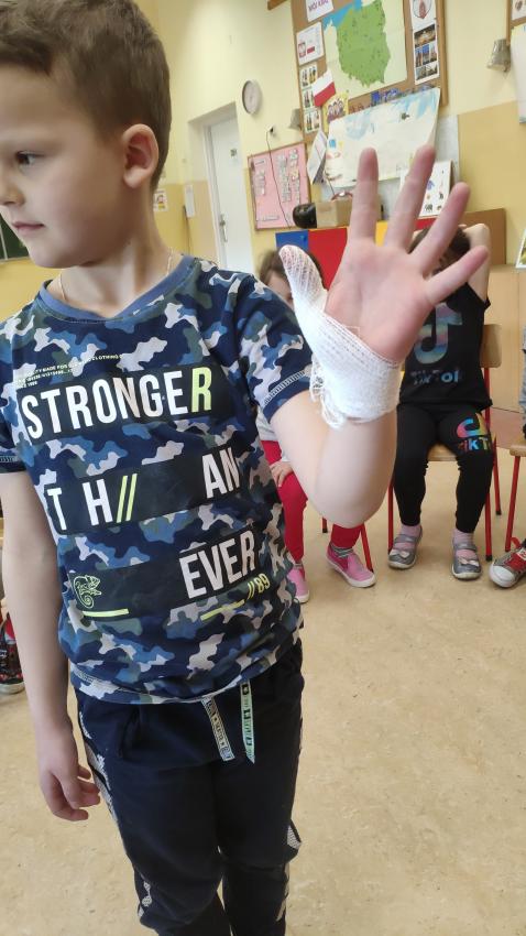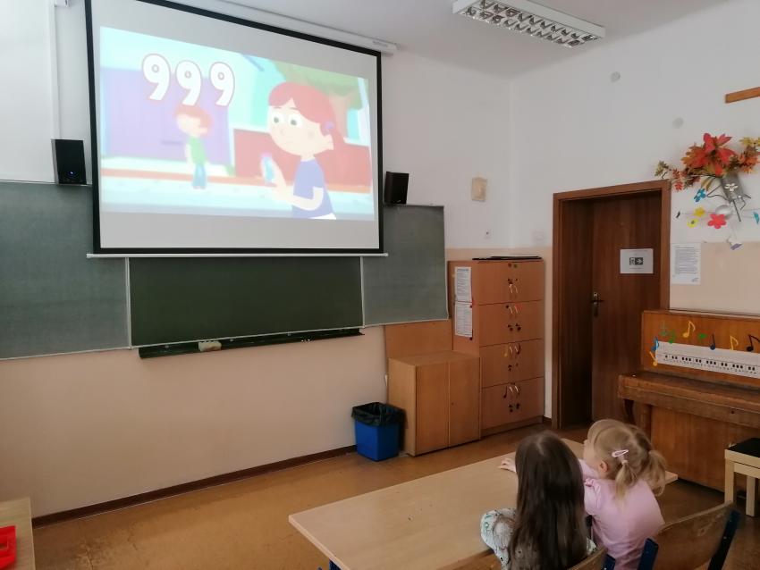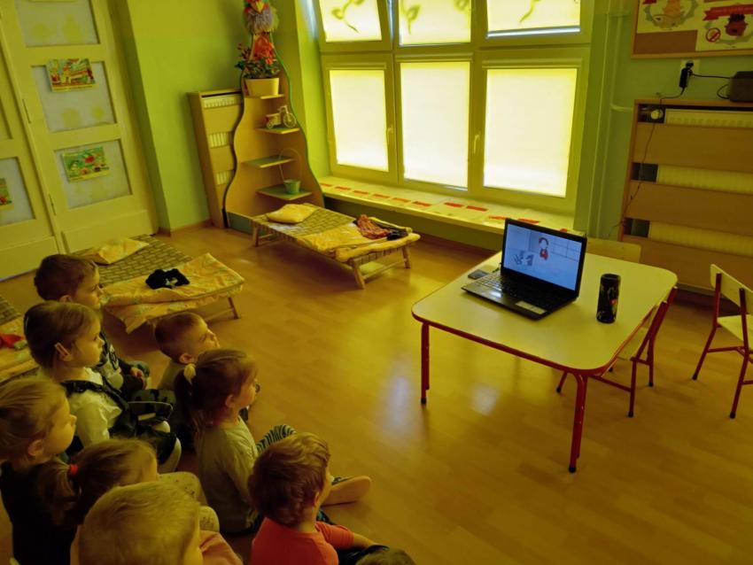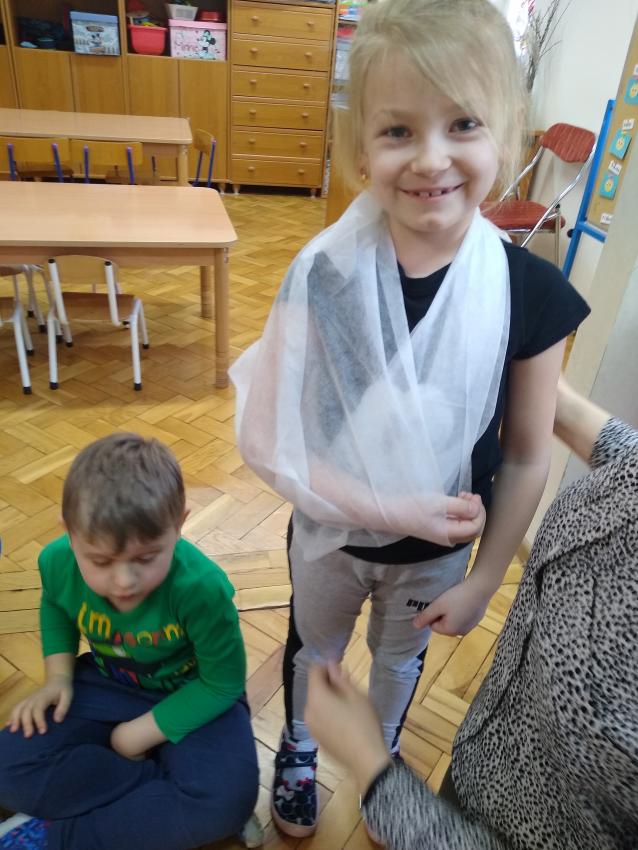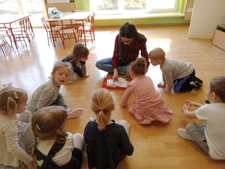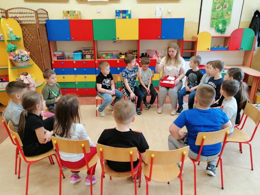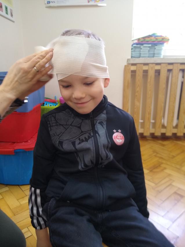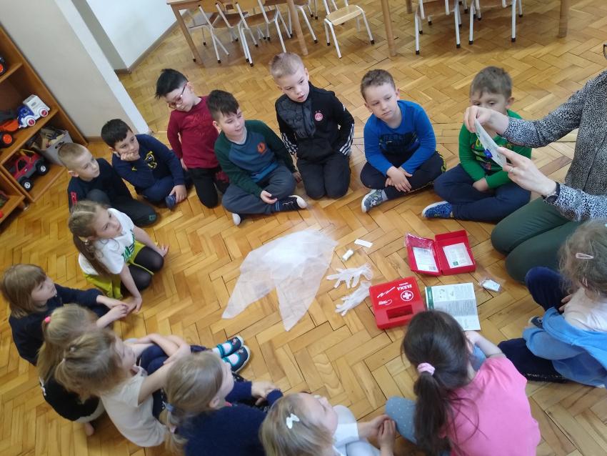 W kwietniu przedszkolaki w ramach realizacji zadań programu edukacyjno- wychowawczego „JESTEM BEZPIECZNY” obejrzały film edukacyjny „Pierwsza Pomoc”, przypomniały sobie numery alarmowe oraz zapoznały się z zawartością apteczki. Działaniom tym towarzyszyła piosenka „Karetka pogotowia”, którą jak się okazało dzieci bardzo dobrze już znały.
