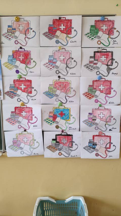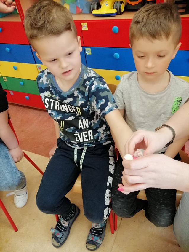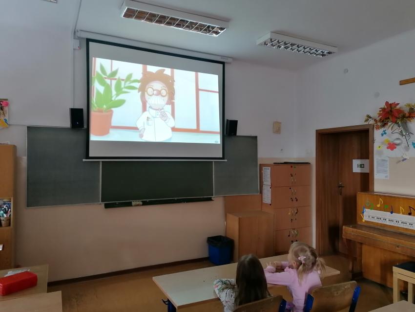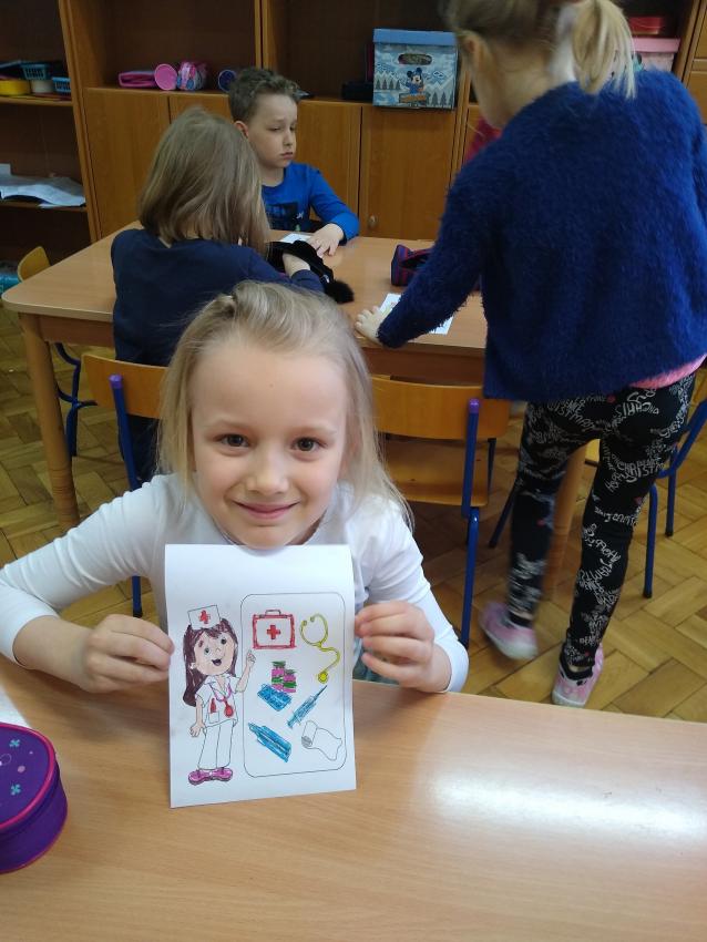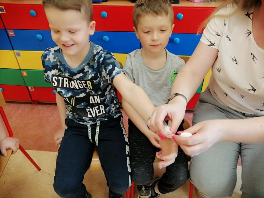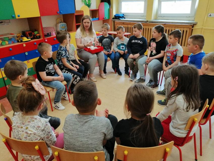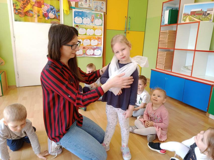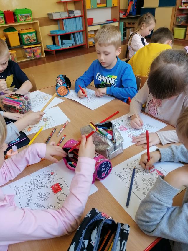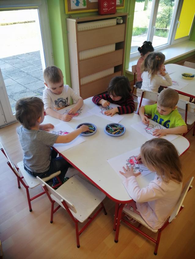 W kwietniu przedszkolaki w ramach realizacji zadań programu edukacyjno- wychowawczego „JESTEM BEZPIECZNY” obejrzały film edukacyjny „Pierwsza Pomoc”, przypomniały sobie numery alarmowe oraz zapoznały się z zawartością apteczki. Działaniom tym towarzyszyła piosenka „Karetka pogotowia”, którą jak się okazało dzieci bardzo dobrze już znały.