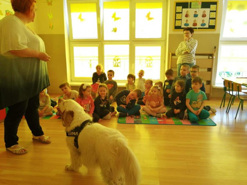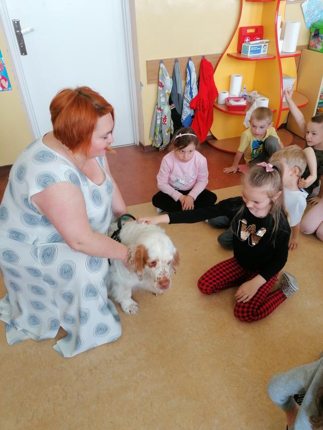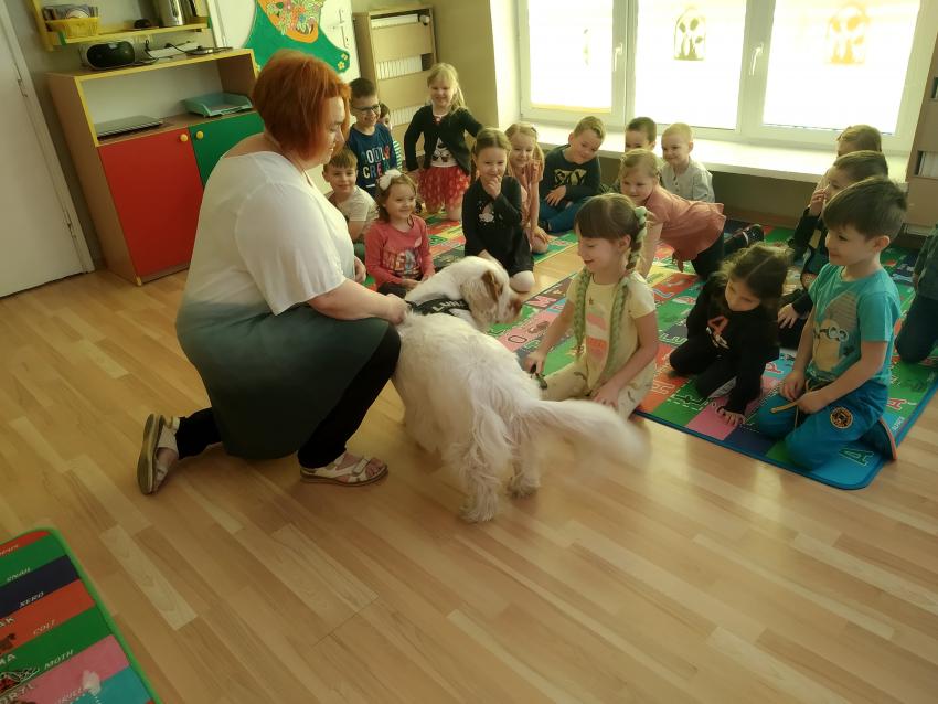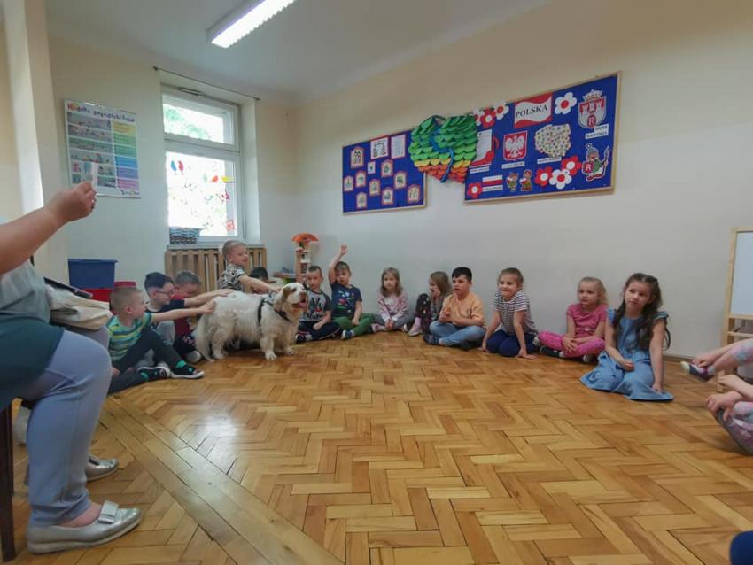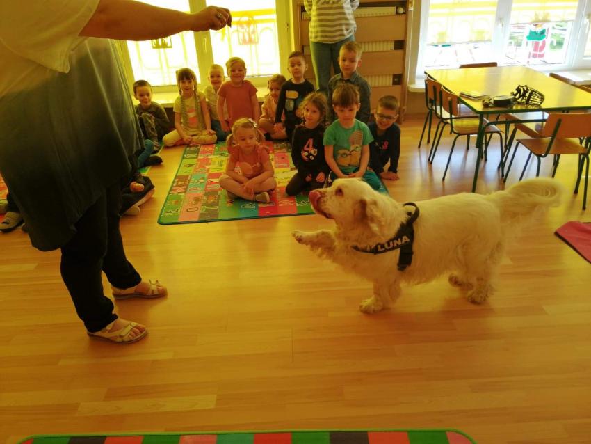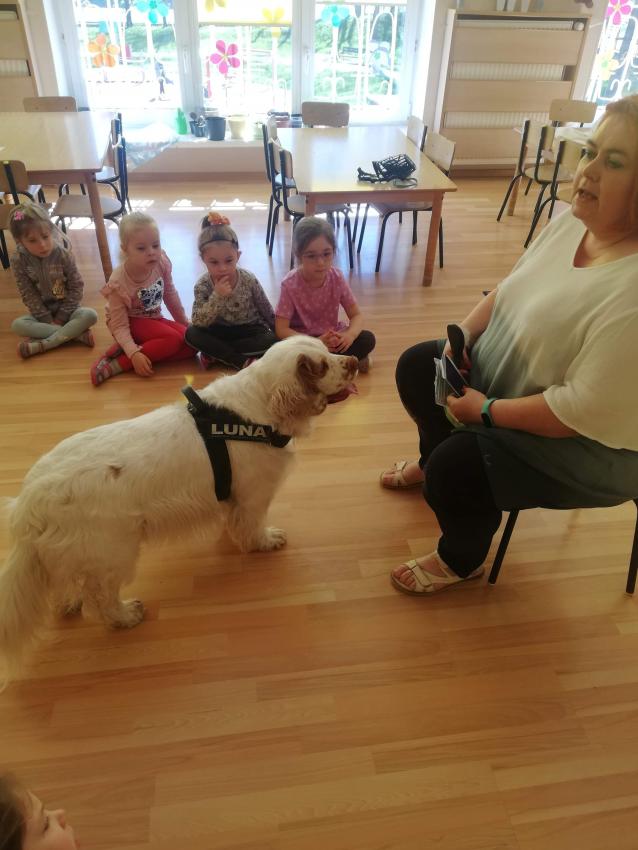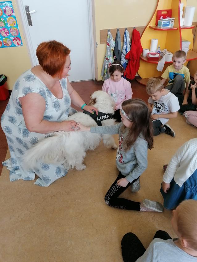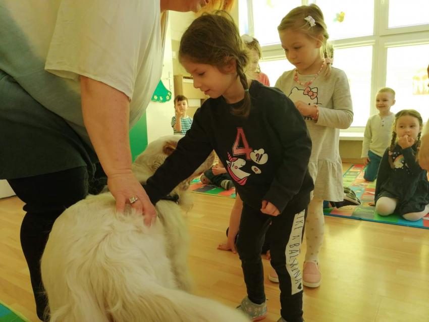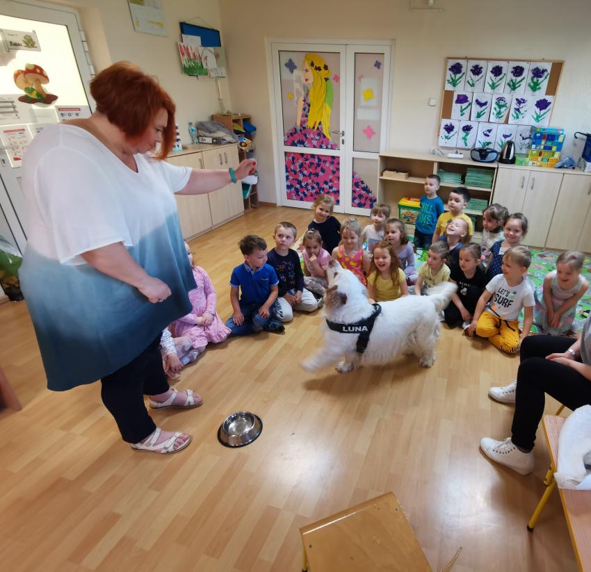 Realizując majowe zadania w ramach programu edukacyjno- wychowawczego „JESTEM BEZPIECZNY” dzieci miały niezwykłą okazję spotkać się z dogoterapeutą oraz przepięknym psem „Luną”. Przedszkolaki dowiedziały się jak należy zachowywać się w obecności psa, czego nie należy robić oraz jak należy dbać o czworonożnego przyjaciela. Oczywiście nie zabrakło prezentacji umiejętności „Luny” oraz chwili na którą wszyscy czekali- możliwości bezpośredniego kontaktu z pieskiem. Jednak to nie wszystkie zadania jakie wykonały dzieci. Nauczycielki zapoznały dzieci z opowiadaniem autorstwa P. Gabrysza „Zuzia i Nero”, zaprezentowały „pozycję żółwia” – najbezpieczniejszą pozycję, jaką należy przyjąć w przypadku ataku psa oraz prezentację multimedialną na temat wybranych zwierząt domowych, ich zwyczajów oraz prawidłowych sposobów opieki nad nimi.