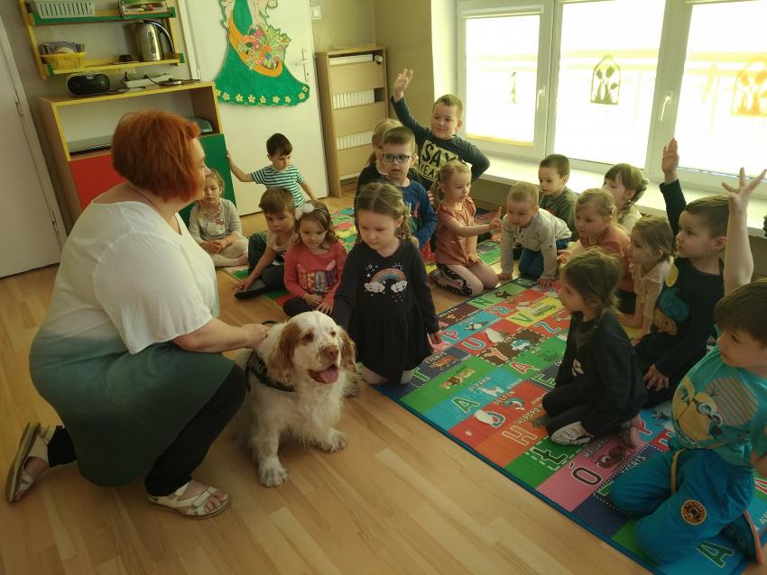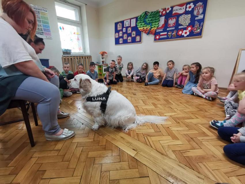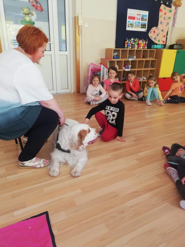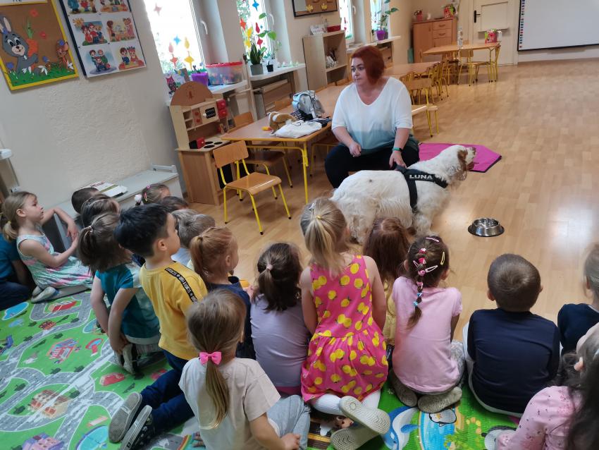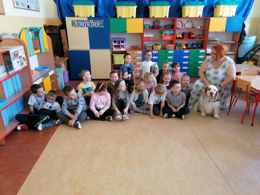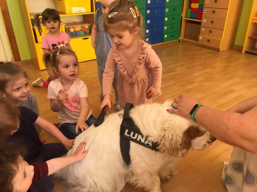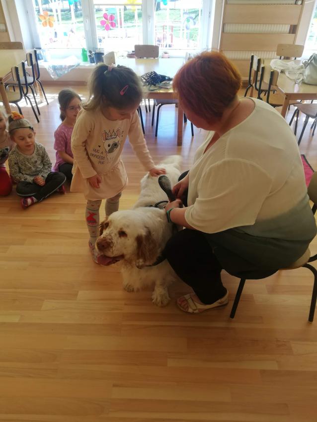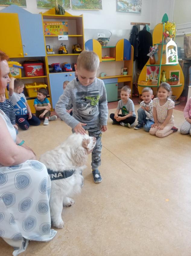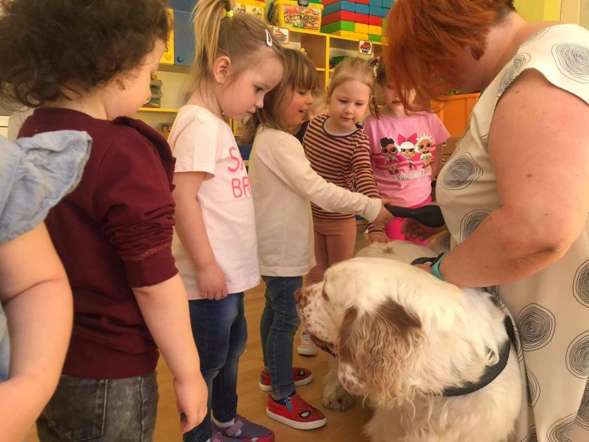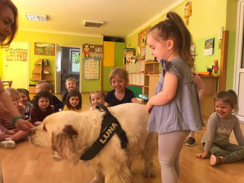 Realizując majowe zadania w ramach programu edukacyjno- wychowawczego „JESTEM BEZPIECZNY” dzieci miały niezwykłą okazję spotkać się z dogoterapeutą oraz przepięknym psem „Luną”. Przedszkolaki dowiedziały się jak należy zachowywać się w obecności psa, czego nie należy robić oraz jak należy dbać o czworonożnego przyjaciela. Oczywiście nie zabrakło prezentacji umiejętności „Luny” oraz chwili na którą wszyscy czekali- możliwości bezpośredniego kontaktu z pieskiem. Jednak to nie wszystkie zadania jakie wykonały dzieci. Nauczycielki zapoznały dzieci z opowiadaniem autorstwa P. Gabrysza „Zuzia i Nero”, zaprezentowały „pozycję żółwia” – najbezpieczniejszą pozycję, jaką należy przyjąć w przypadku ataku psa oraz prezentację multimedialną na temat wybranych zwierząt domowych, ich zwyczajów oraz prawidłowych sposobów opieki nad nimi.