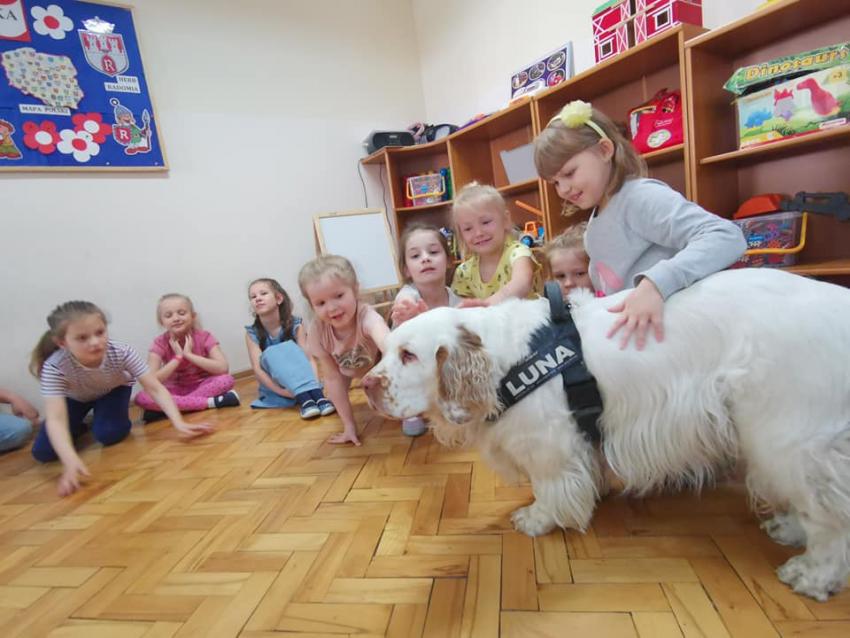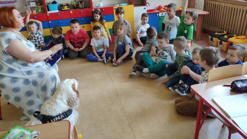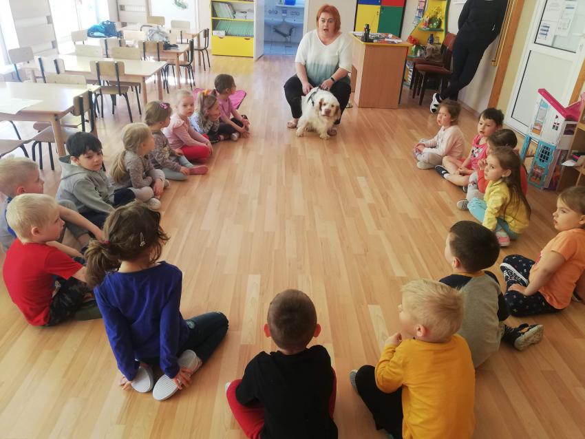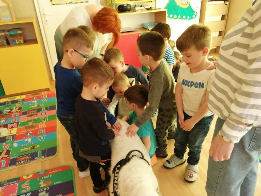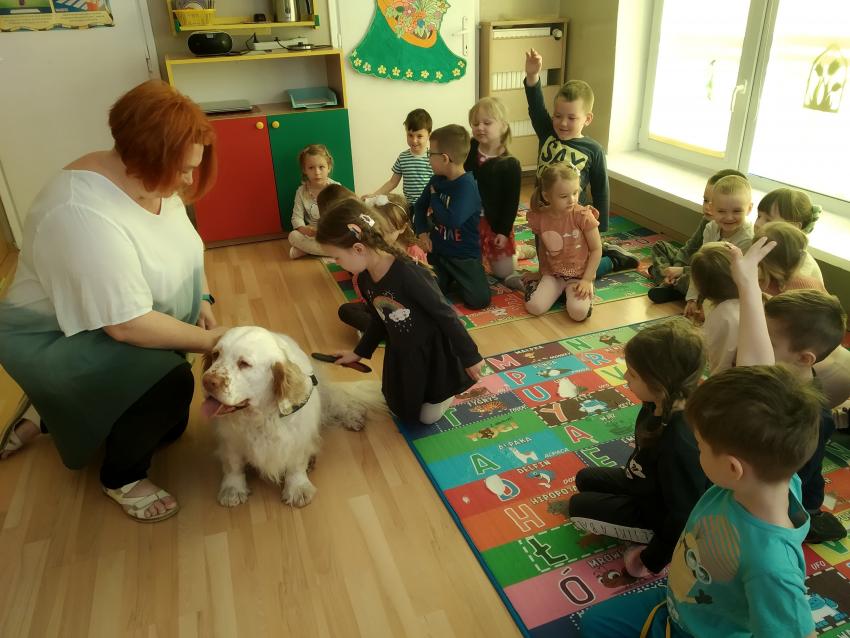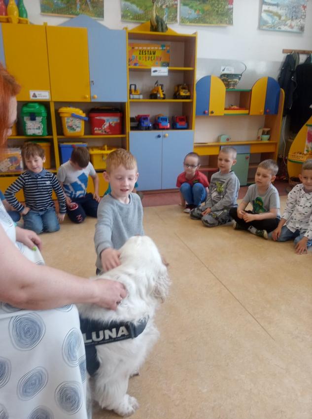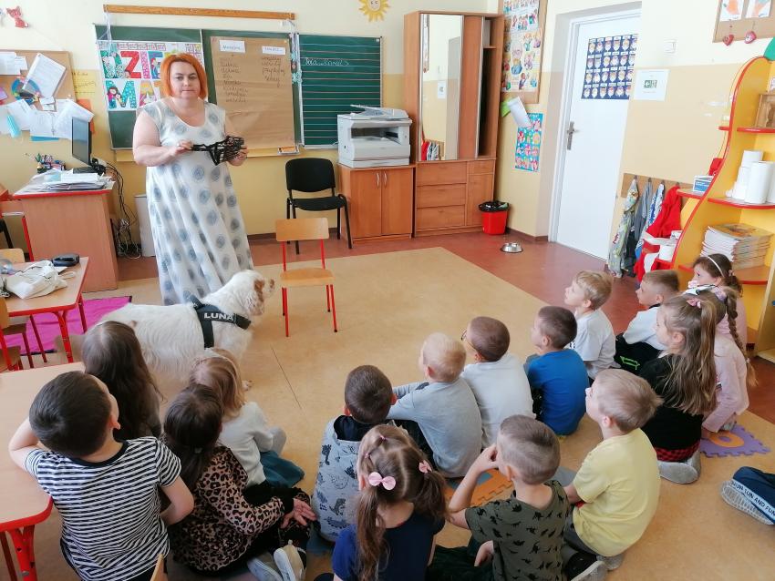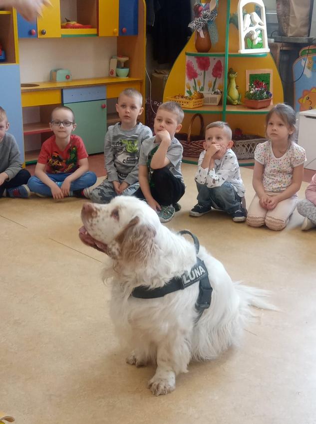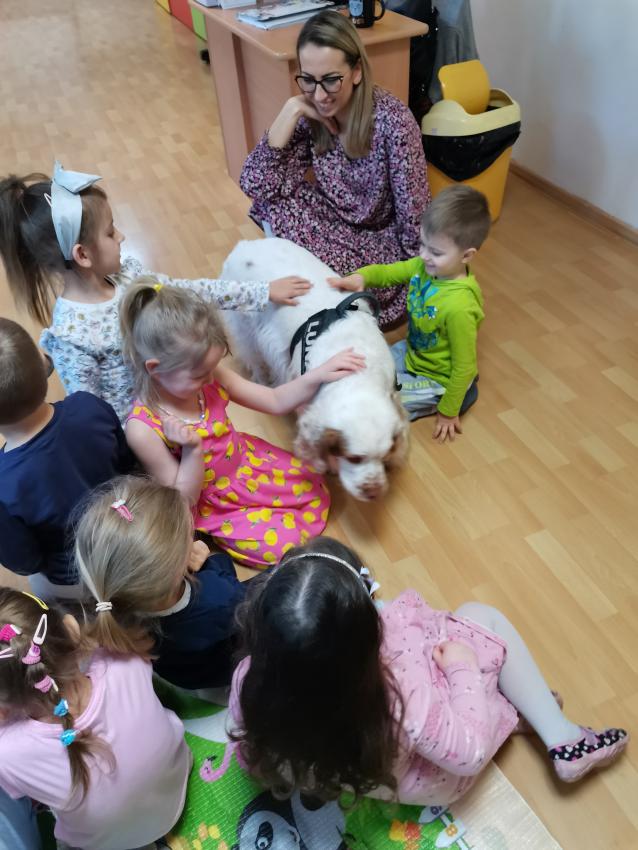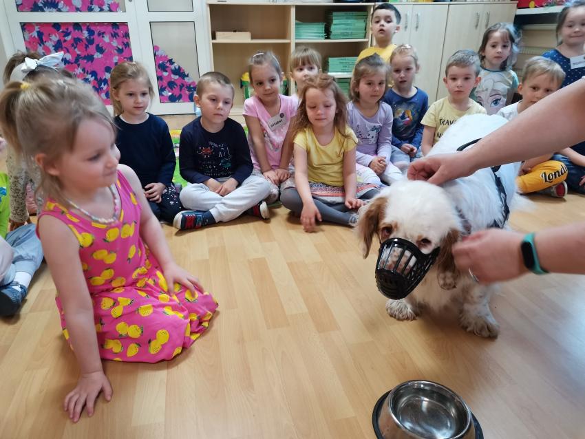 Realizując majowe zadania w ramach programu edukacyjno- wychowawczego „JESTEM BEZPIECZNY” dzieci miały niezwykłą okazję spotkać się z dogoterapeutą oraz przepięknym psem „Luną”. Przedszkolaki dowiedziały się jak należy zachowywać się w obecności psa, czego nie należy robić oraz jak należy dbać o czworonożnego przyjaciela. Oczywiście nie zabrakło prezentacji umiejętności „Luny” oraz chwili na którą wszyscy czekali- możliwości bezpośredniego kontaktu z pieskiem. Jednak to nie wszystkie zadania jakie wykonały dzieci. Nauczycielki zapoznały dzieci z opowiadaniem autorstwa P. Gabrysza „Zuzia i Nero”, zaprezentowały „pozycję żółwia” – najbezpieczniejszą pozycję, jaką należy przyjąć w przypadku ataku psa oraz prezentację multimedialną na temat wybranych zwierząt domowych, ich zwyczajów oraz prawidłowych sposobów opieki nad nimi.