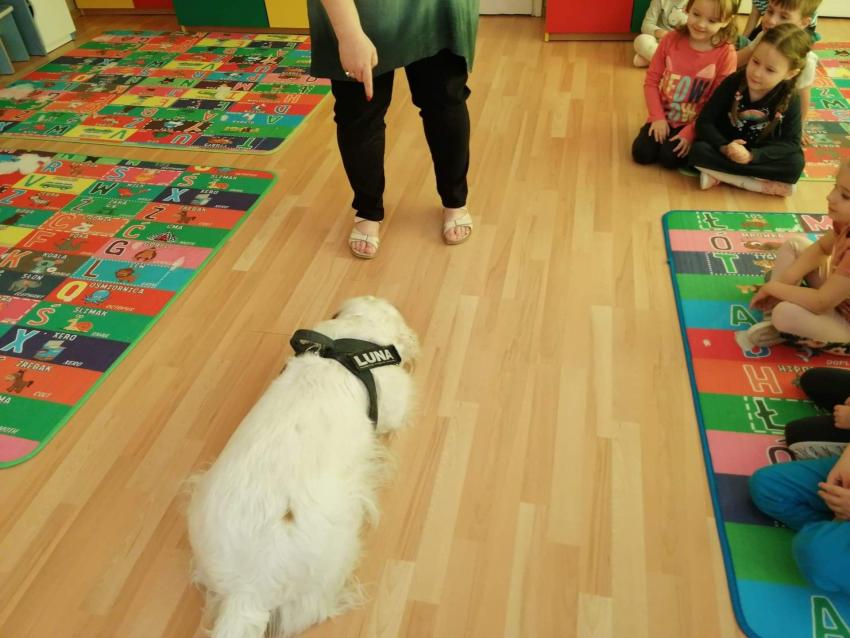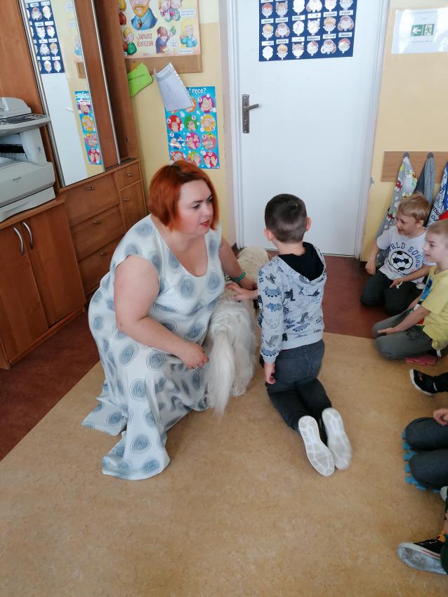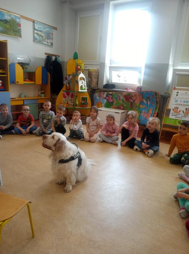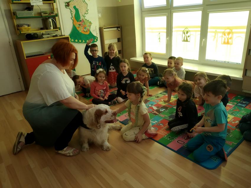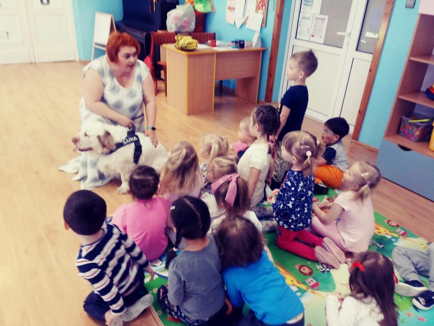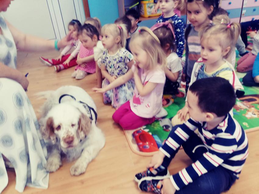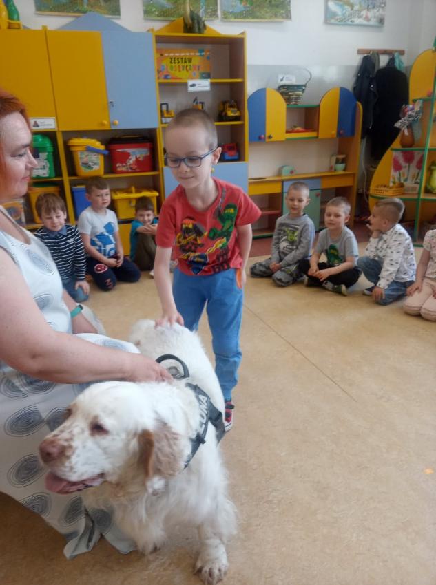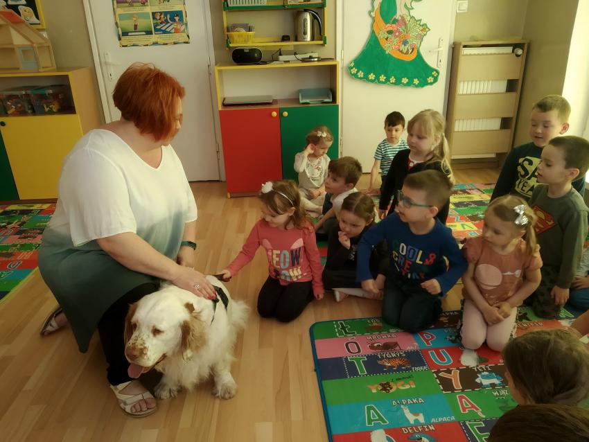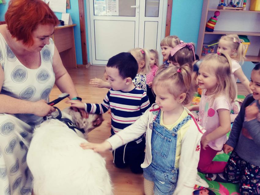 Realizując majowe zadania w ramach programu edukacyjno- wychowawczego „JESTEM BEZPIECZNY” dzieci miały niezwykłą okazję spotkać się z dogoterapeutą oraz przepięknym psem „Luną”. Przedszkolaki dowiedziały się jak należy zachowywać się w obecności psa, czego nie należy robić oraz jak należy dbać o czworonożnego przyjaciela. Oczywiście nie zabrakło prezentacji umiejętności „Luny” oraz chwili na którą wszyscy czekali- możliwości bezpośredniego kontaktu z pieskiem. Jednak to nie wszystkie zadania jakie wykonały dzieci. Nauczycielki zapoznały dzieci z opowiadaniem autorstwa P. Gabrysza „Zuzia i Nero”, zaprezentowały „pozycję żółwia” – najbezpieczniejszą pozycję, jaką należy przyjąć w przypadku ataku psa oraz prezentację multimedialną na temat wybranych zwierząt domowych, ich zwyczajów oraz prawidłowych sposobów opieki nad nimi.