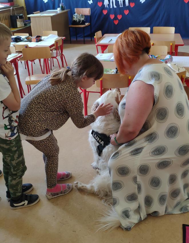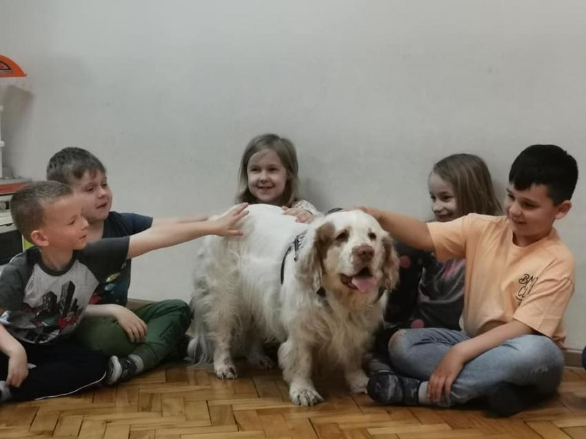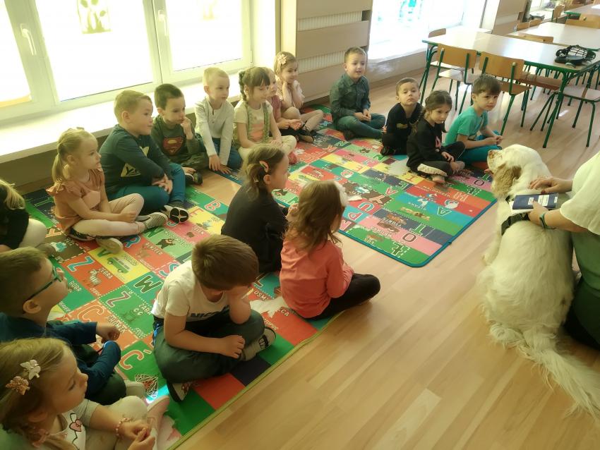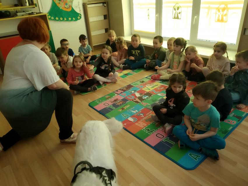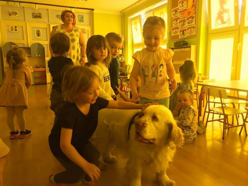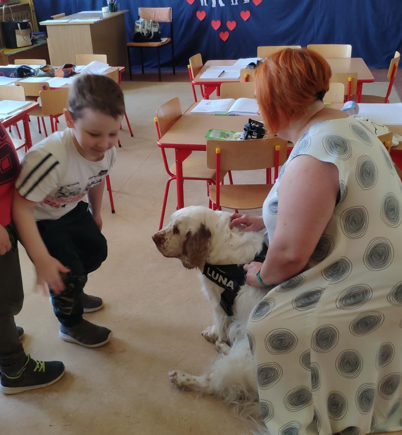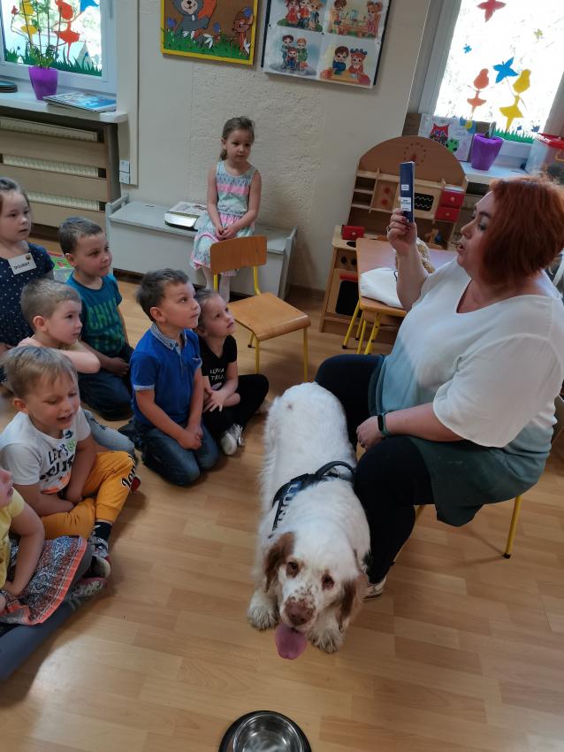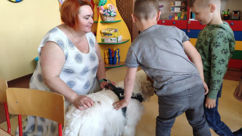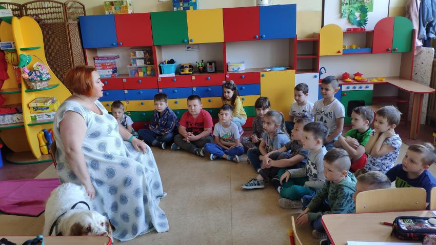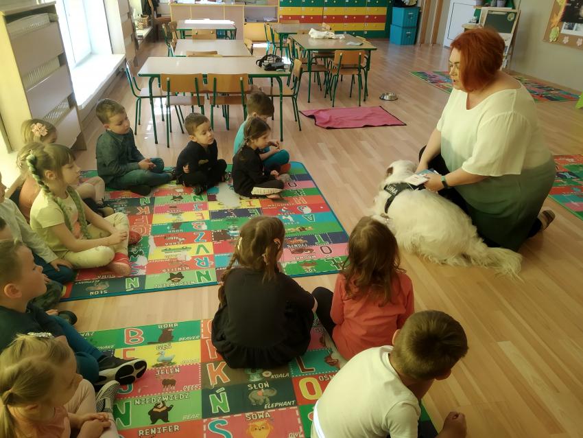 Realizując majowe zadania w ramach programu edukacyjno- wychowawczego „JESTEM BEZPIECZNY” dzieci miały niezwykłą okazję spotkać się z dogoterapeutą oraz przepięknym psem „Luną”. Przedszkolaki dowiedziały się jak należy zachowywać się w obecności psa, czego nie należy robić oraz jak należy dbać o czworonożnego przyjaciela. Oczywiście nie zabrakło prezentacji umiejętności „Luny” oraz chwili na którą wszyscy czekali- możliwości bezpośredniego kontaktu z pieskiem. Jednak to nie wszystkie zadania jakie wykonały dzieci. Nauczycielki zapoznały dzieci z opowiadaniem autorstwa P. Gabrysza „Zuzia i Nero”, zaprezentowały „pozycję żółwia” – najbezpieczniejszą pozycję, jaką należy przyjąć w przypadku ataku psa oraz prezentację multimedialną na temat wybranych zwierząt domowych, ich zwyczajów oraz prawidłowych sposobów opieki nad nimi.