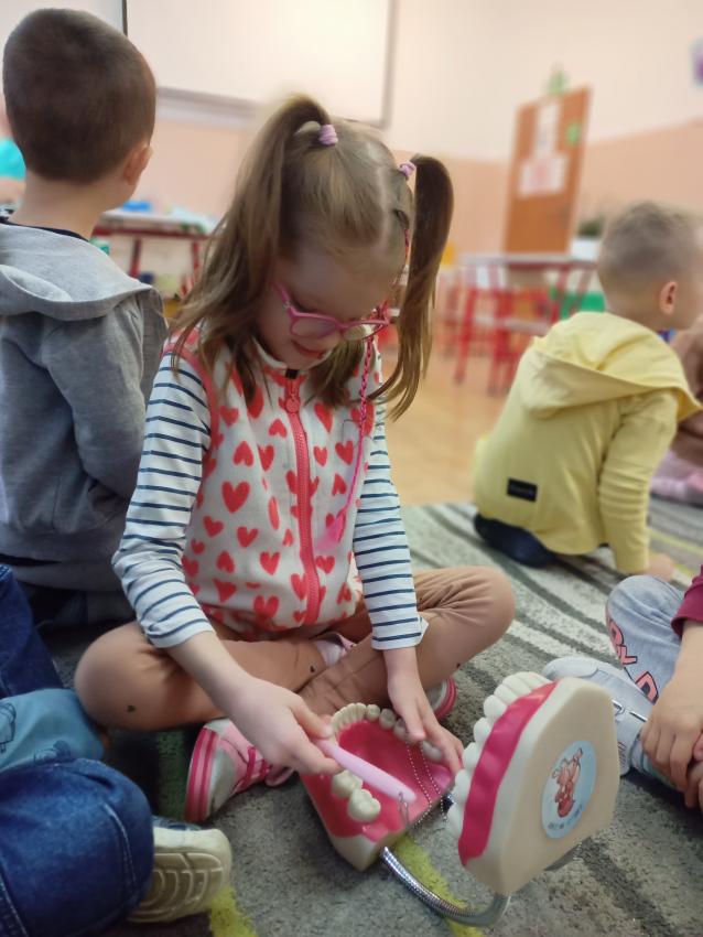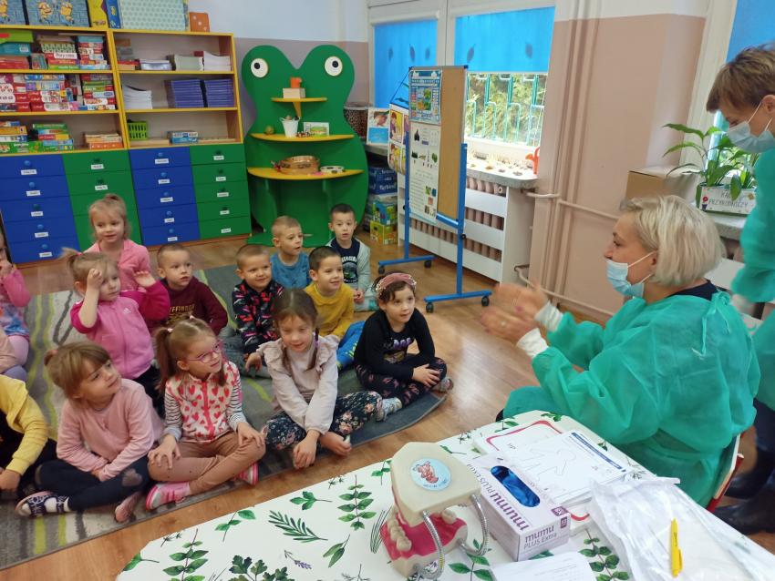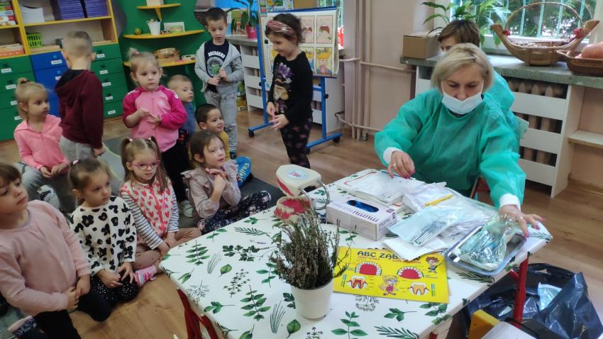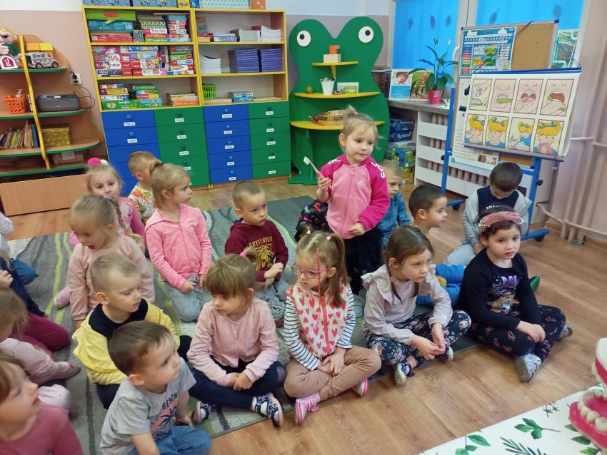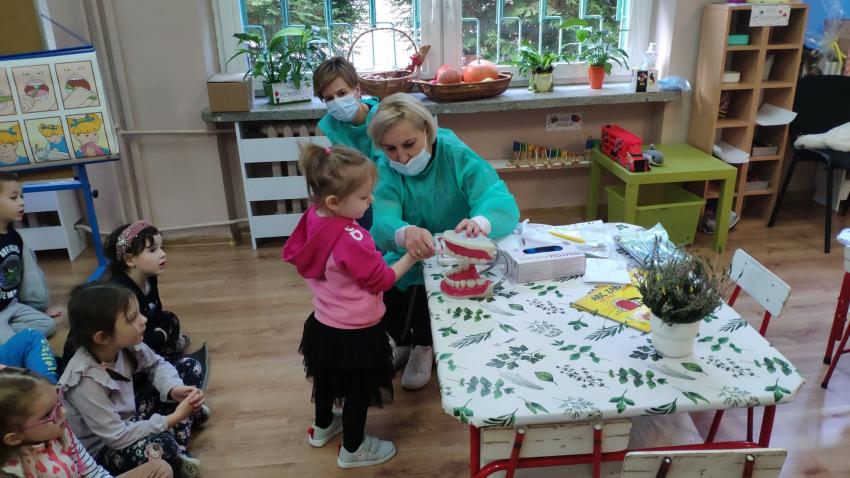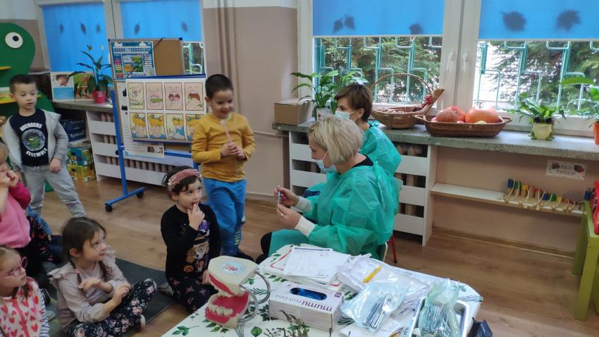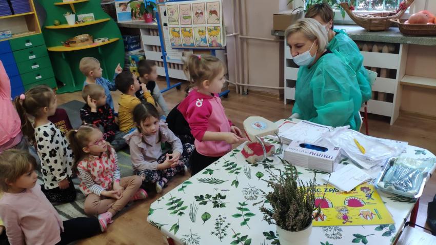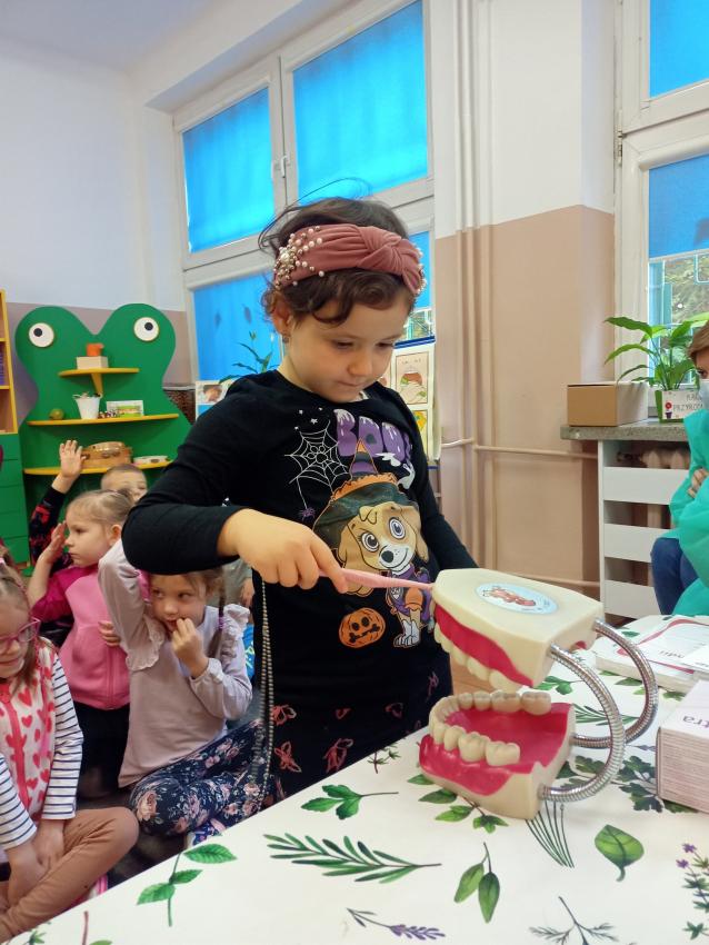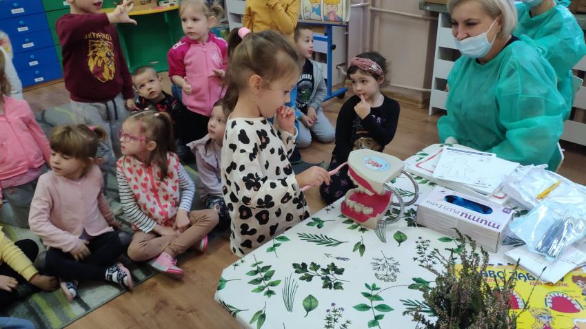 W dniu 14.10 dzieci z grupy Krasnoludków i Muchomorków uczestniczyły w spotkaniu z panią stomatolog. Podczas spotkania dzieci dowiedziały się jak dbać o zęby, zobaczyły w jaki sposób prawidłowo je myć oraz same przećwiczyły tą umiejętność. Nasze dzielne przedszkolaki bez strachu zasiadły przed panią stomatolog, która sprawdziła ząbki Krasnali i Muchomorków. W nagrodę dzieci otrzymały dyplomy ????.