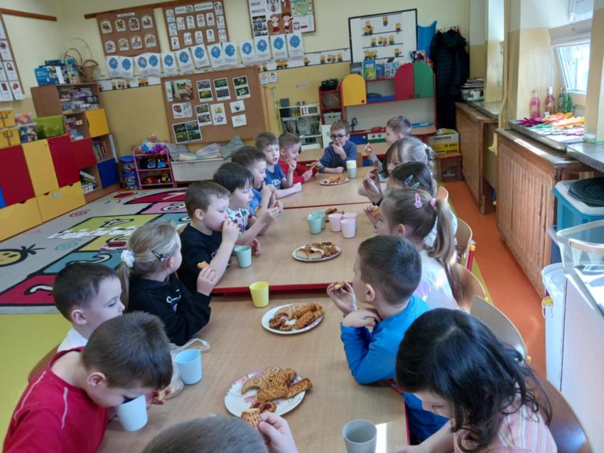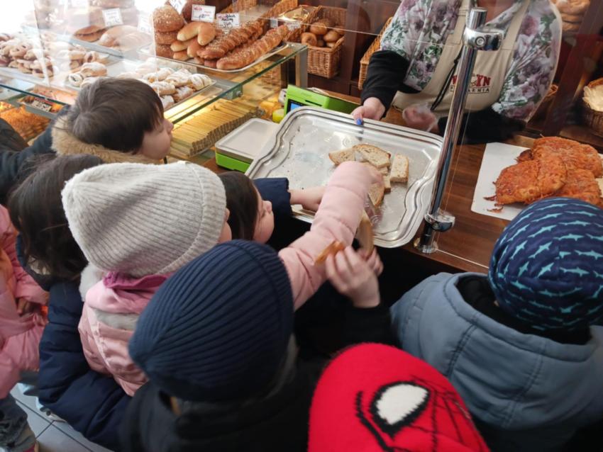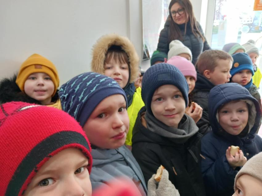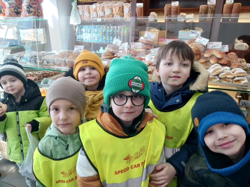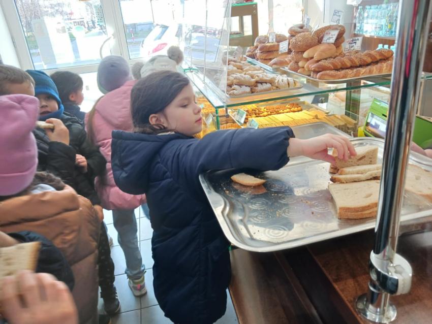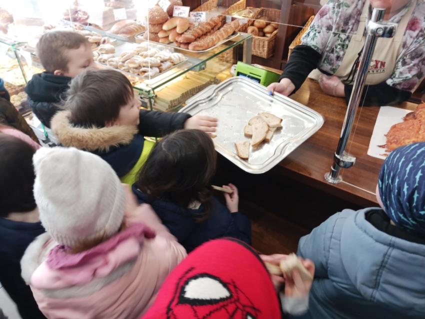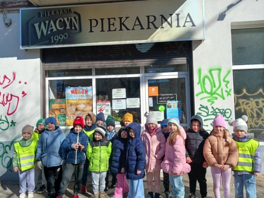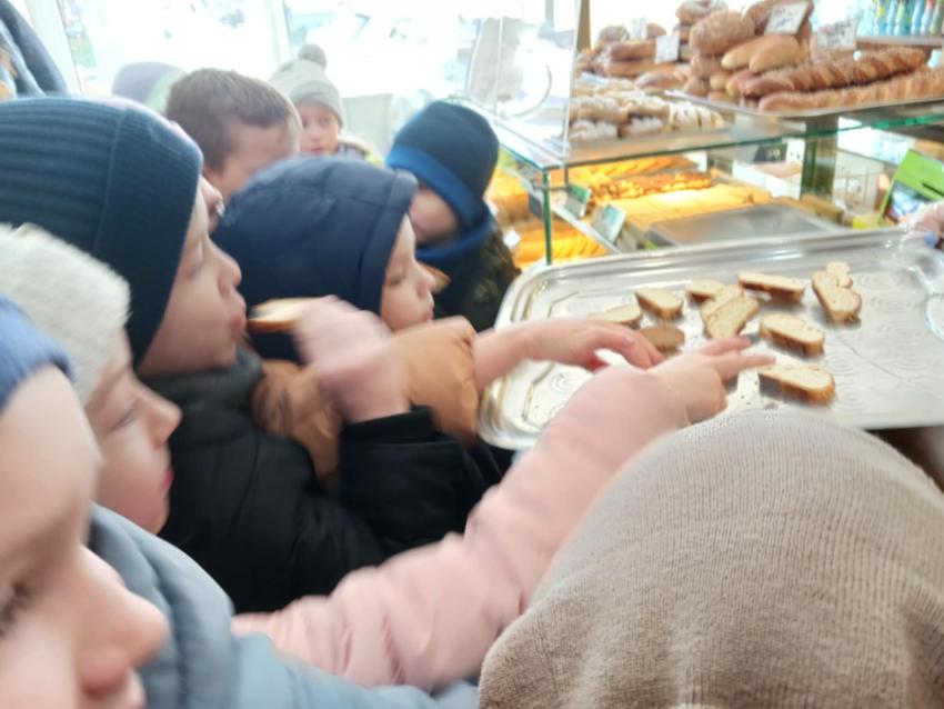 Dzisiaj tj. 19.03. 2025 dzieci z grupy Krasnoludki wybrały się na wizytę do pobliskiej cukiernio-piekarni WACYN, gdzie miały okazję poznać pracę pani ekspedientki.Obserwowały jak pani ekspedientka zachęca klientów do kupna chlebków i ciasteczek. Rozpoznawaly i podawaly prawidłowe nazwy pieczywa oraz innych artykułów tam znajdujących się. Dzieci mialy okazje obserwować sprawną obsługę klientów przychodzących po pieczywo i ciasteczka oraz mogły zapoznać się z elektroniczną wagą, z której odczytywały wagę towaru i obserwowały płacenie za zakupione rzeczy różnymi środkami płatniczymi: gotówką i kartą płatniczą. Dzieci były poczęstowane przez panią ekspedientkę chlebkiem i słodką bułeczką. Wszystko dzieciom bardzo smakowało. W sali dzieci miały degustację ciasteczek kupionych w cukiernio-piekarni. Wszystko rozeszło się bardzo szybko.