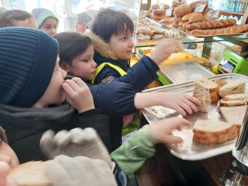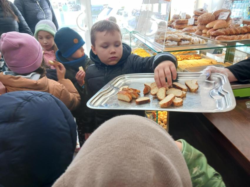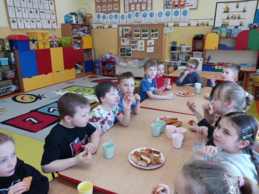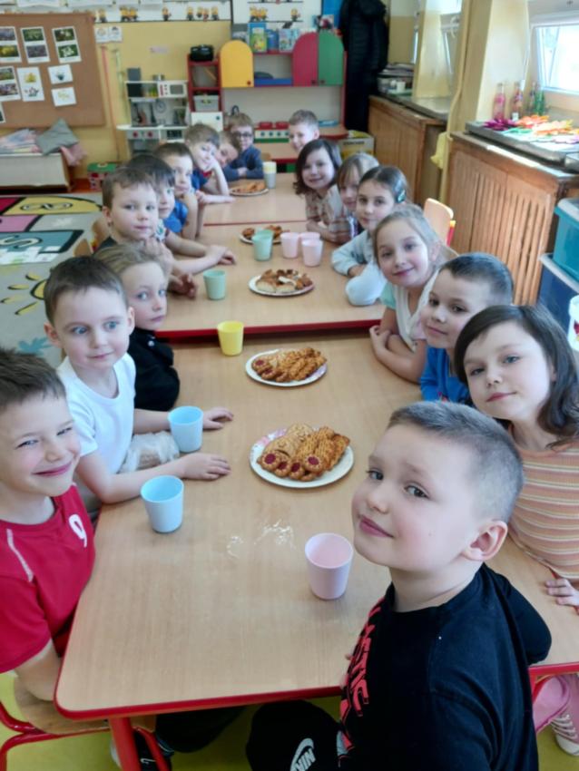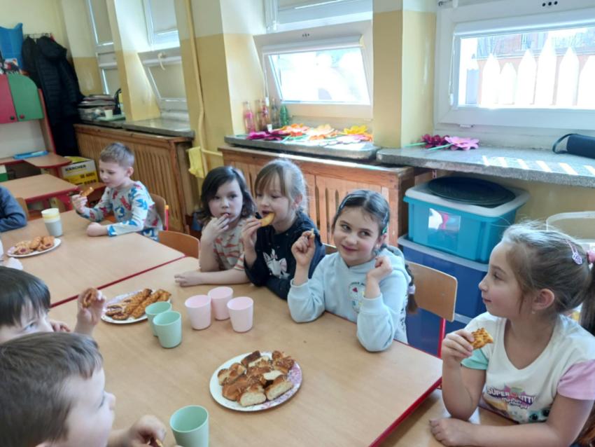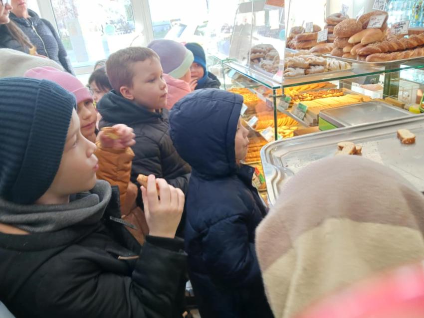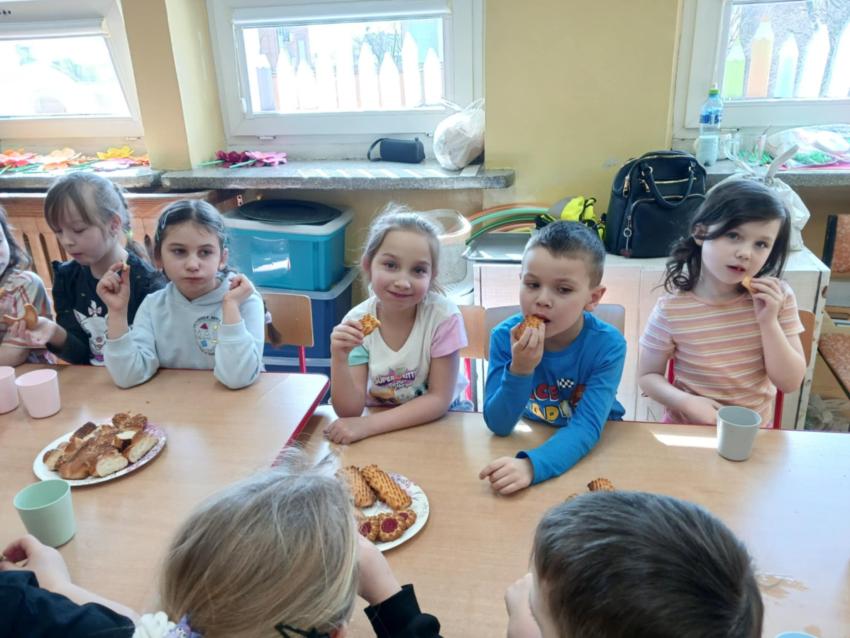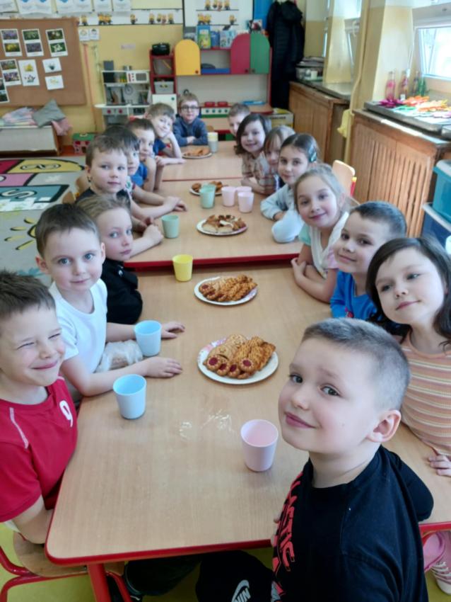 Dzisiaj tj. 19.03. 2025 dzieci z grupy Krasnoludki wybrały się na wizytę do pobliskiej cukiernio-piekarni WACYN, gdzie miały okazję poznać pracę pani ekspedientki.Obserwowały jak pani ekspedientka zachęca klientów do kupna chlebków i ciasteczek. Rozpoznawaly i podawaly prawidłowe nazwy pieczywa oraz innych artykułów tam znajdujących się. Dzieci mialy okazje obserwować sprawną obsługę klientów przychodzących po pieczywo i ciasteczka oraz mogły zapoznać się z elektroniczną wagą, z której odczytywały wagę towaru i obserwowały płacenie za zakupione rzeczy różnymi środkami płatniczymi: gotówką i kartą płatniczą. Dzieci były poczęstowane przez panią ekspedientkę chlebkiem i słodką bułeczką. Wszystko dzieciom bardzo smakowało. W sali dzieci miały degustację ciasteczek kupionych w cukiernio-piekarni. Wszystko rozeszło się bardzo szybko.