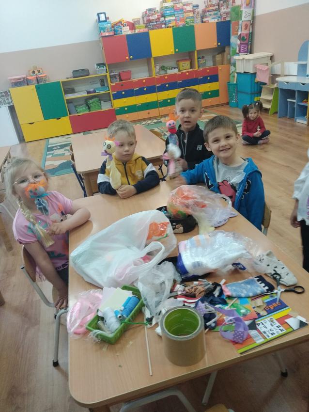- grupa IV wykonała zadanie: „Wesoła skarpetka/rękawiczka"- wykonanie pacynki, maskotki, zabawki.