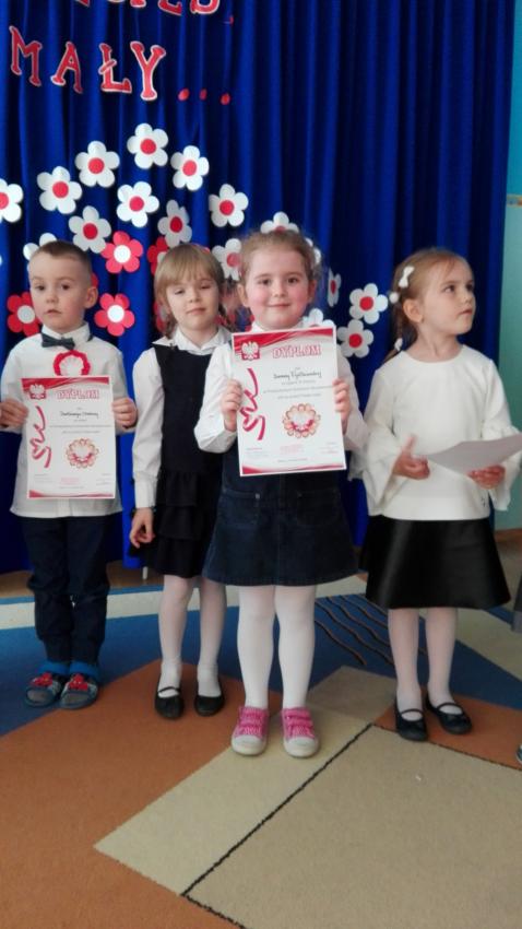 Dzieci śpiewały utwory znane nam wszystkim. Usłyszeliśmy piękne pieśni żołnierskie m.in. "Piechota", "Wojenko, wojenko", Płynie Wisła, płynie", "Legiony", "Przybyli ułani", "Rozkwitały pąki białych róż". Przedszkolaki wystapiły w dwóch kategoriach wiekowych: 3,4 -latki i 5,6 -latki. Wszyscy uczestnicy otrzymali pamiątkowe dyplomy.