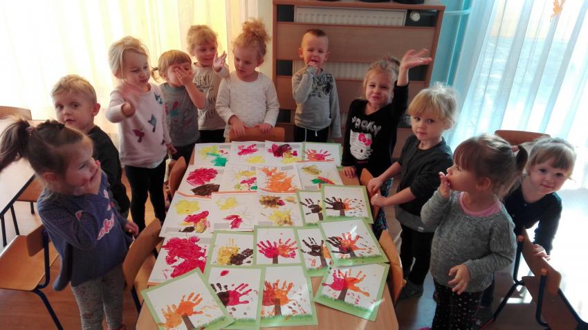 "Myszki" uwielbiają malować farbami! Oprócz pomalowania liści, odbijaliśmy nasze dłonie tak, aby "jesienne drzewa" wyszły pięknie. I wygląda na to, że nam się udało:) Potem wybraliśmy się na spacer.